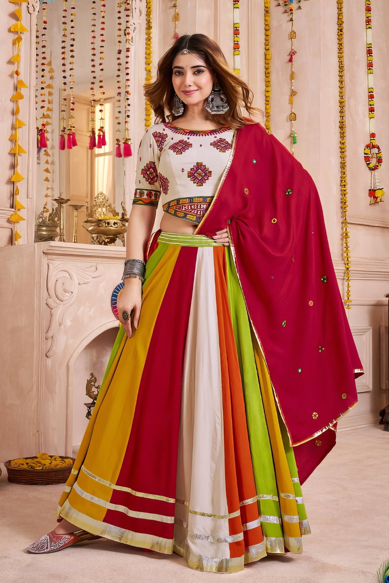 Lehenga is stitched at 40" length with a 42" waist and 9.5-meter flair. Blouse is size M (38"), customizable up to 44". Please check the size chart before ordering.
