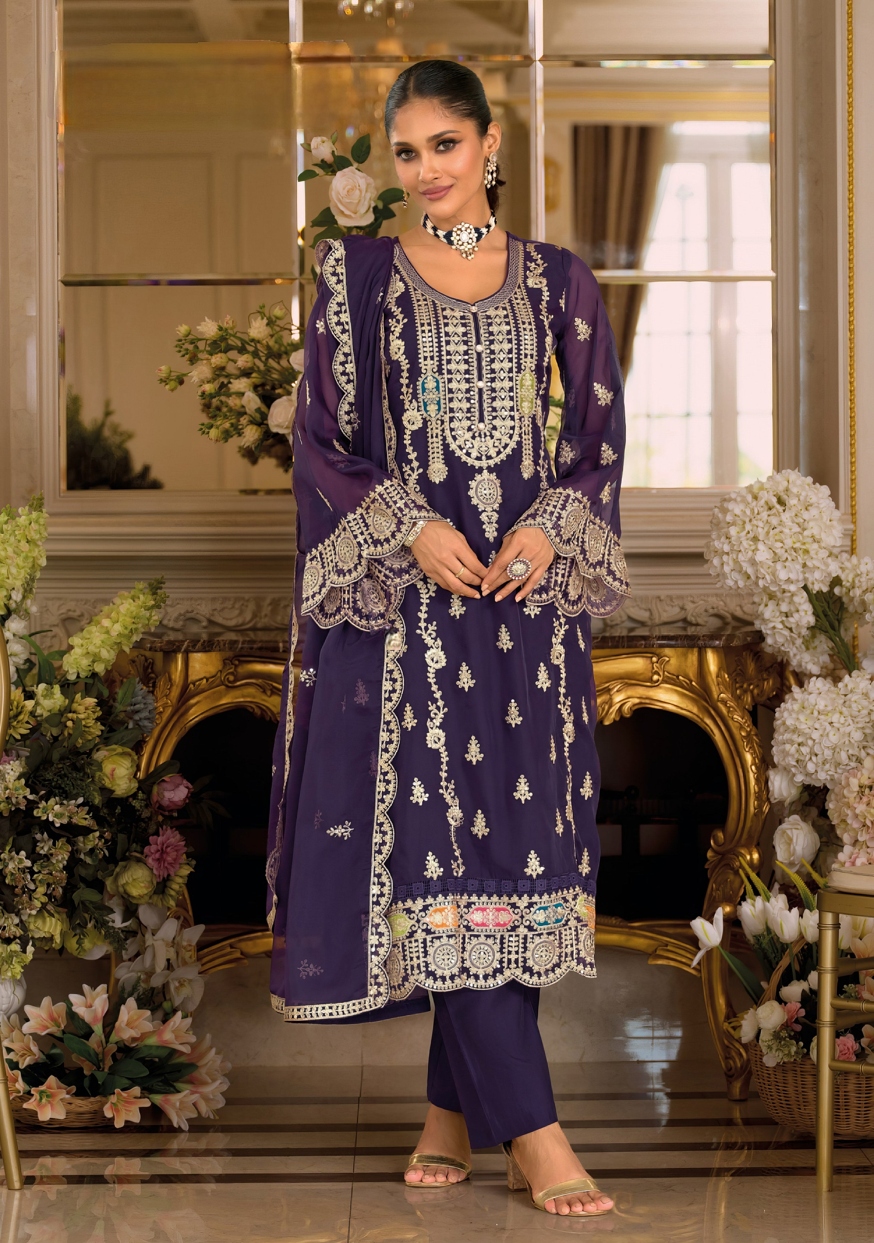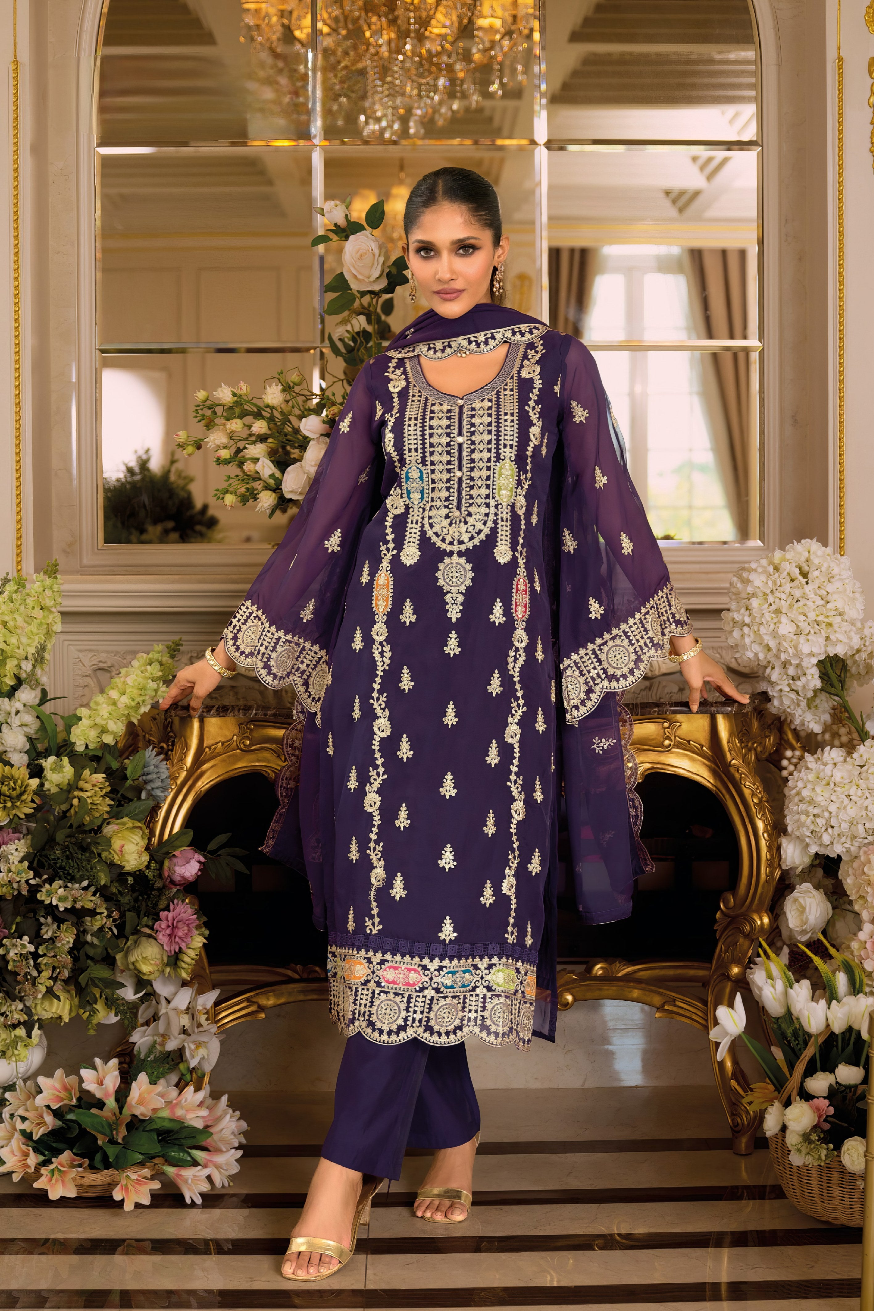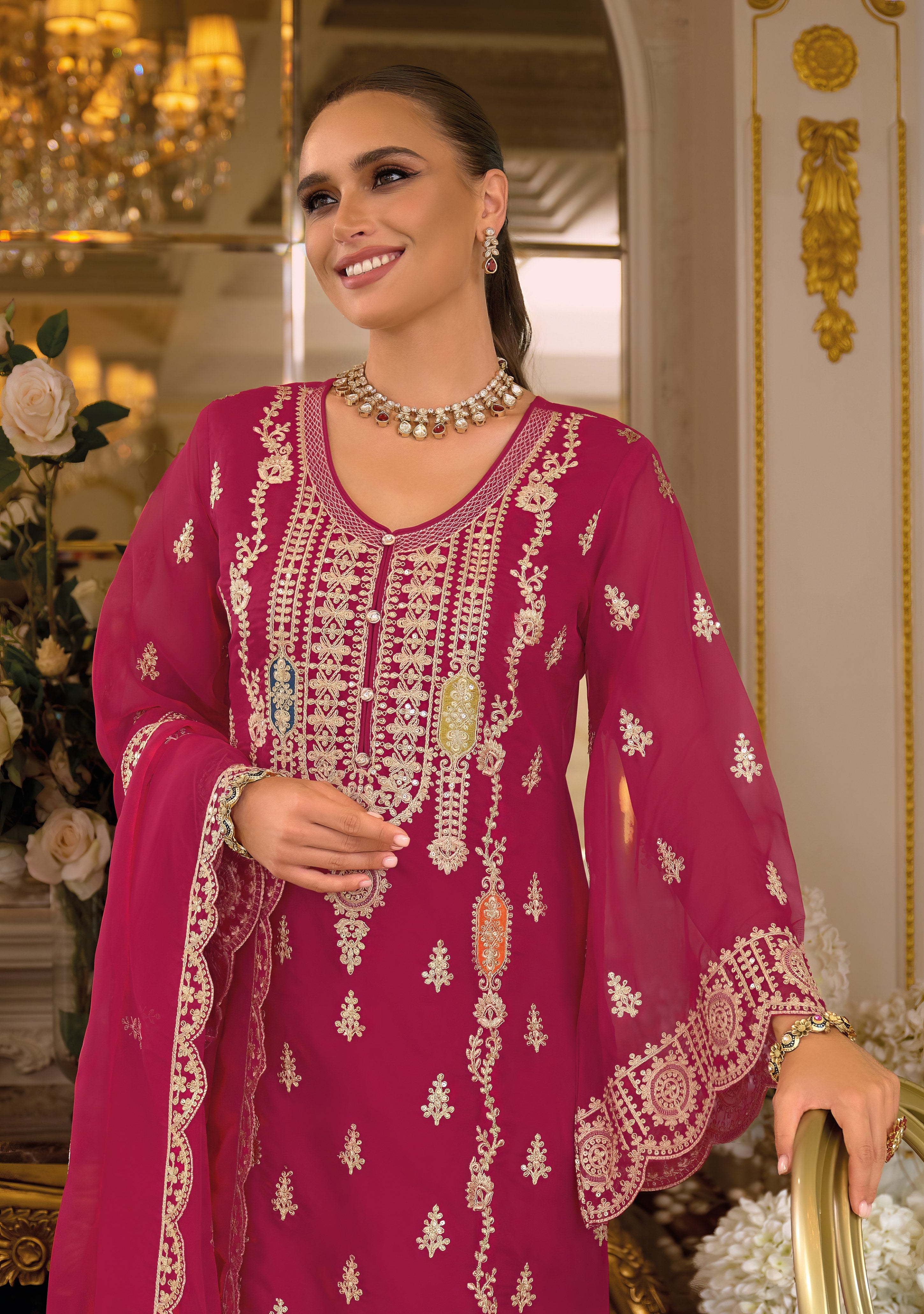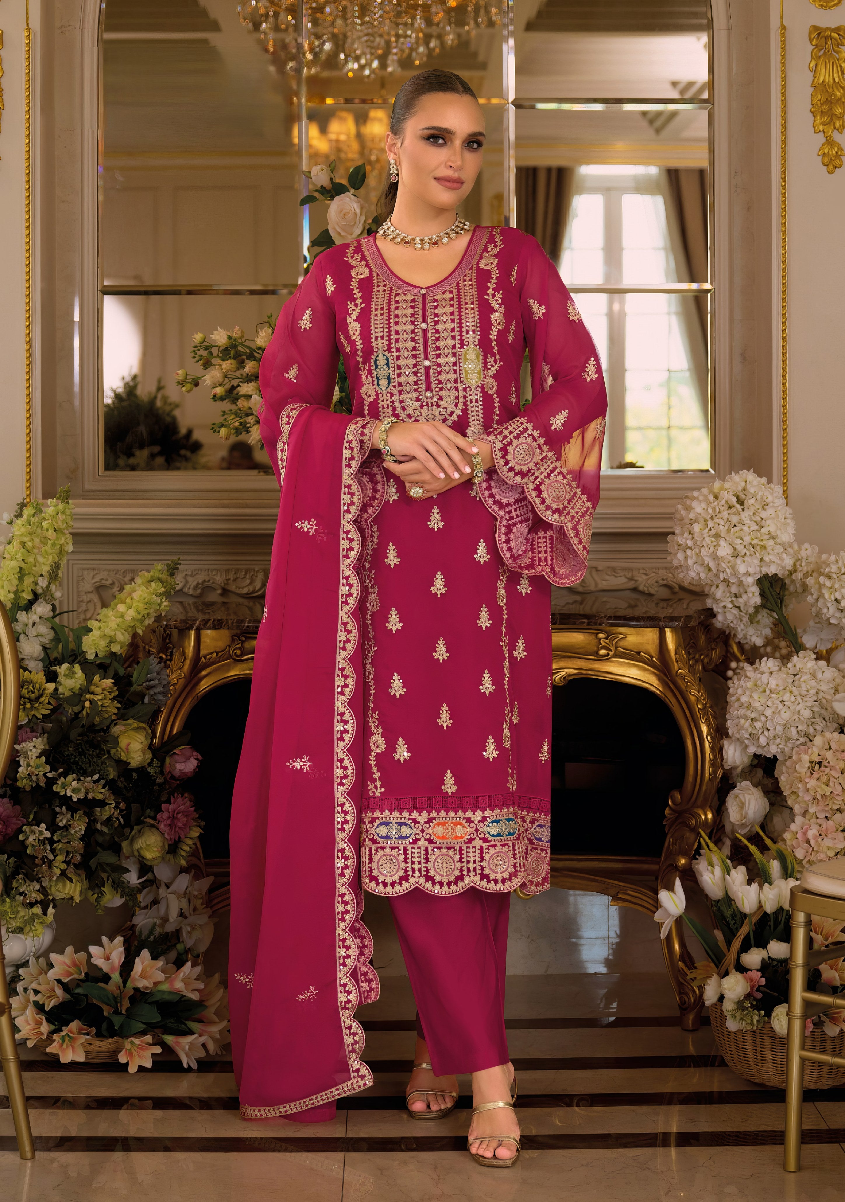 The Praniti set is designed in luxurious fabrics that blend grace with elegance. The soft organza top is adorned with fine embroidery, offering a delicate yet sophisticated look. The heavy silk bottom provides structure and richness to the outfit. Completing the ensemble is a soft organza dupatta with embroidery, adding charm and refinement to the overall appeal.