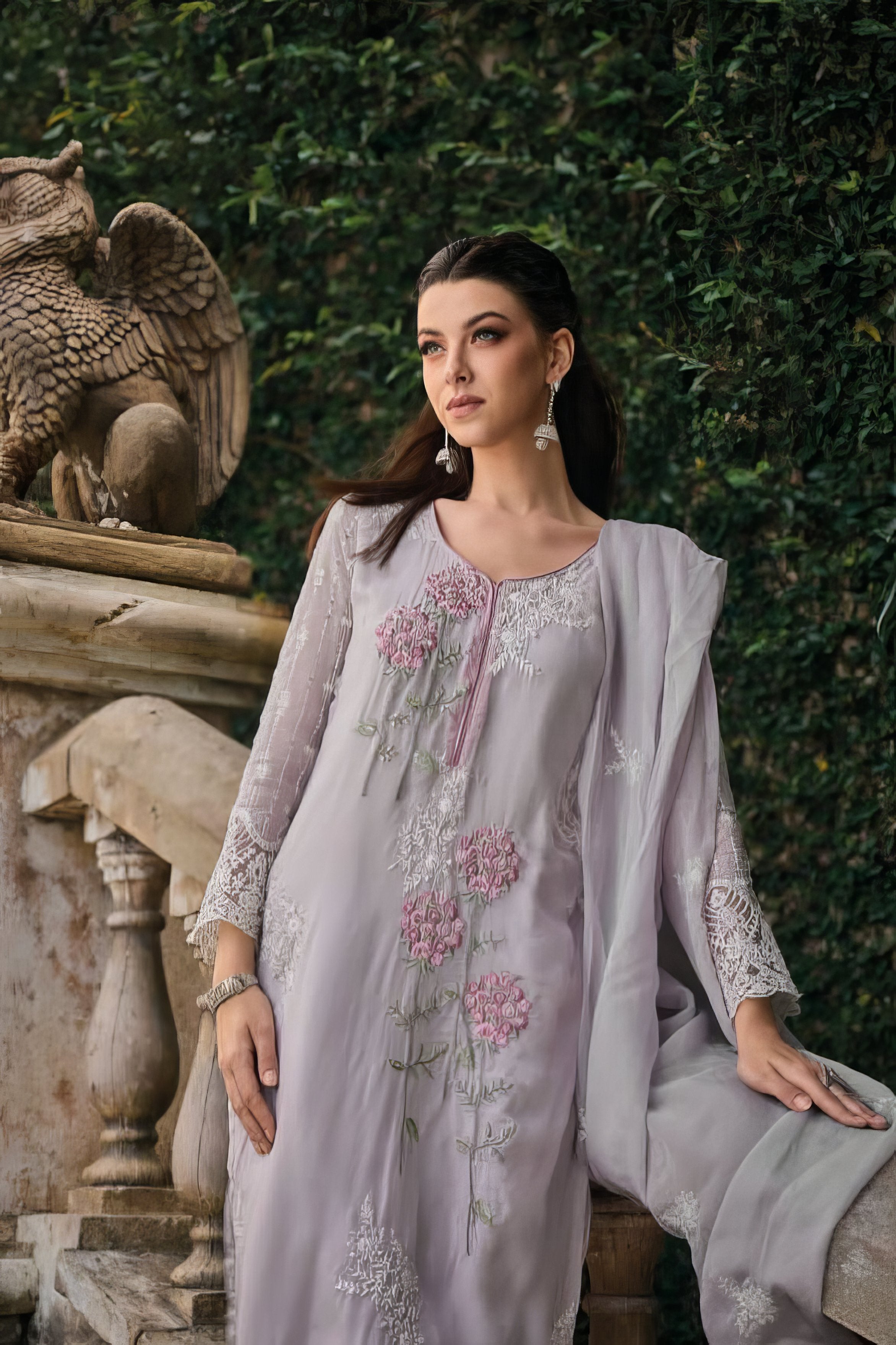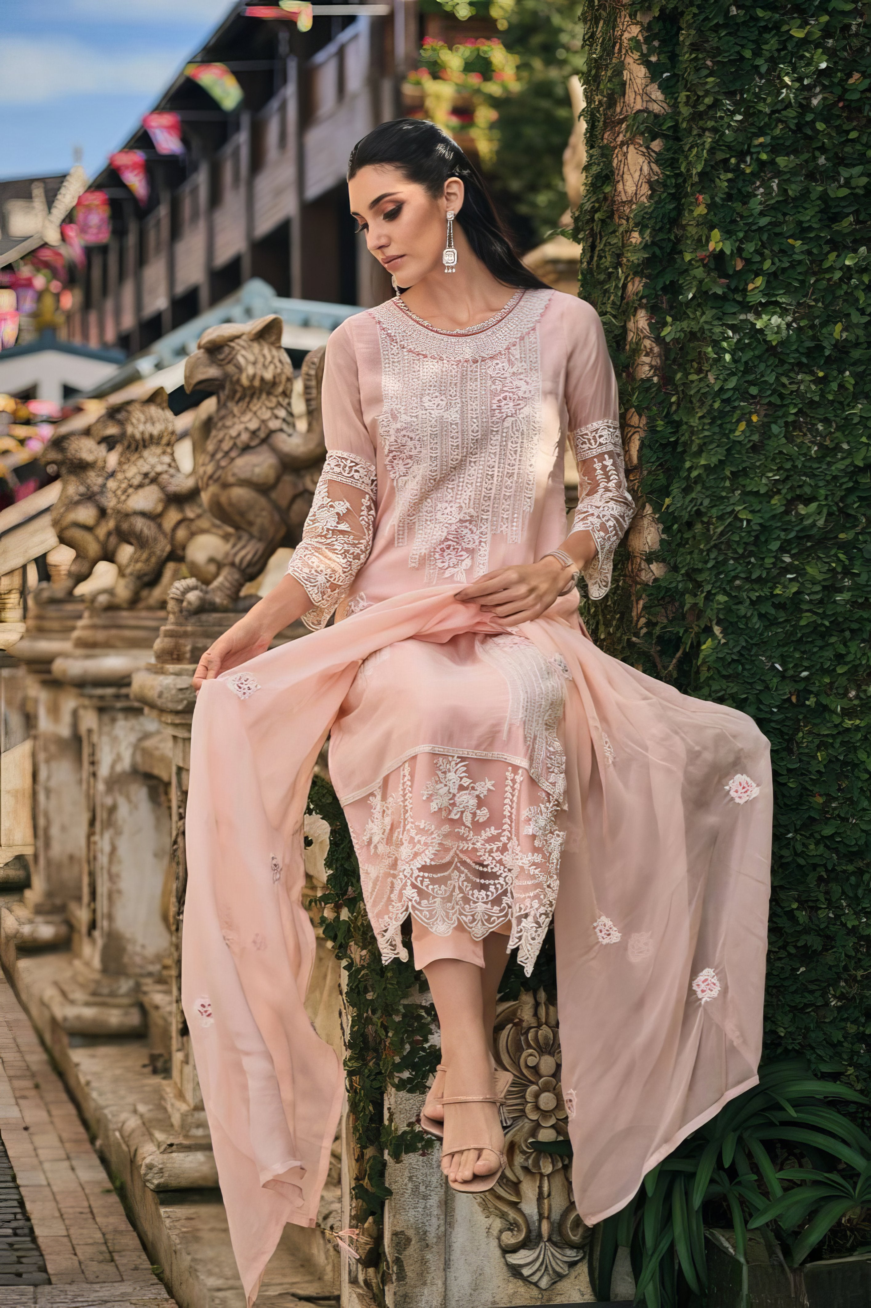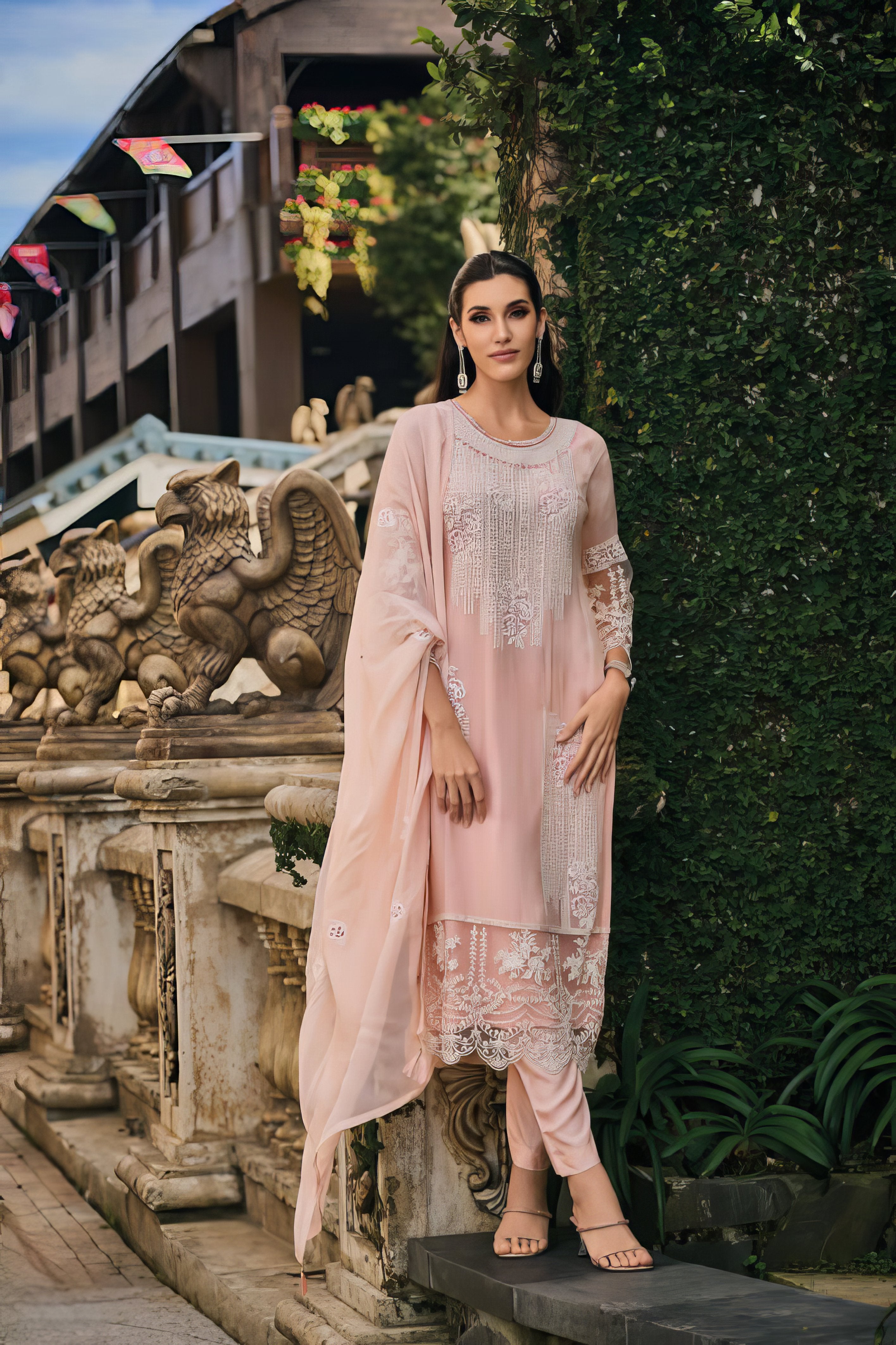 This elegant set is crafted from luxurious chinon fabric highlighted with intricate embroidery. The heavy chinon top showcases detailed embroidery that adds richness to the outfit. The pant, designed in chinon with fine embroidery, offers both style and comfort. Completing the look is a beautifully embroidered heavy chinon dupatta, giving the set a refined and graceful finish.