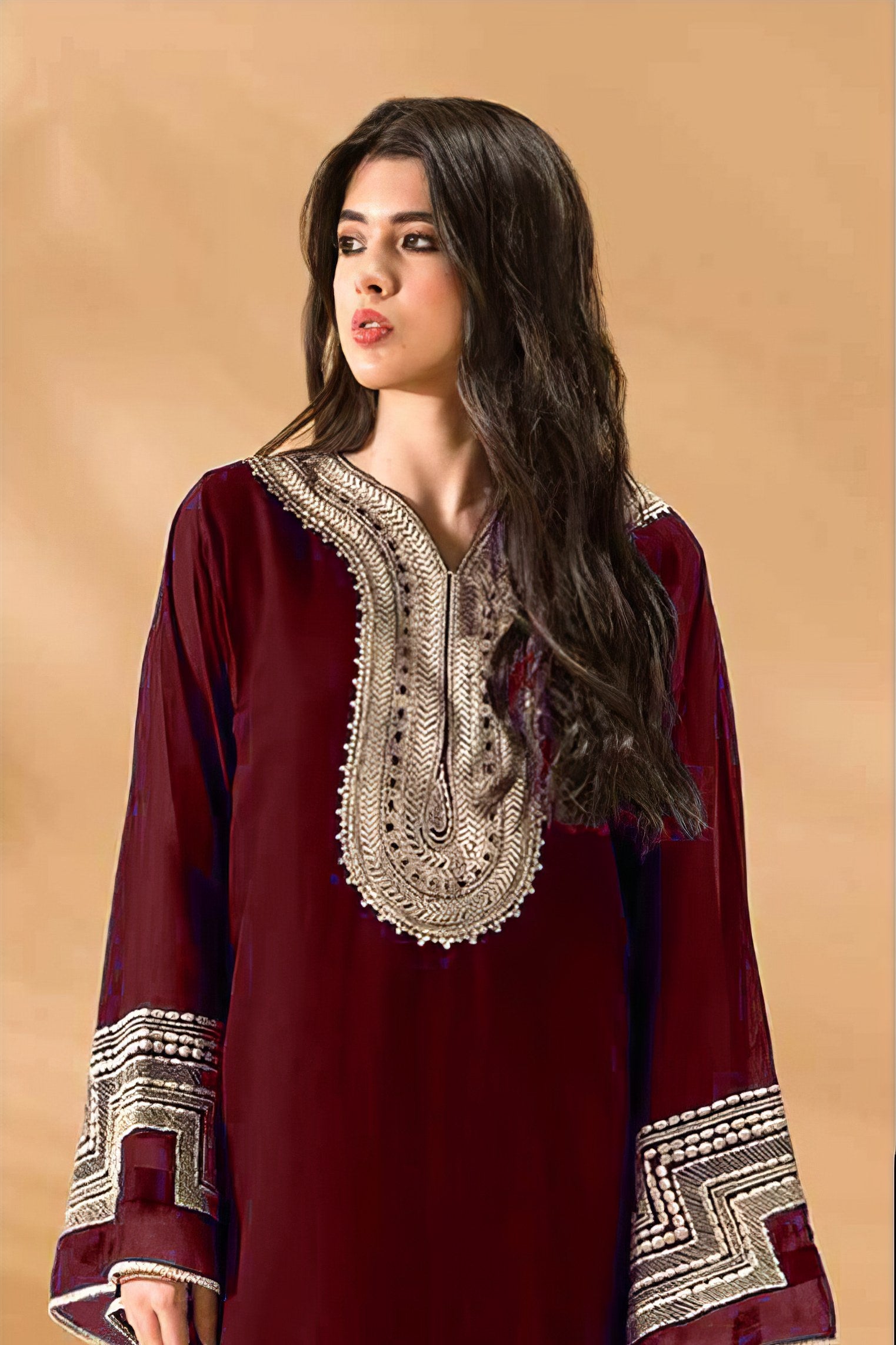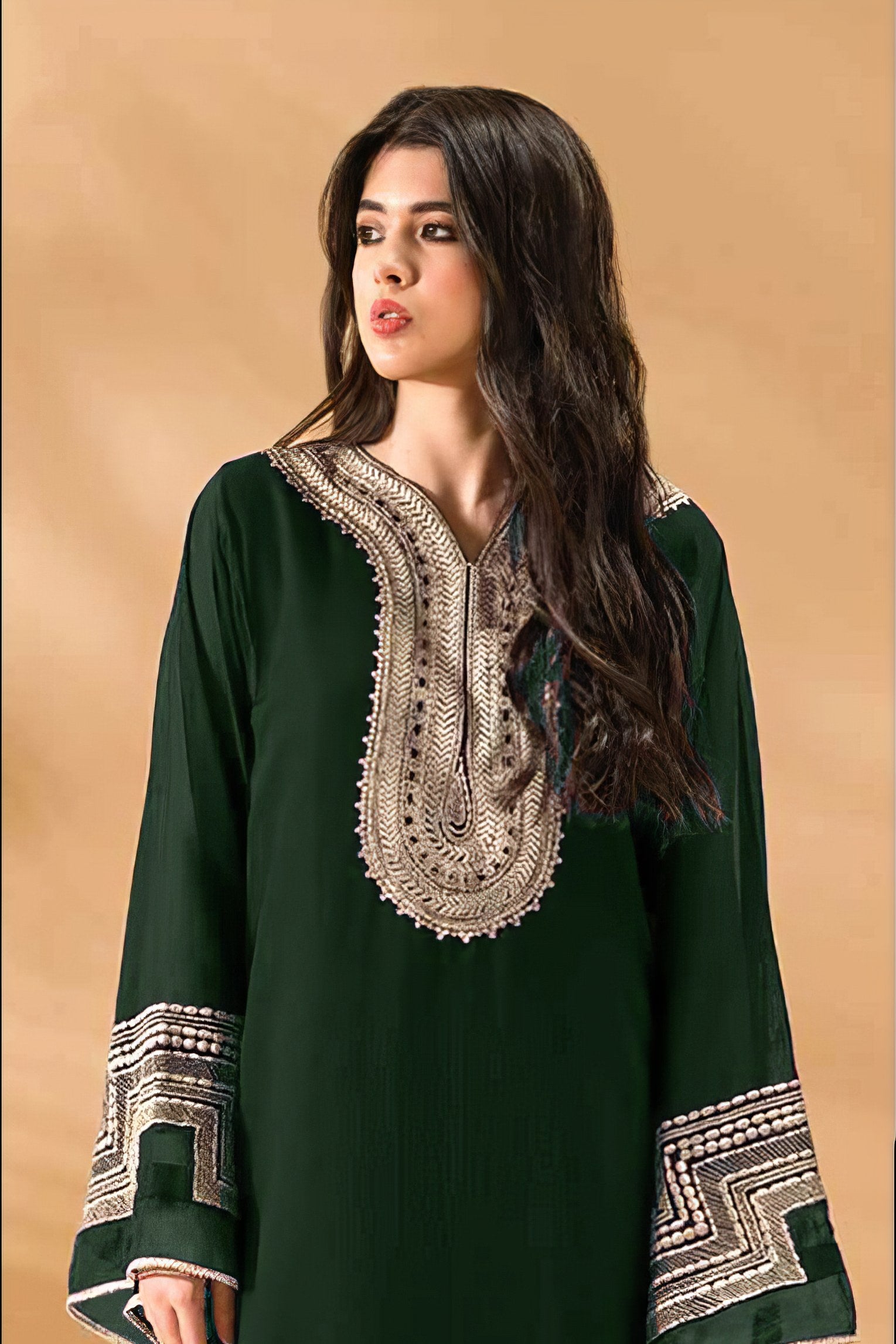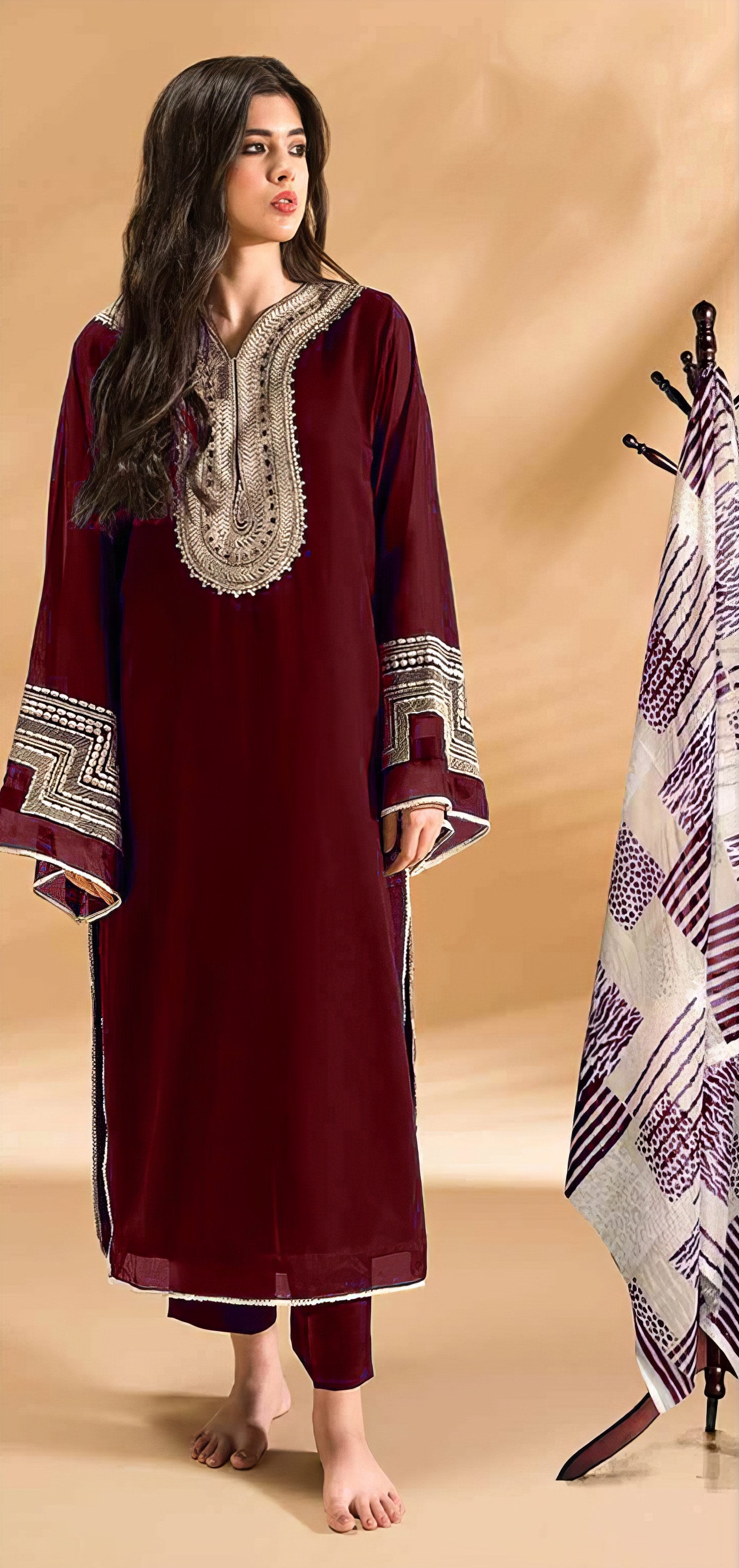 perfect fusion of modest elegance and modern flair, this Pakistani-style suit is crafted for effortless sophistication in every stitch.