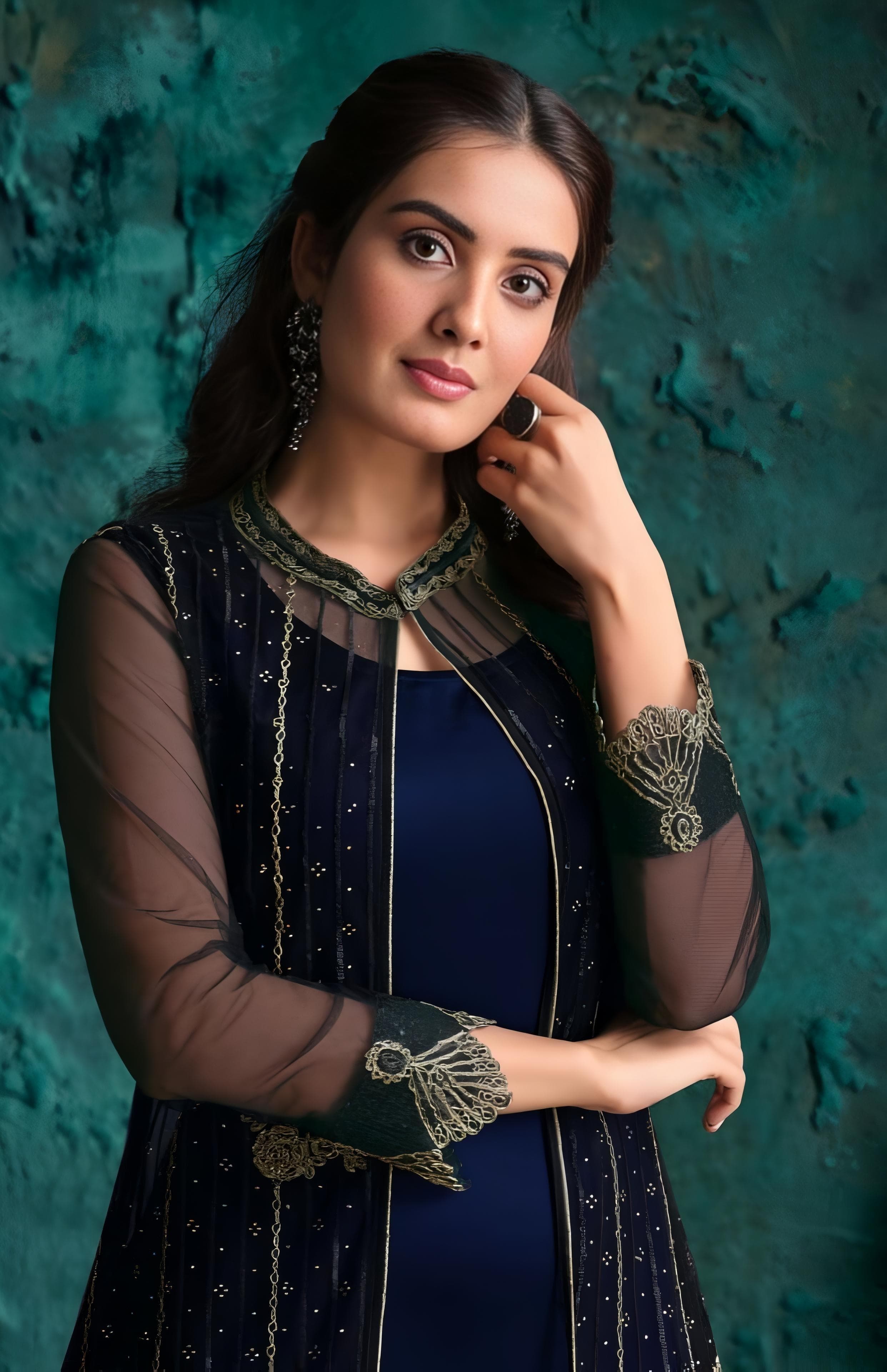 Crafted from Heavy Vaishnavi Net, the top is adorned with intricate embroidery, fine coding work, and sparkling stone highlights, creating a regal and refined look.