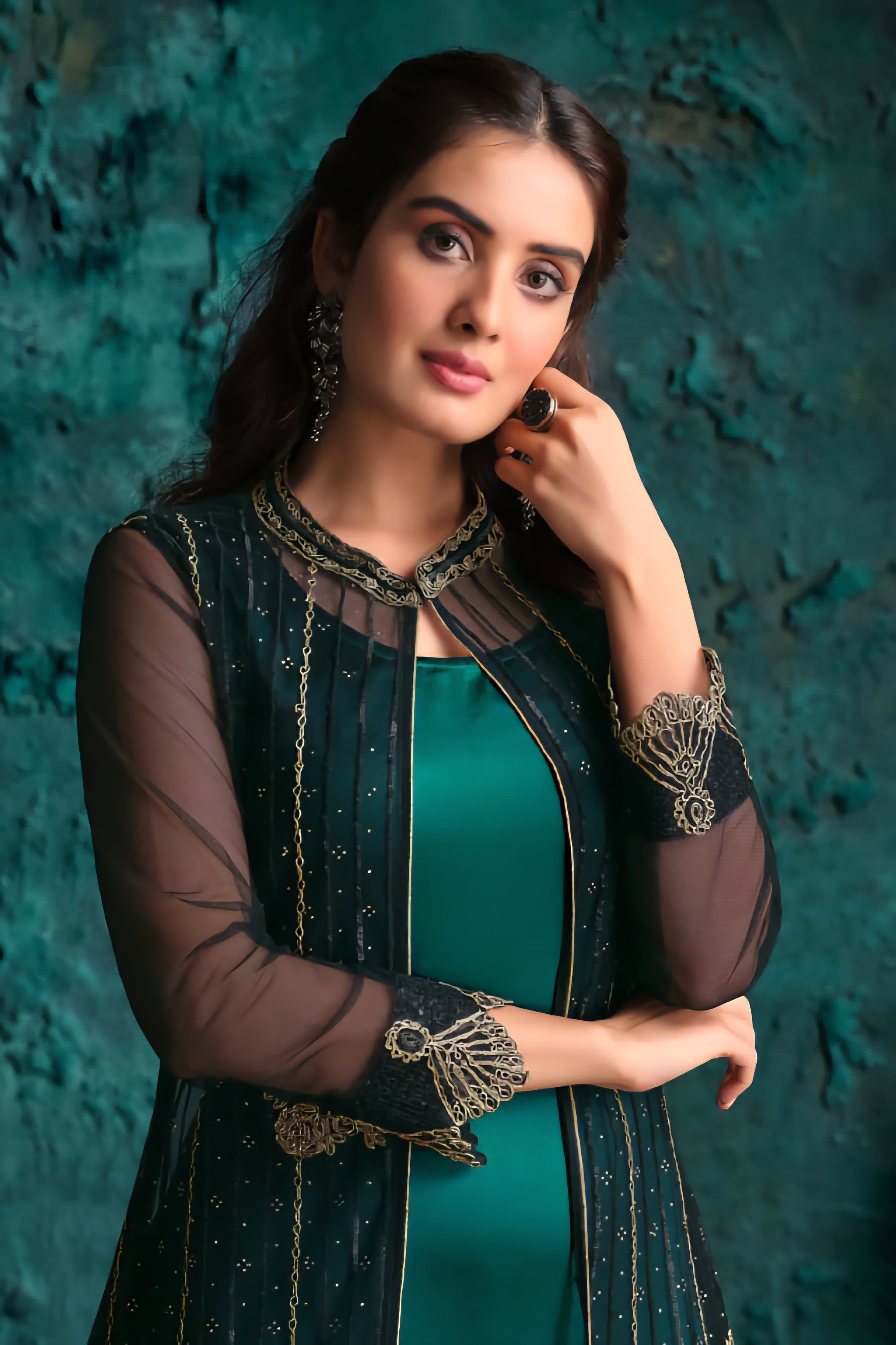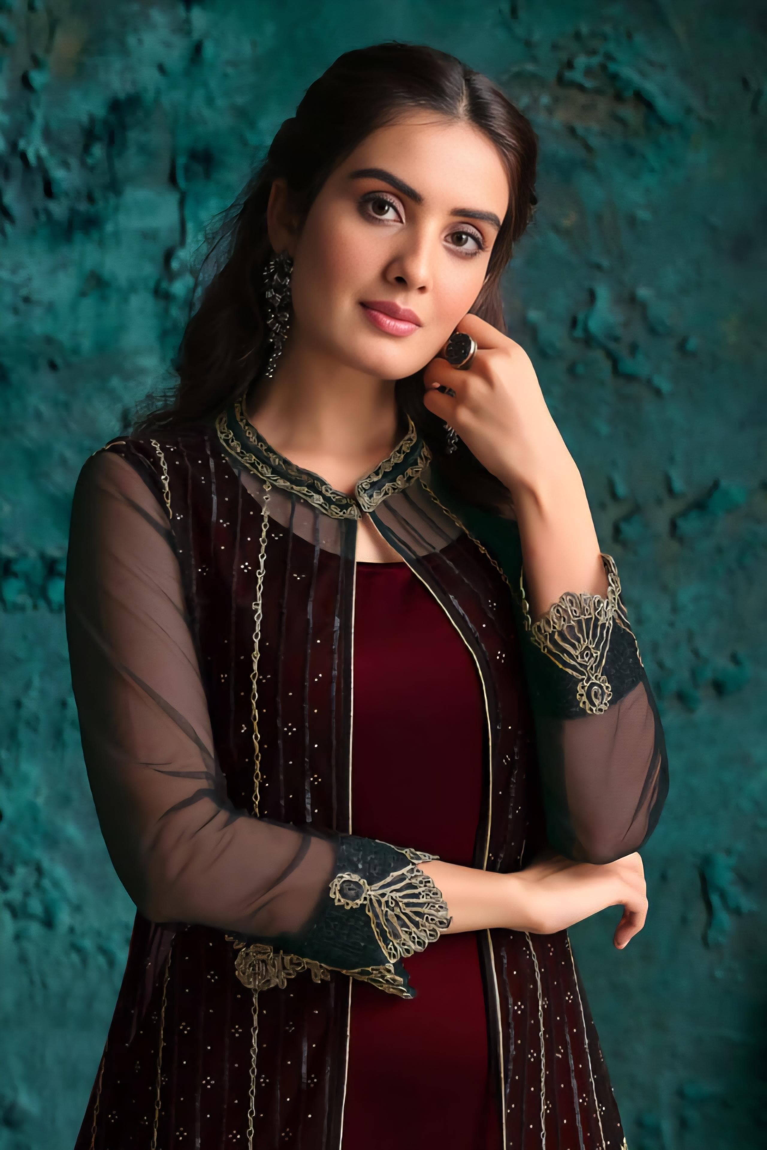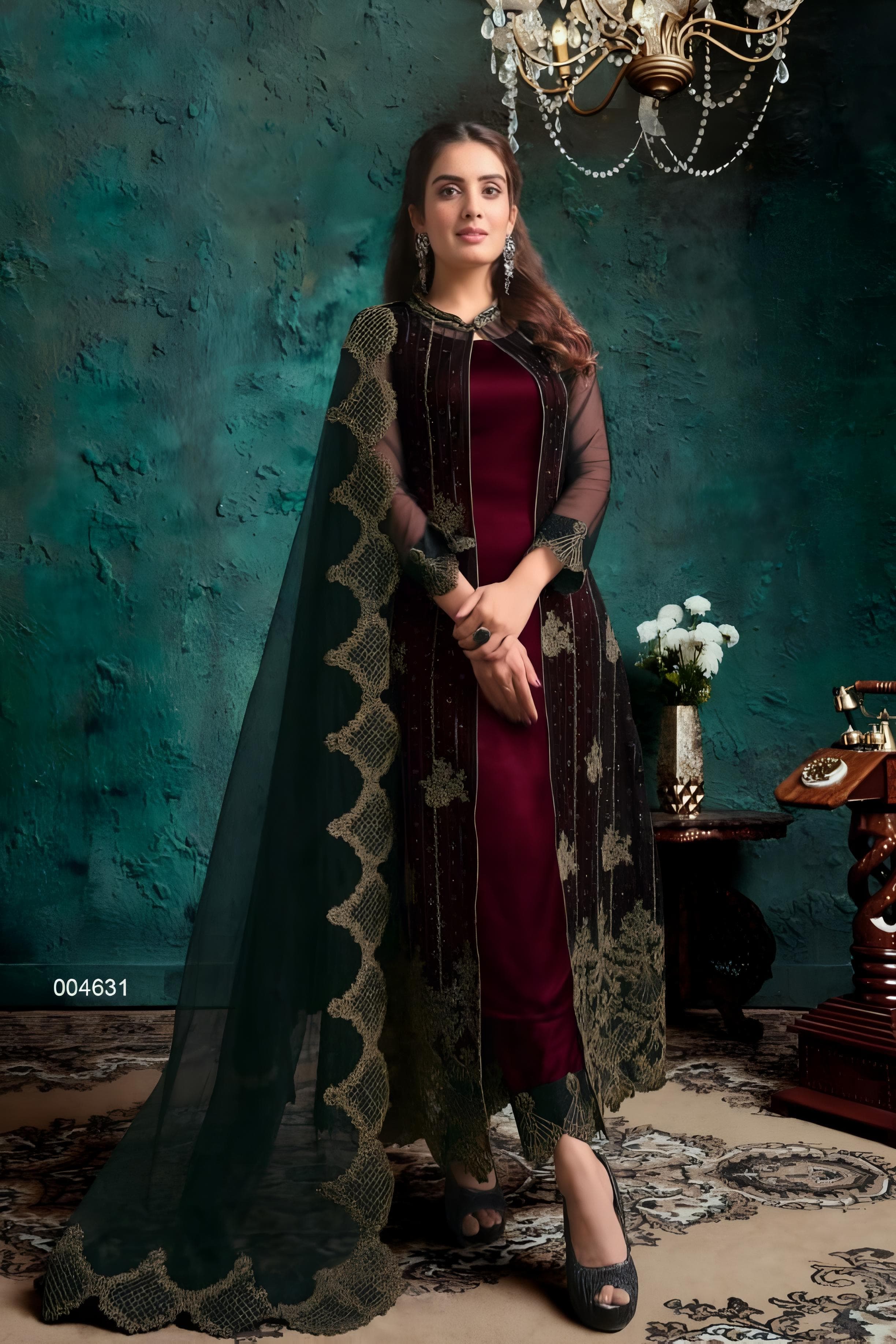 Designed in Heavy Net layered over Satin, enhanced with detailed embroidery and coding work for a luxurious and striking silhouette.