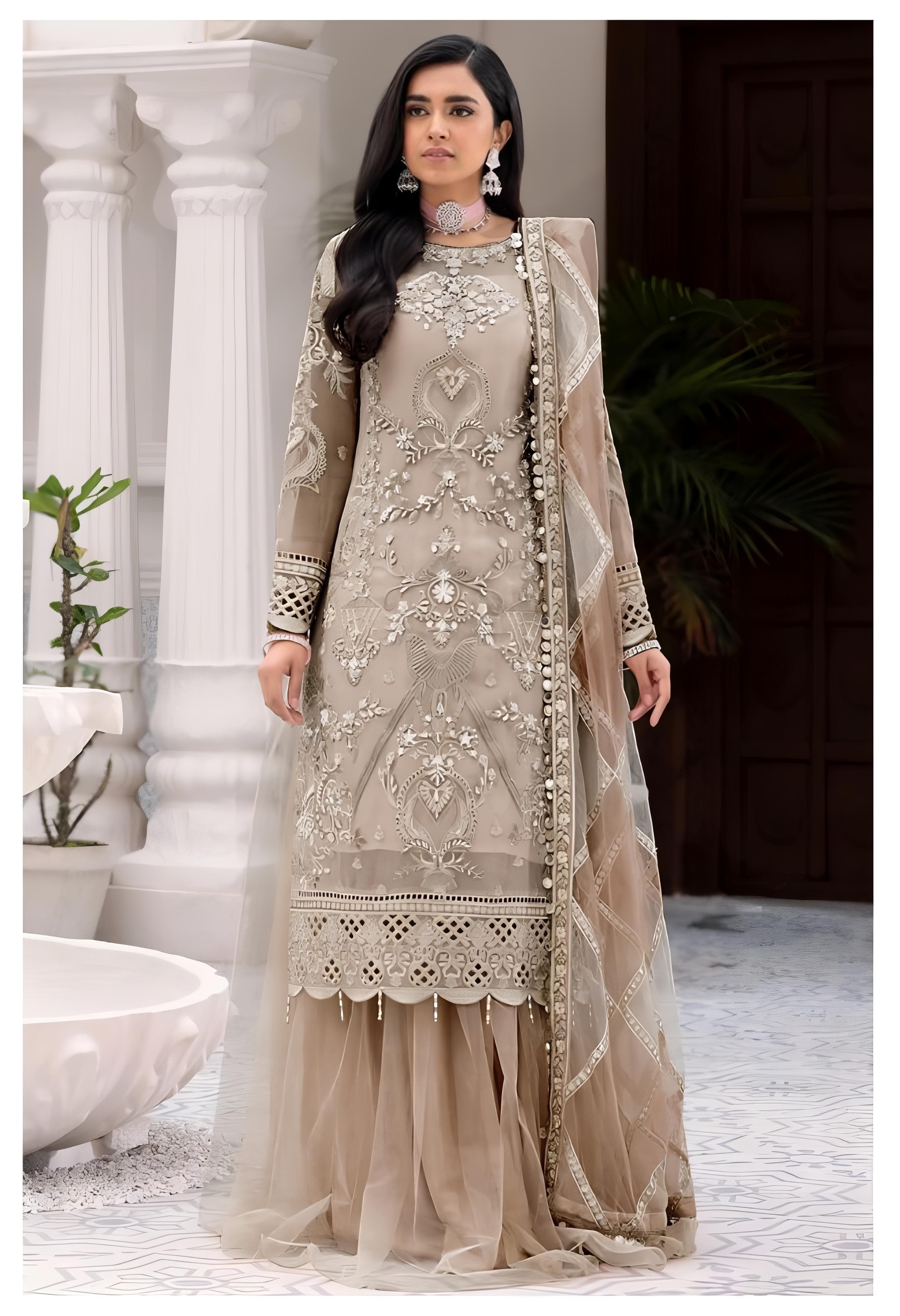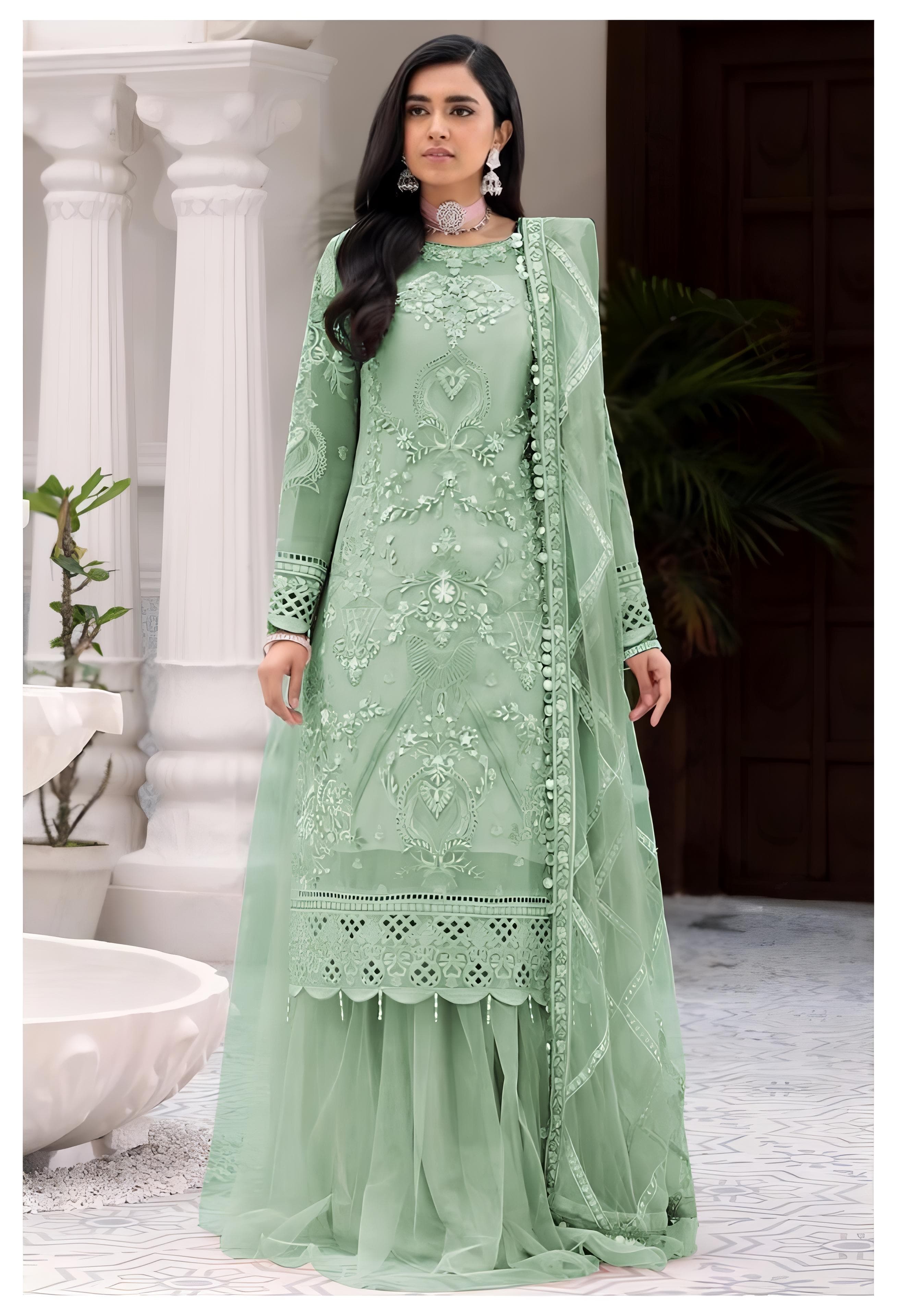 Exude timeless charm in this beautifully crafted Net Georgette suit set, intricately adorned with multi-thread and sequin embroidery — a statement ensemble for festive and elegant occasions.
