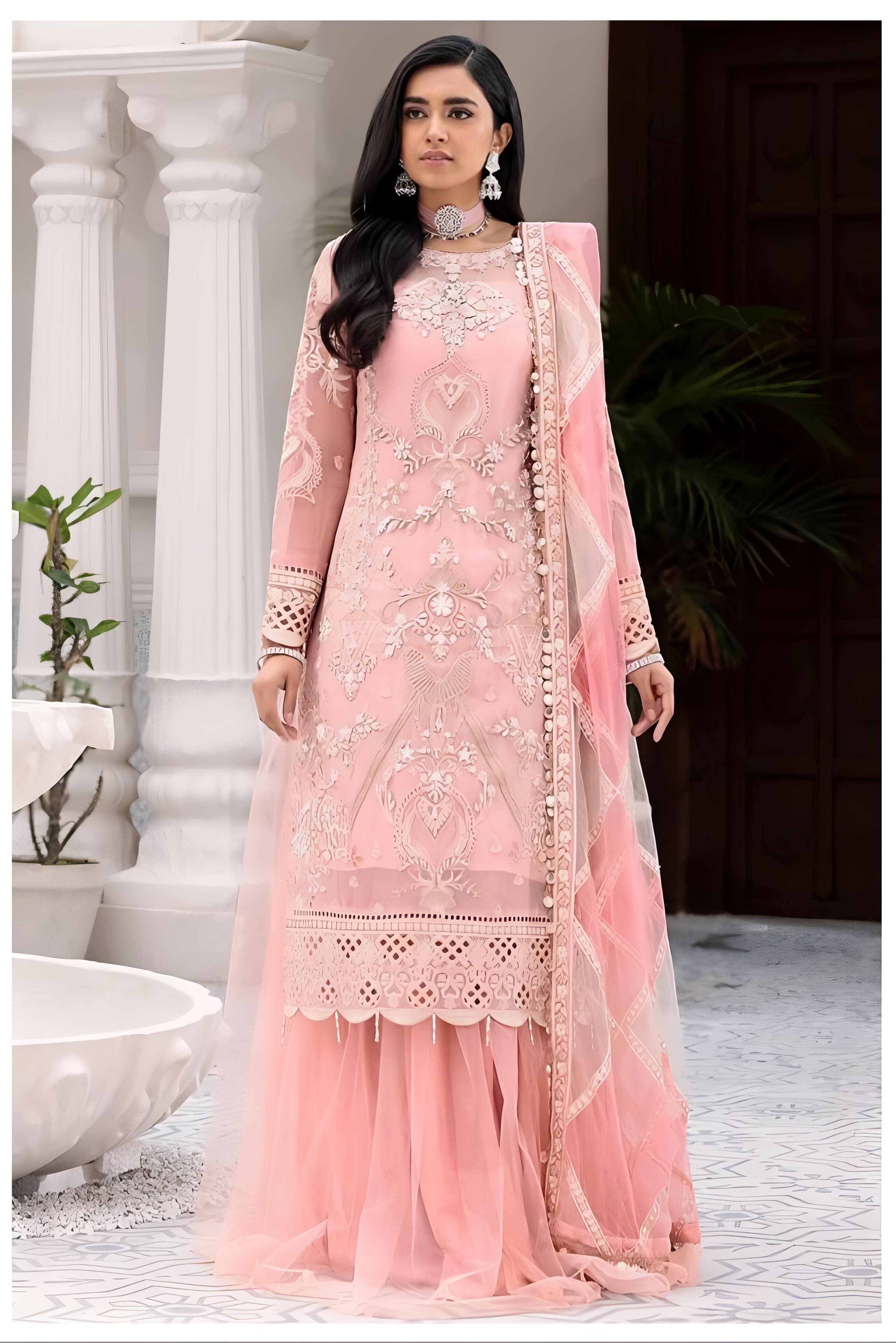 Crafted in matching Heavy Net Georgette, the sleeves are equally embellished with delicate embroidery and sequin accents, enhancing the coordinated beauty of the set.