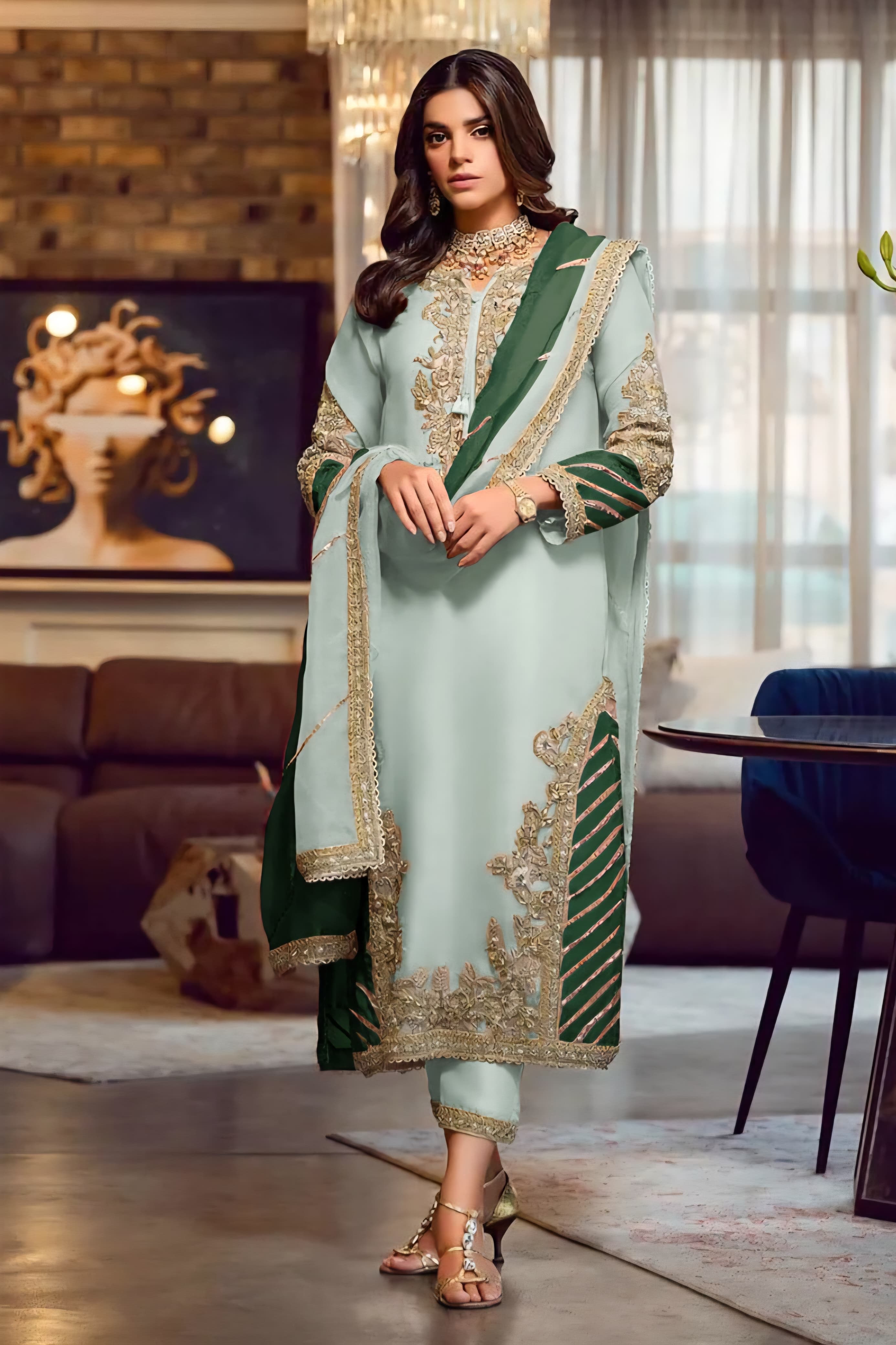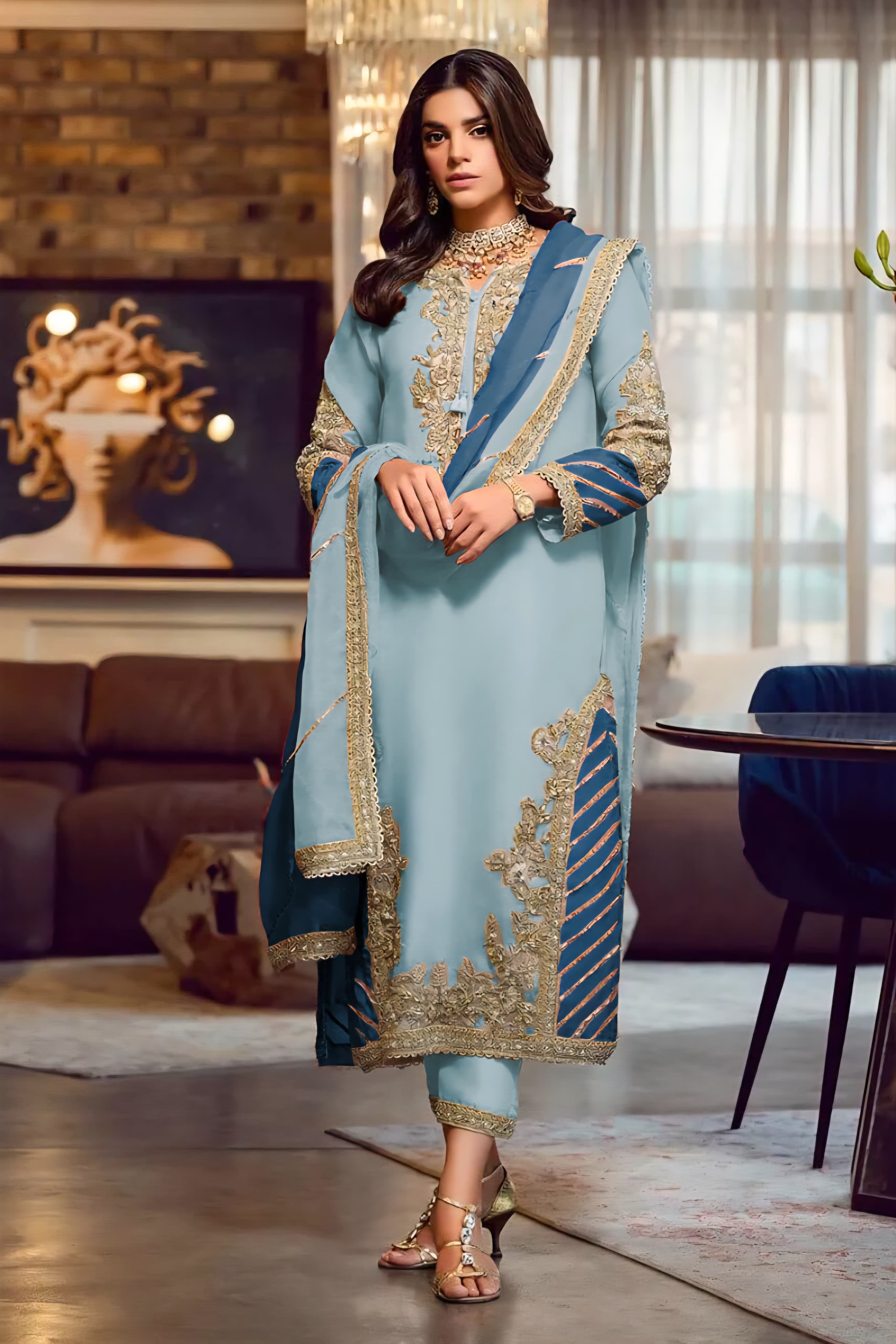 Radiate festive elegance in this beautifully designed Fox Georgette suit set, adorned with sequin embroidery and paired with a finely detailed dupatta — perfect for weddings, parties, and grand celebrations.