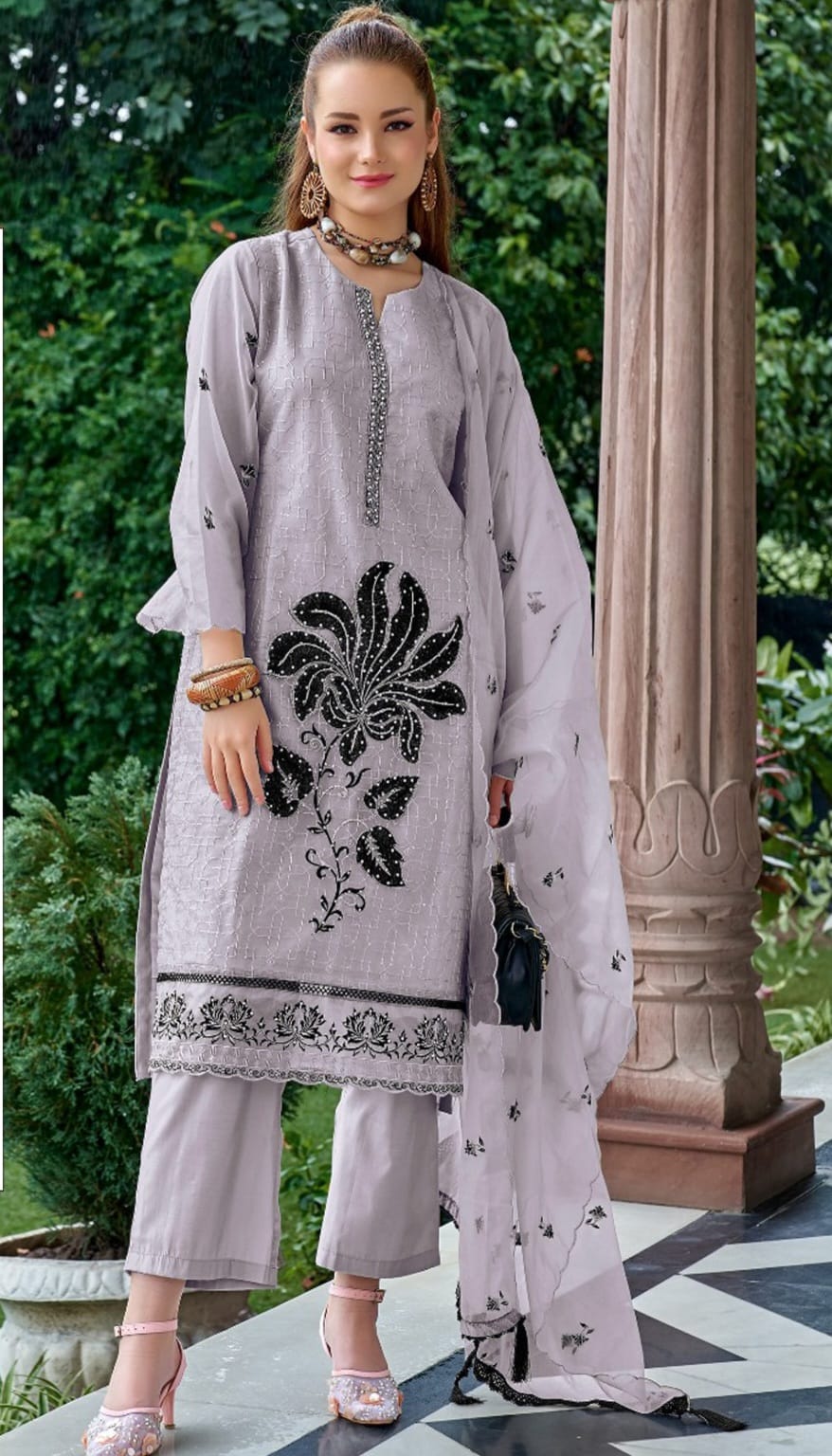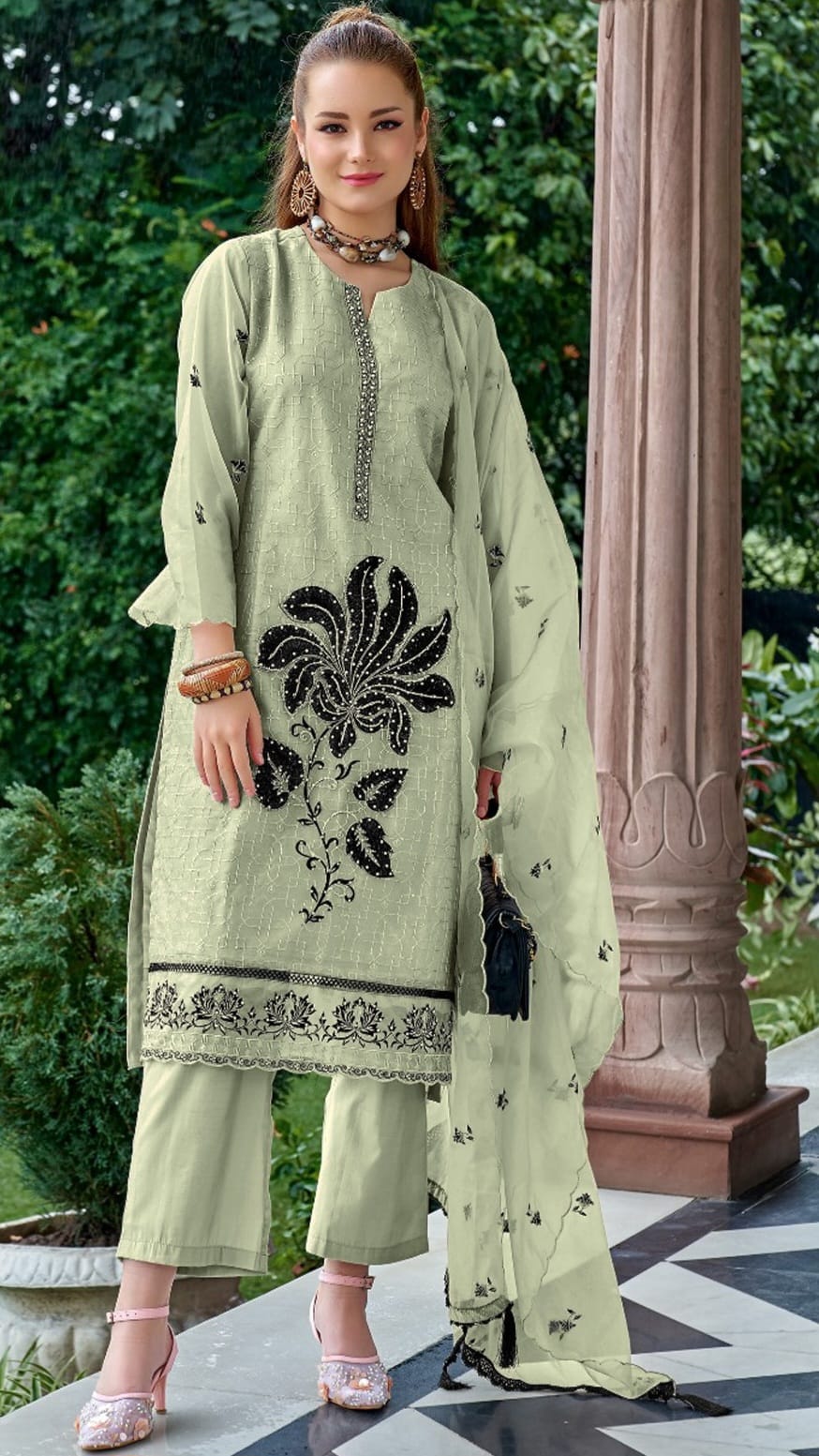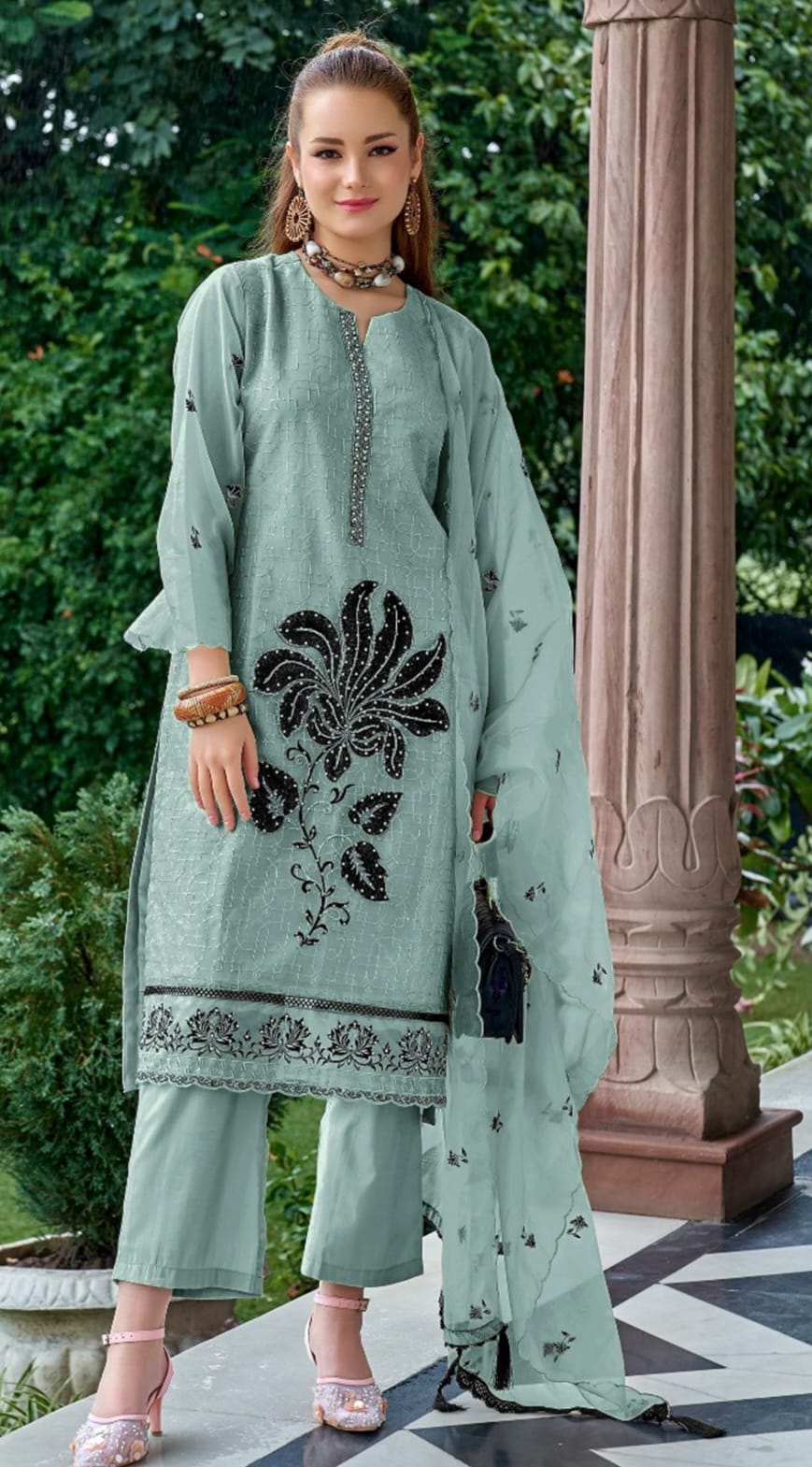 Turn heads in this ethereal Organza suit set, adorned with intricate embroidery, sequin highlights, and elegant black stone detailing — a graceful ensemble for evening soirées, festivities, and celebrations.