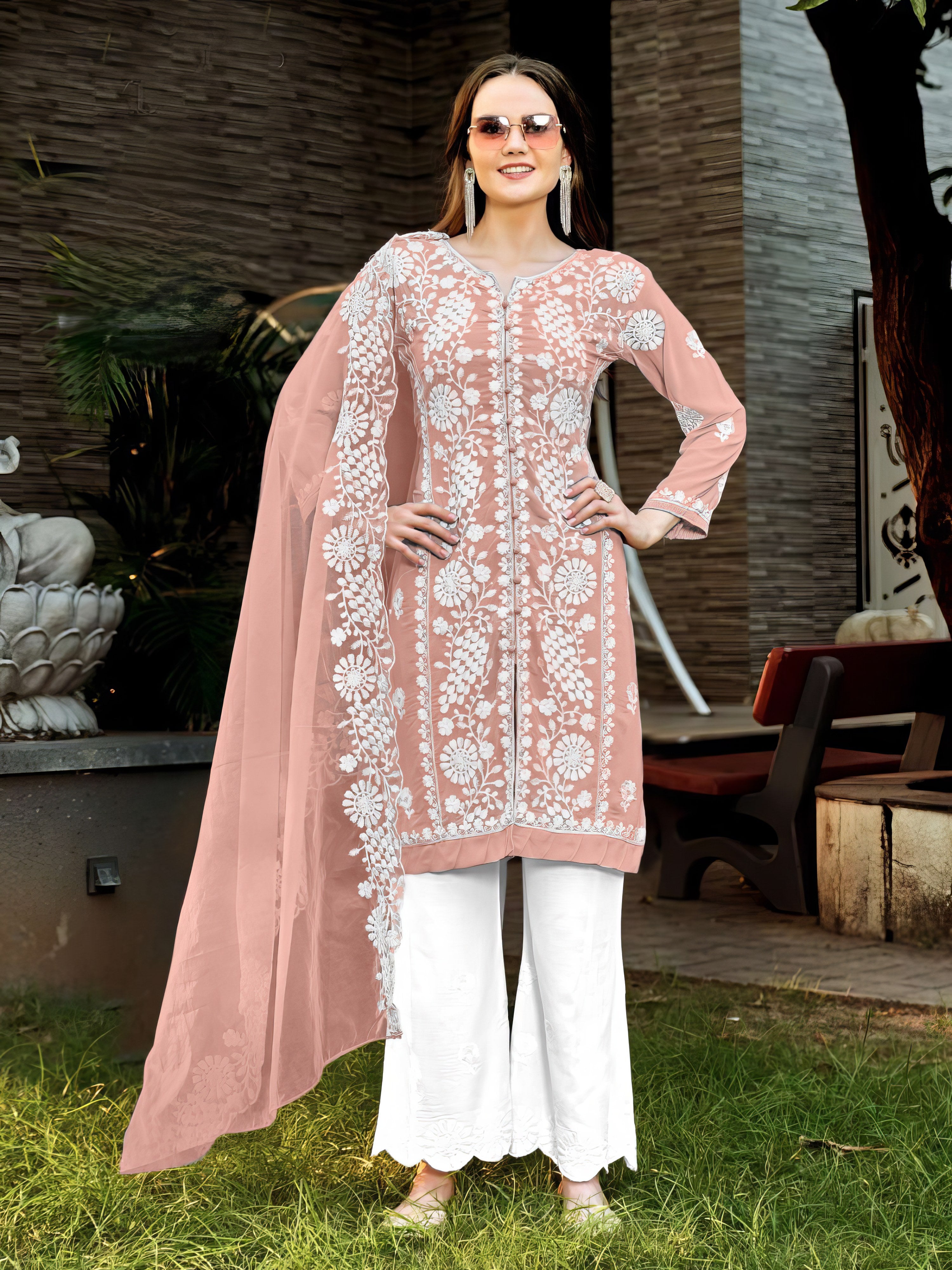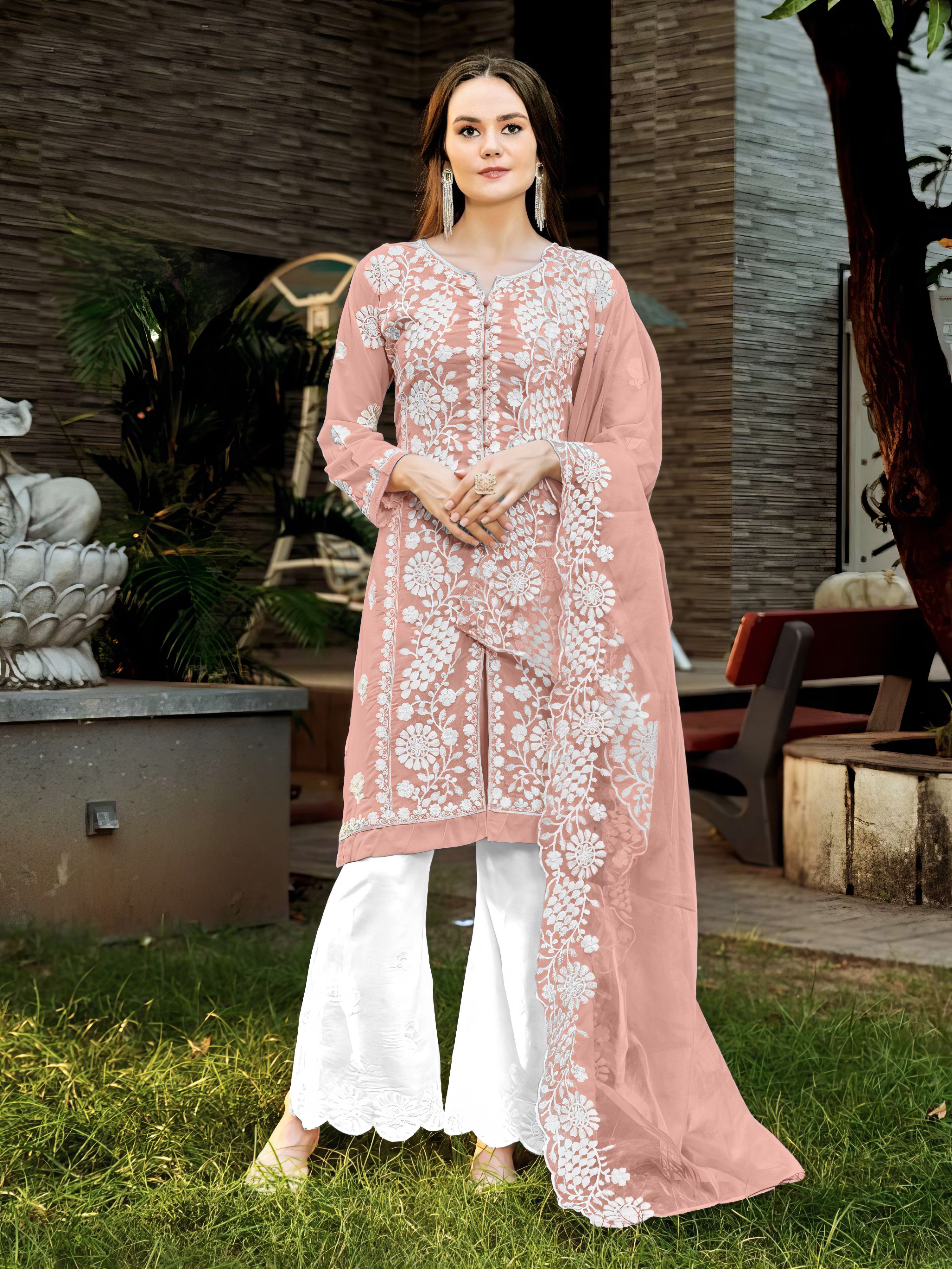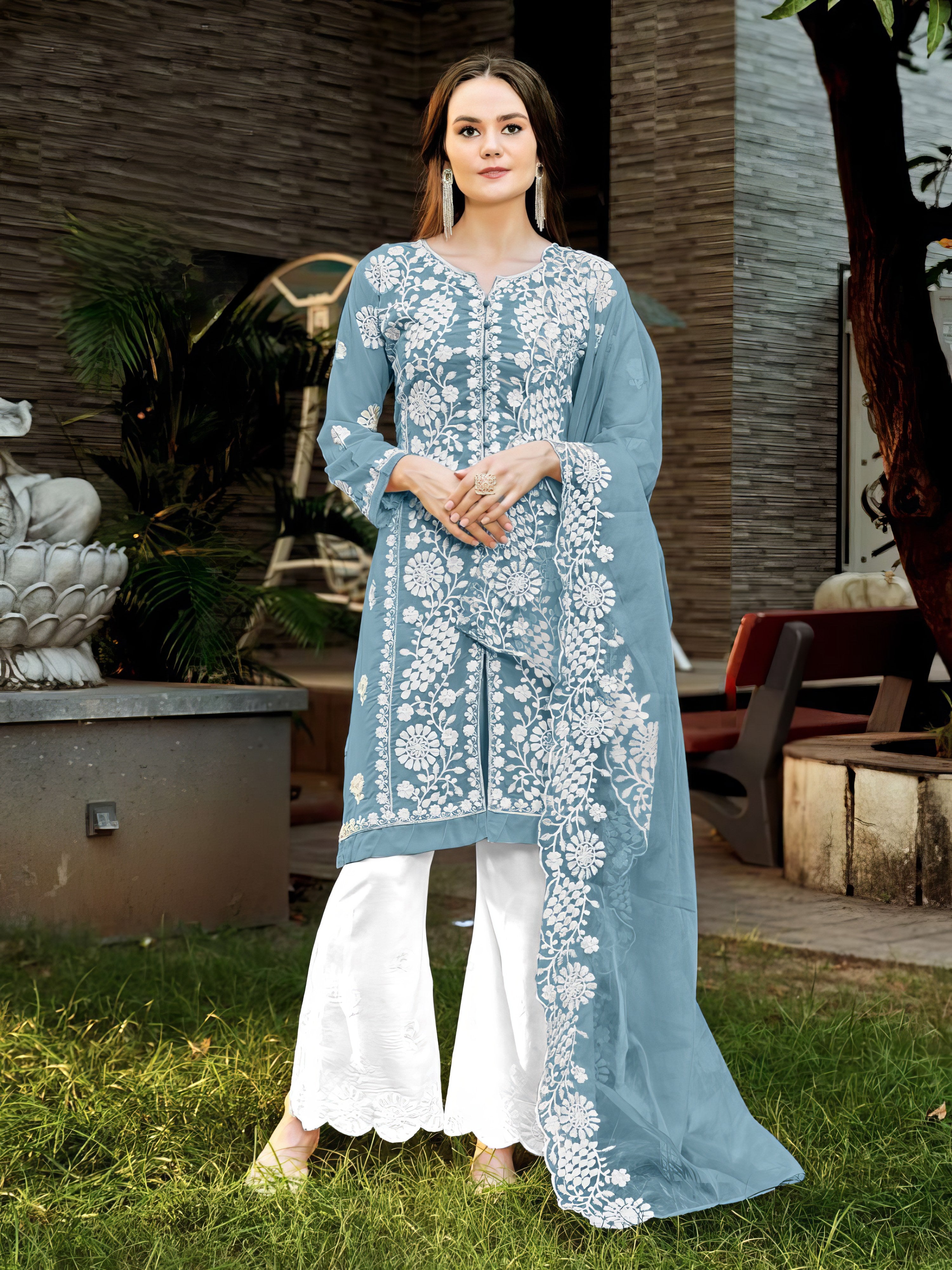 This graceful ensemble features a richly embroidered faux georgette top enhanced with intricate khatli work, blending traditional craftsmanship with contemporary flair. It is paired with a comfortable yet elegant embroidered rayon plazo and a lightweight organza dupatta that completes the look with delicate embroidery. Available in four beautiful colors, this set is perfect for festive and semi-formal occasions.