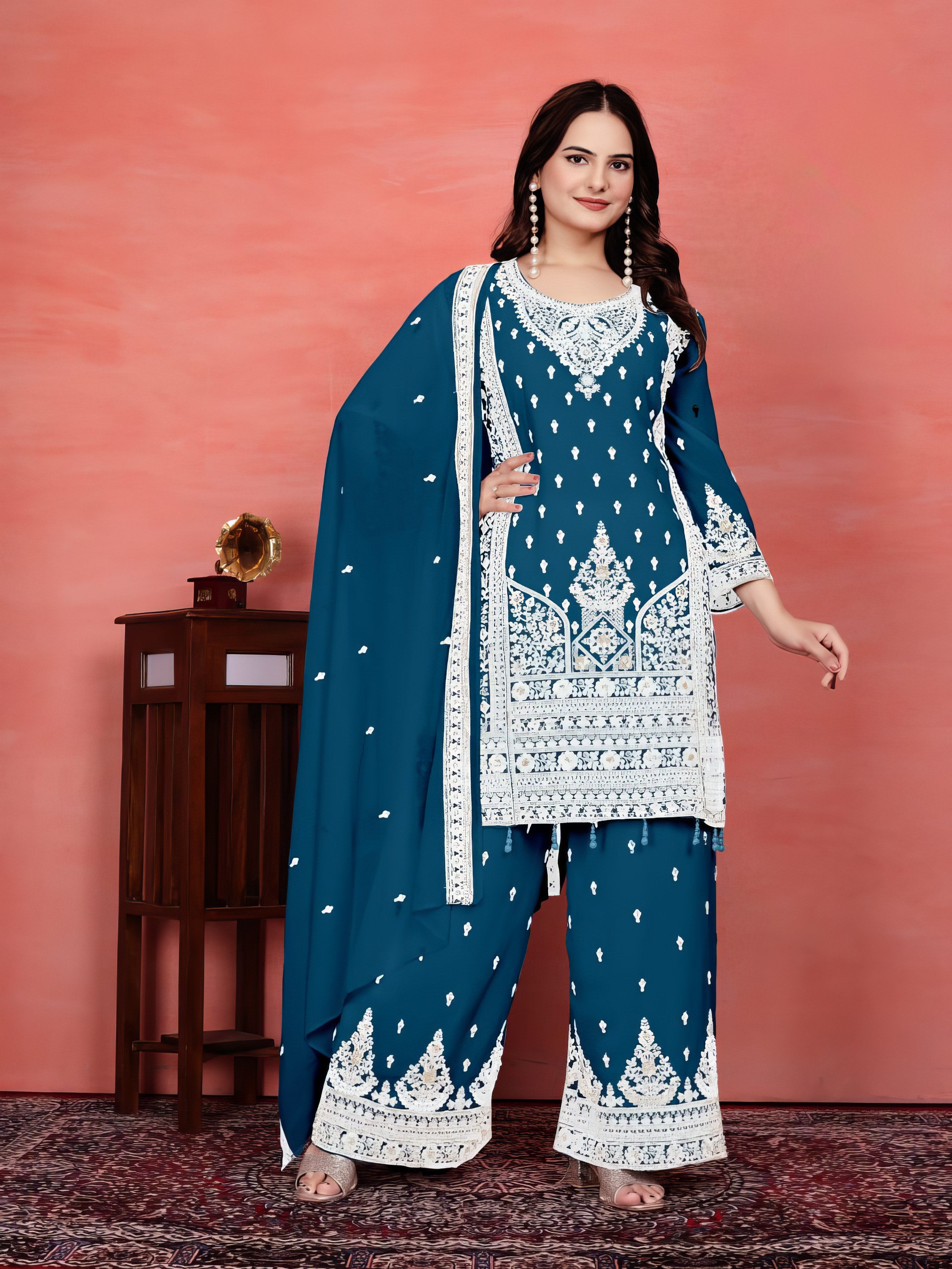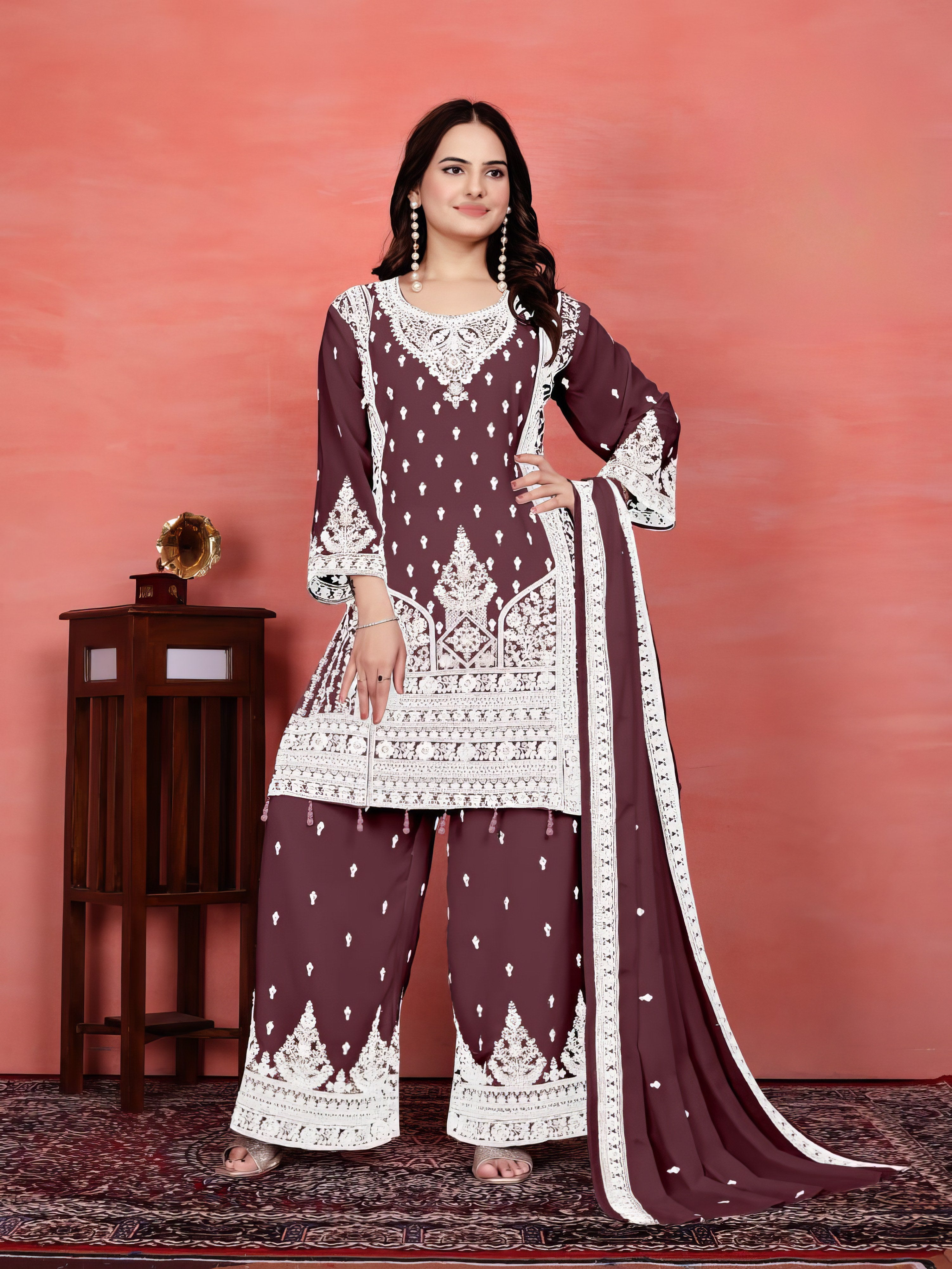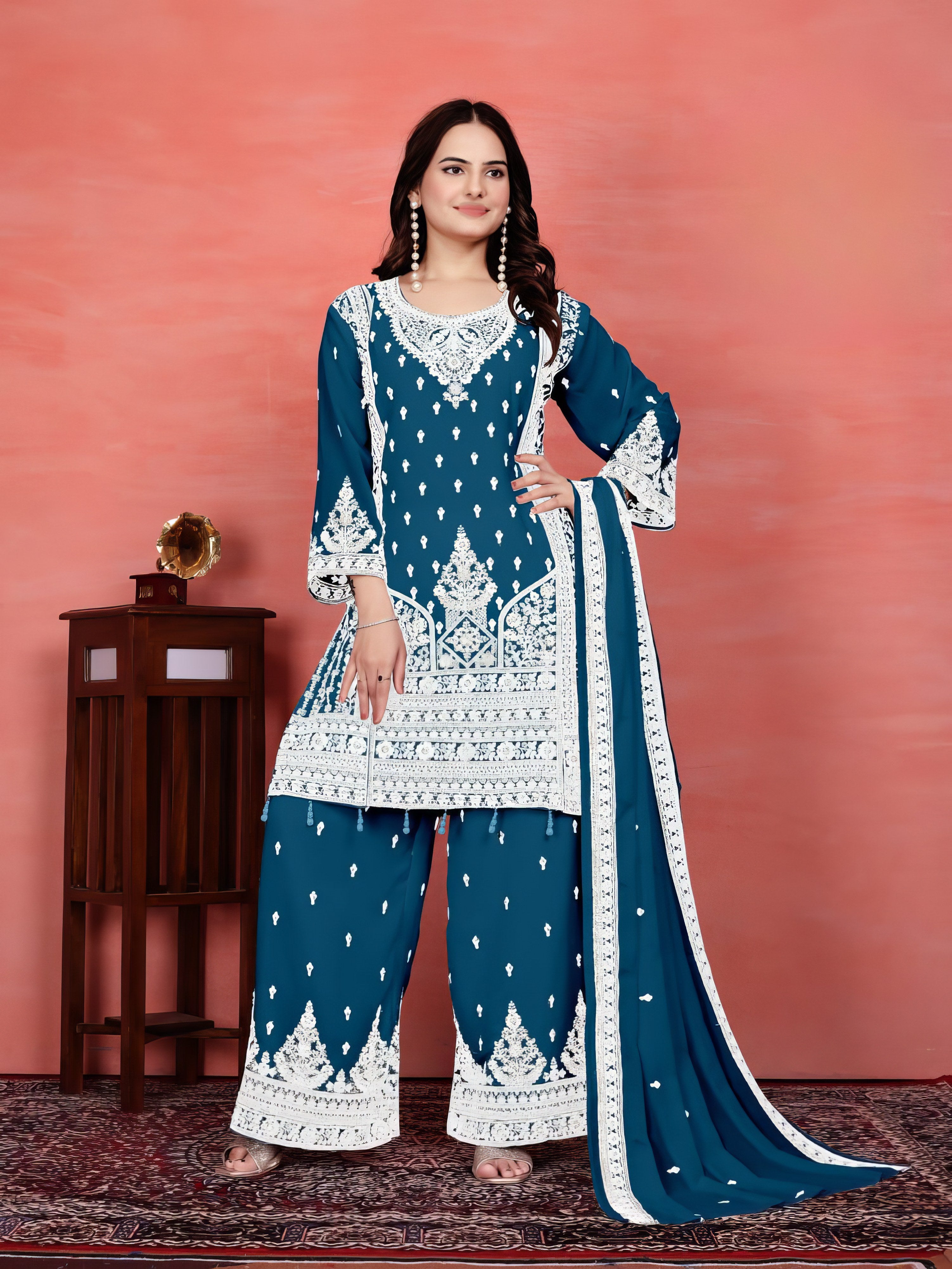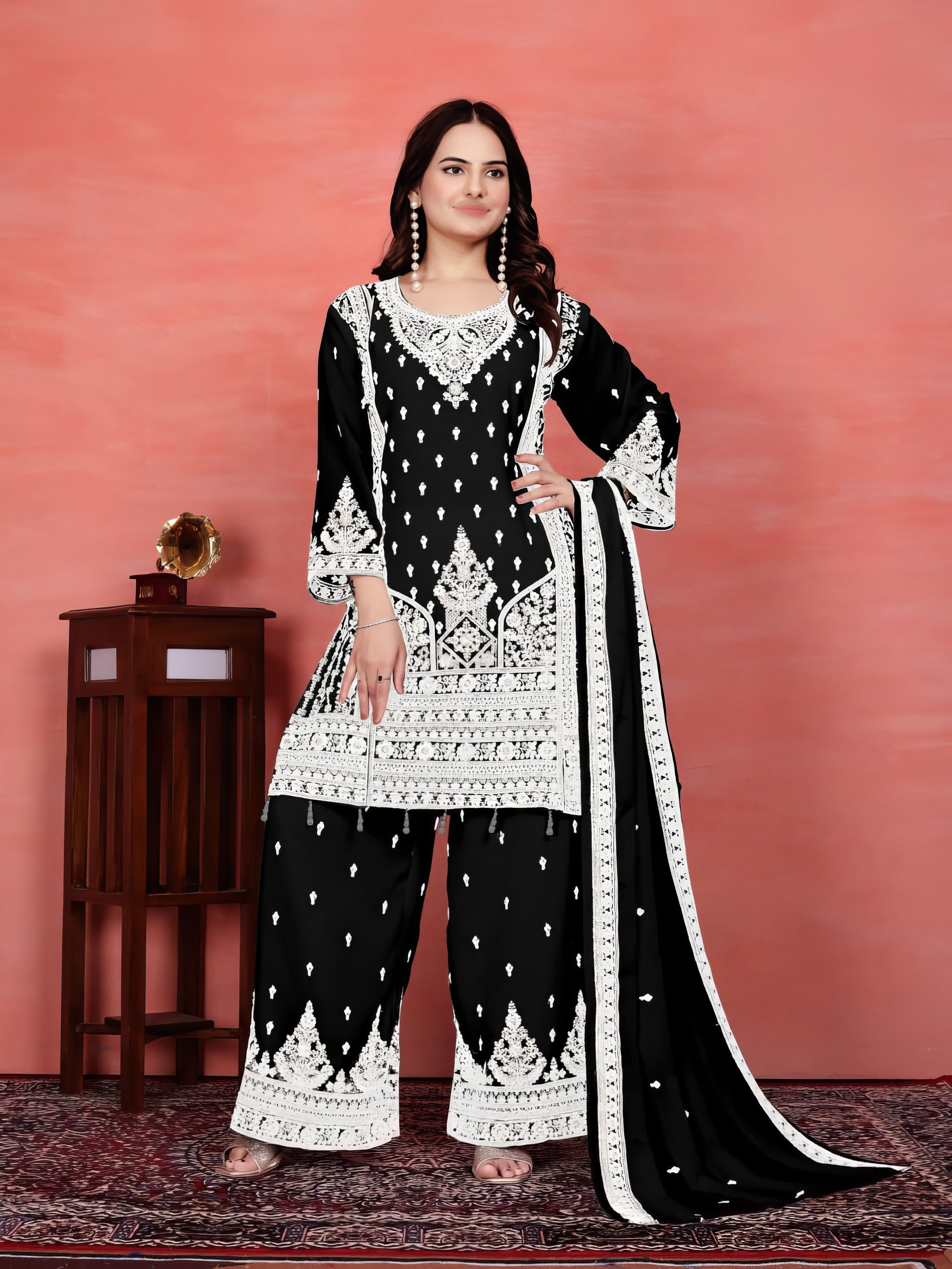 This ready-made ensemble features a luxurious Fox Georgette top adorned with intricate full embroidery and exquisite Khatli handwork, finished with beautiful attached latkans for added elegance. It is paired with a matching Georgette plazo showcasing detailed hand embroidery. The look is completed with a Pure Heavy Georgette dupatta designed with delicate embroidery to enhance the entire outfit.