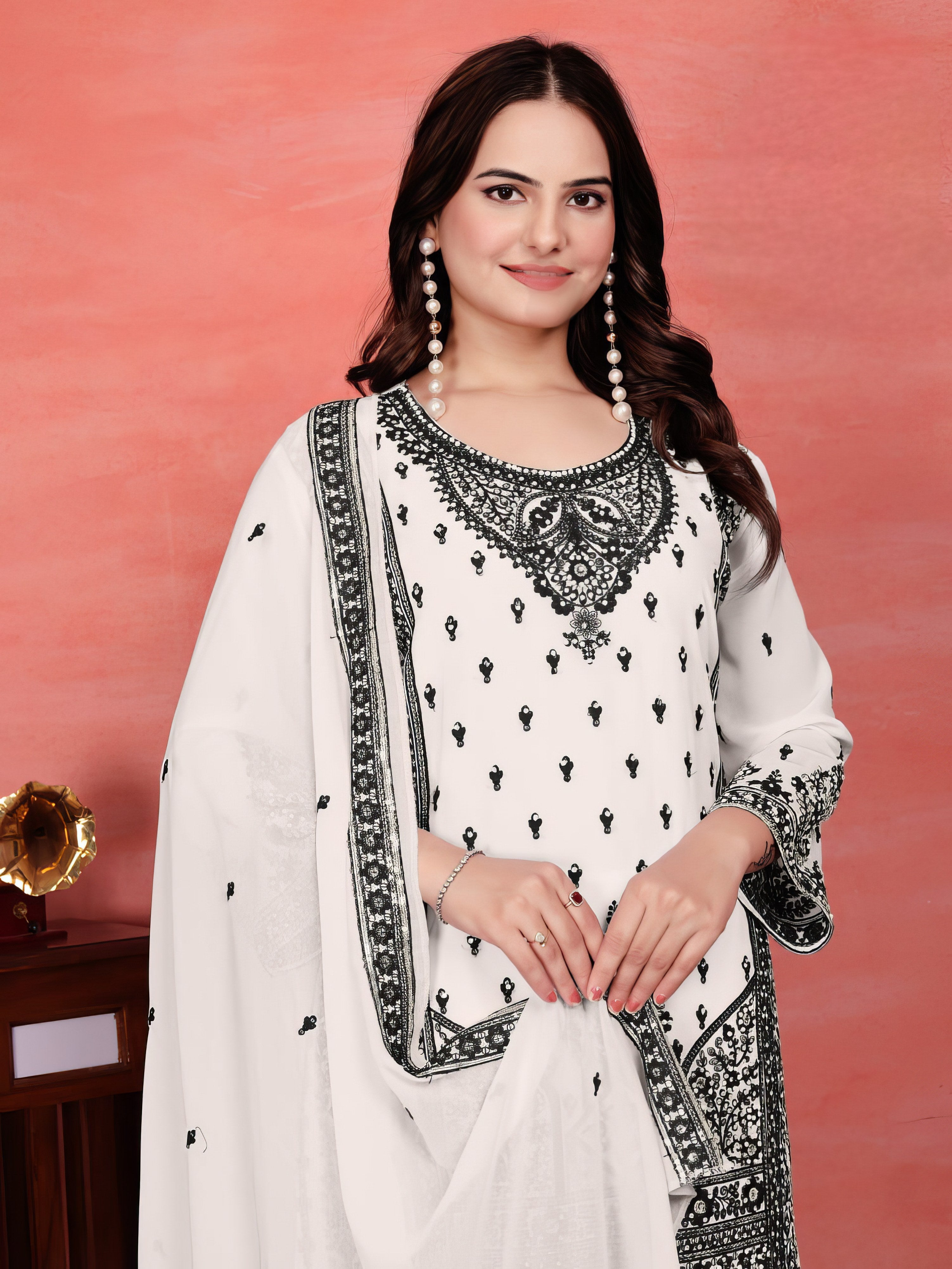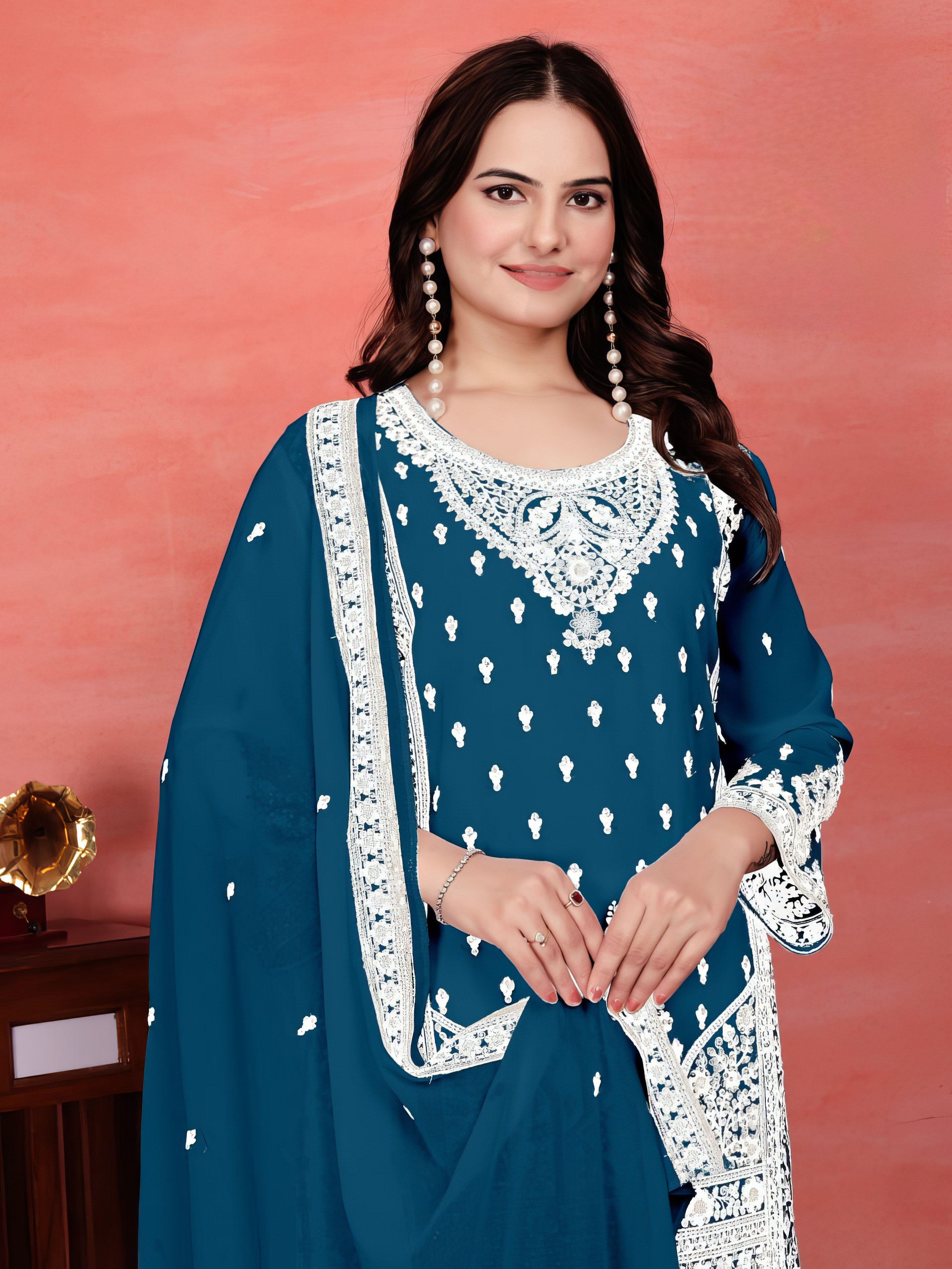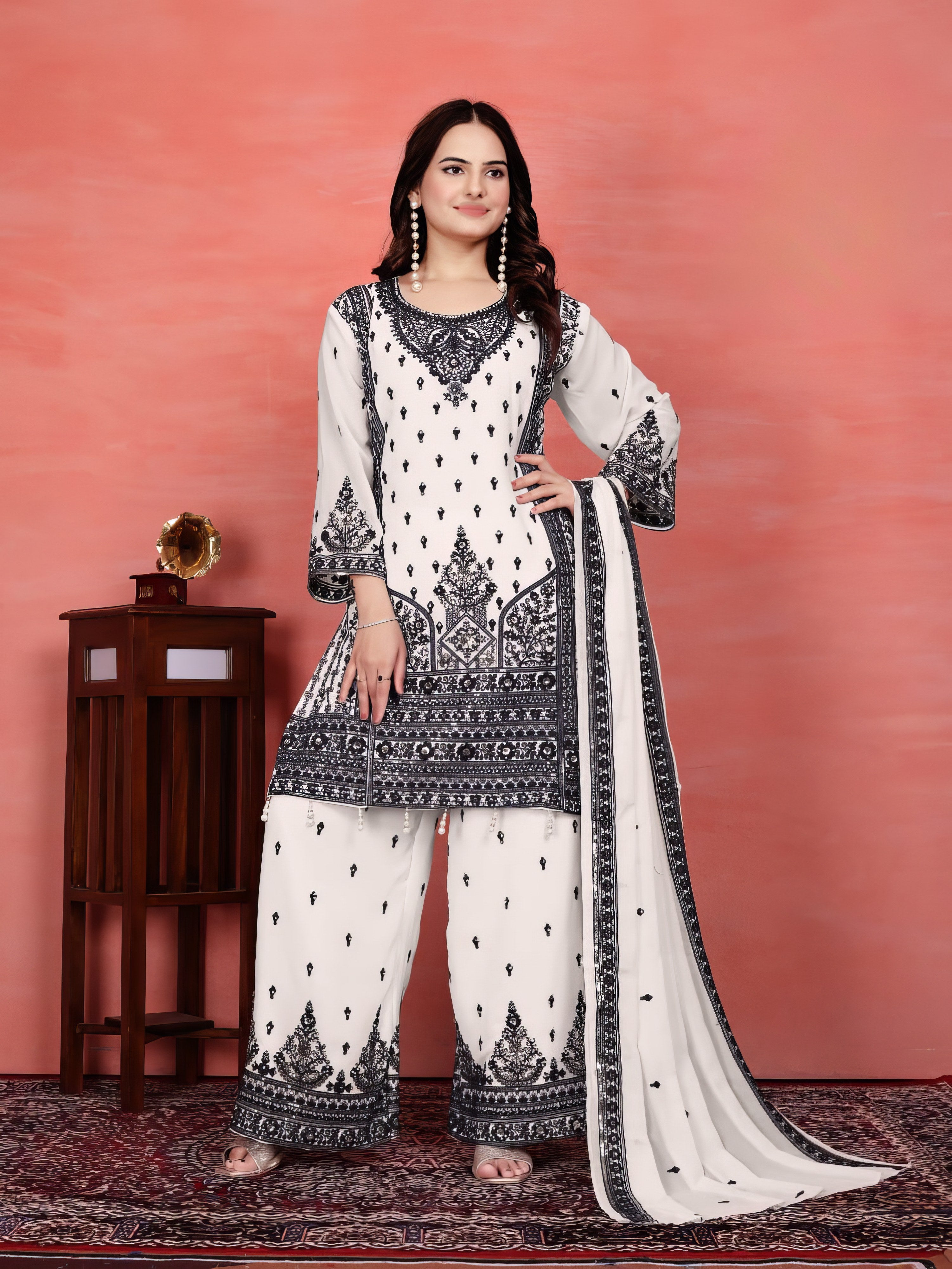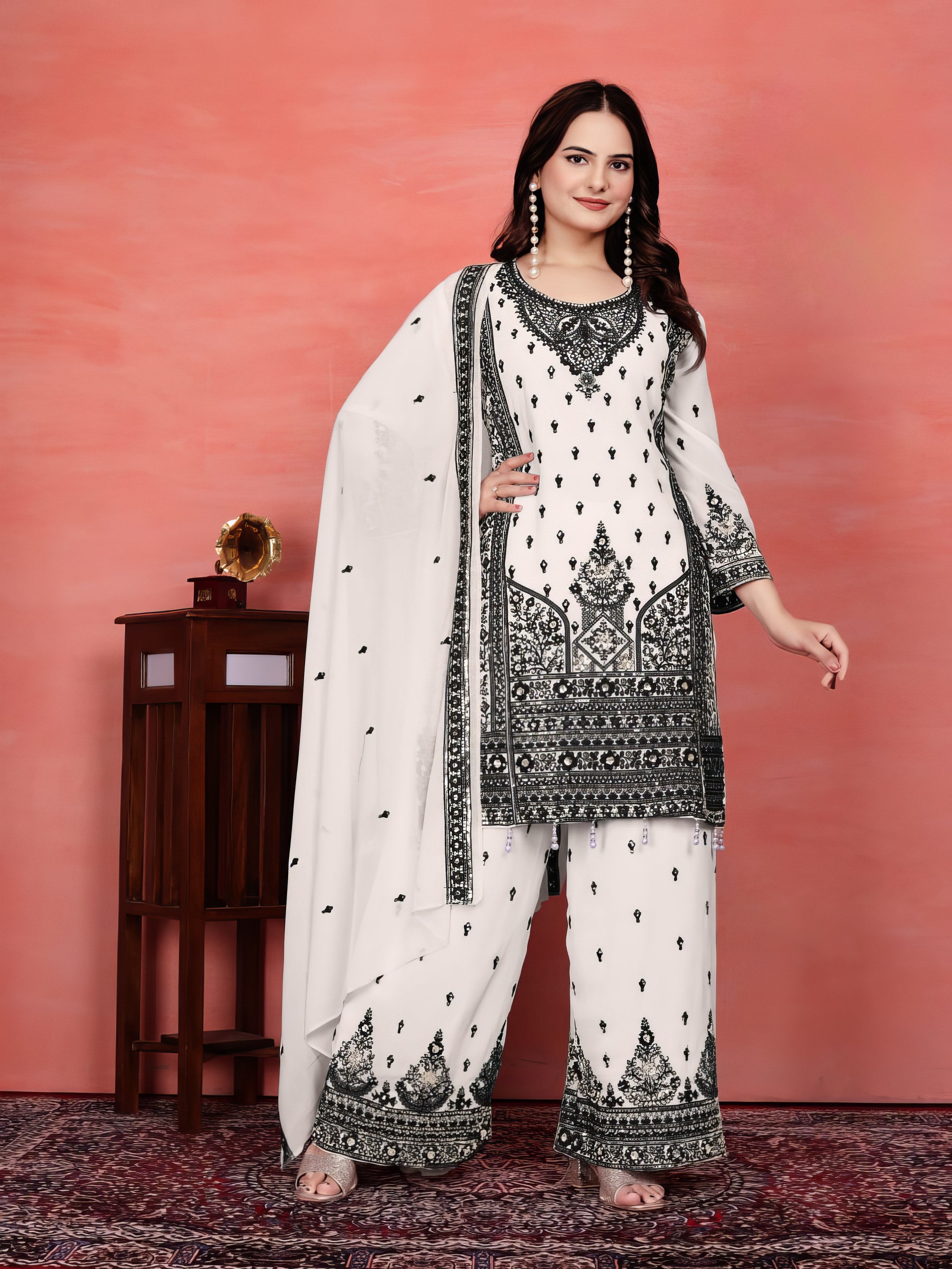 This ready-made ensemble features a luxurious Fox Georgette top adorned with intricate full embroidery and exquisite Khatli handwork, finished with beautiful attached latkans for added elegance. It is paired with a matching Georgette plazo showcasing detailed hand embroidery. The look is completed with a Pure Heavy Georgette dupatta designed with delicate embroidery to enhance the entire outfit.