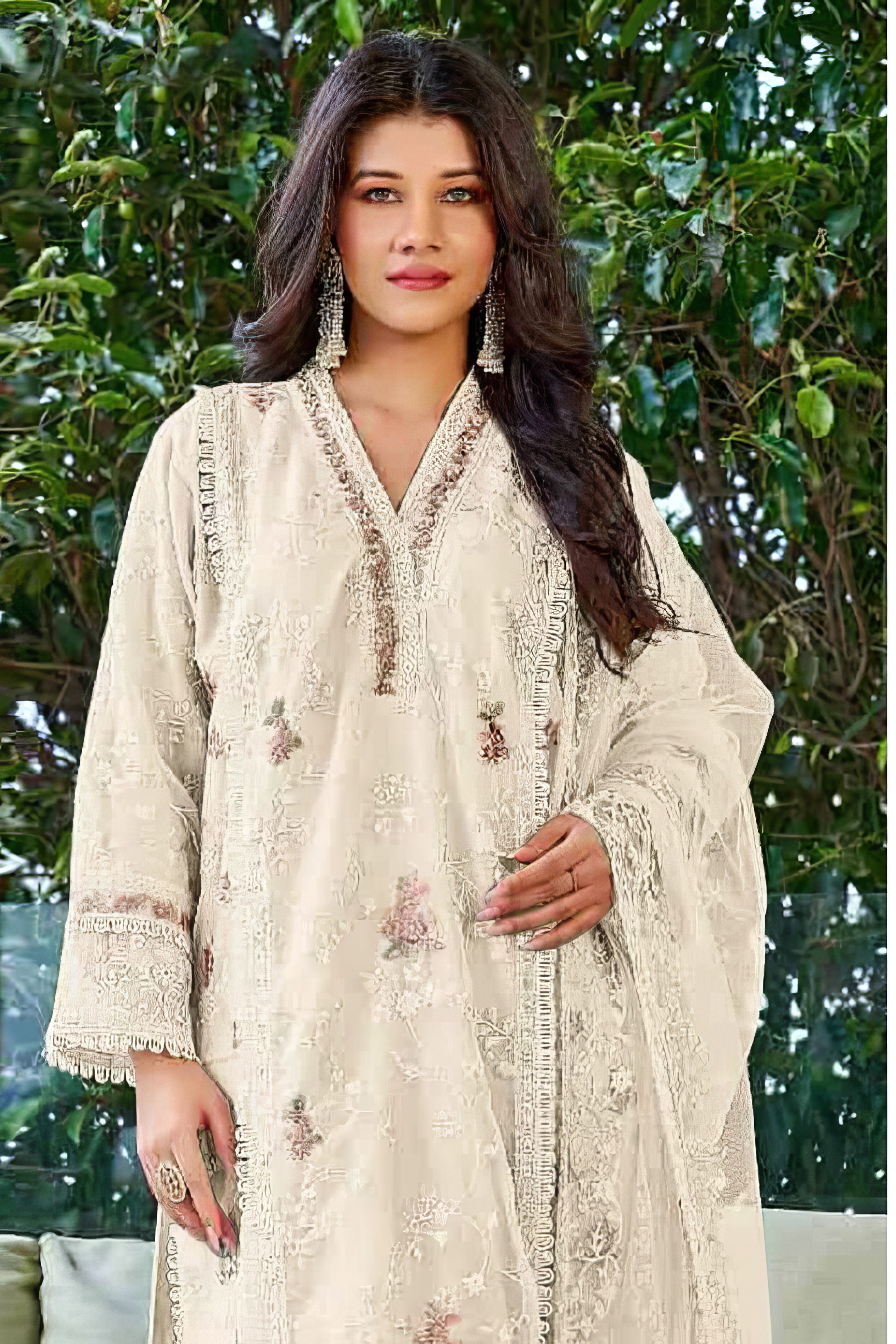 This elegant suit features a premium Fox Georgette top embellished with intricate embroidery and sequence work. The Santoon bottom and inner lining ensure comfort and a smooth fit. Complemented with a heavy net dupatta adorned with embroidery, this ensemble is perfect for festive occasions, parties, and wedding events.