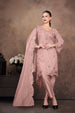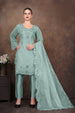 This stylish designer tunic features classic embroidery on the kurti, paired with glamorous embroidered sleeves. The set includes a comfortable Gadhwal pant and a fancy Organza dupatta with delicate embroidery, creating a sophisticated and elegant ensemble suitable for festive occasions and parties.