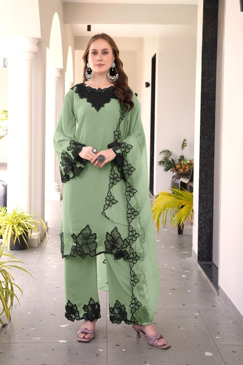 This designer-style frock tunic showcases classic heavy cutwork embroidery on both the front and back, paired with a graceful neckline pattern. The kurti features a flared frock silhouette and glamorous cutwork-embroidered sleeves. It is styled with matching fox fabric plazo pants featuring embroidery and cutwork detailing, and an elegant organza dupatta with embroidery to complete the luxurious look.