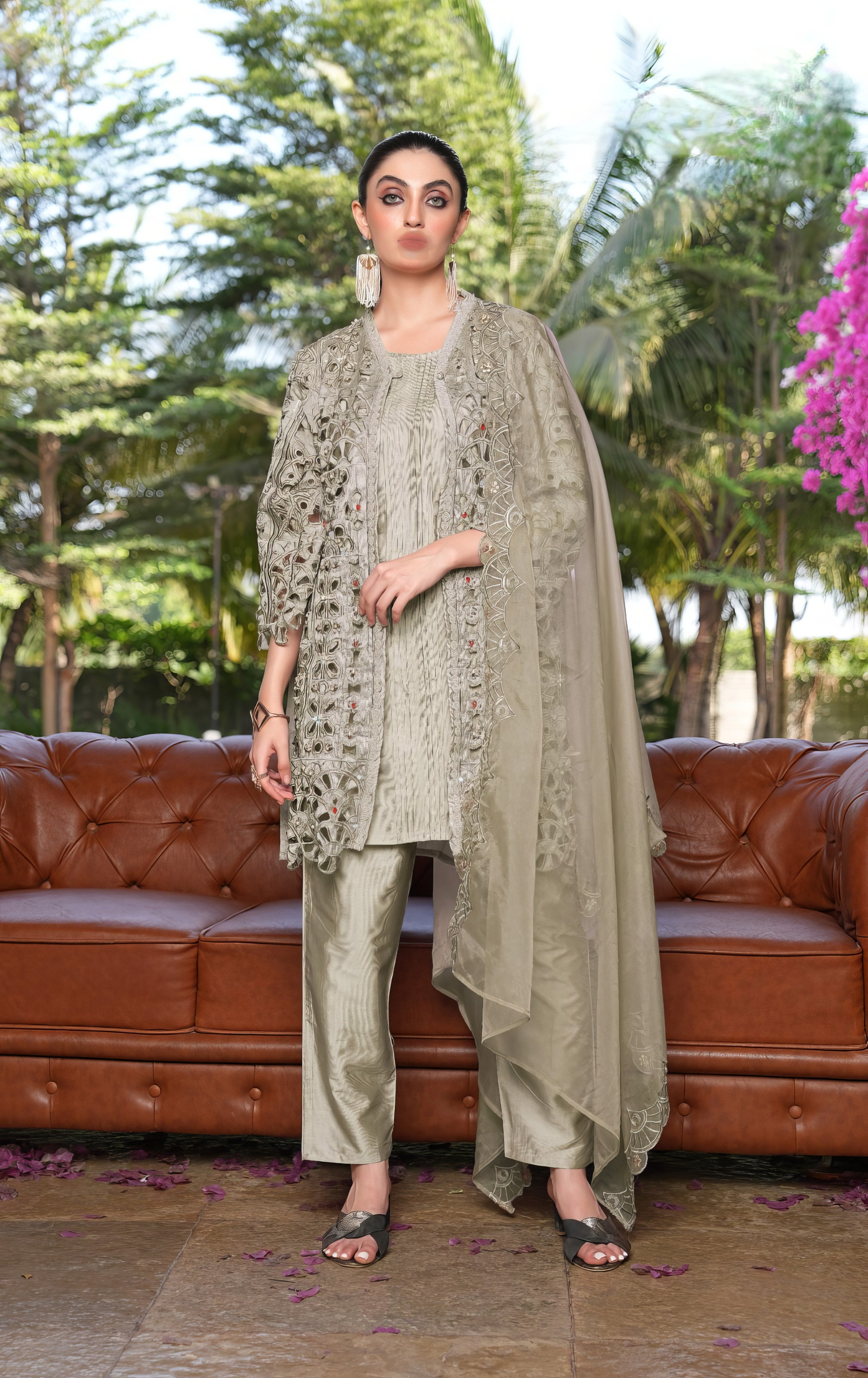This designer-style shrug tunic set features classic heavy embroidery with intricate cutwork and delicate handwork. The outer shrug-style top is styled with glamorous sleeves and paired with a separate inner for added versatility. The look is completed with comfortable viscose Gadhwal pants and an elegant embroidered organza dupatta, offering a perfect blend of modern charm and traditional detailing.