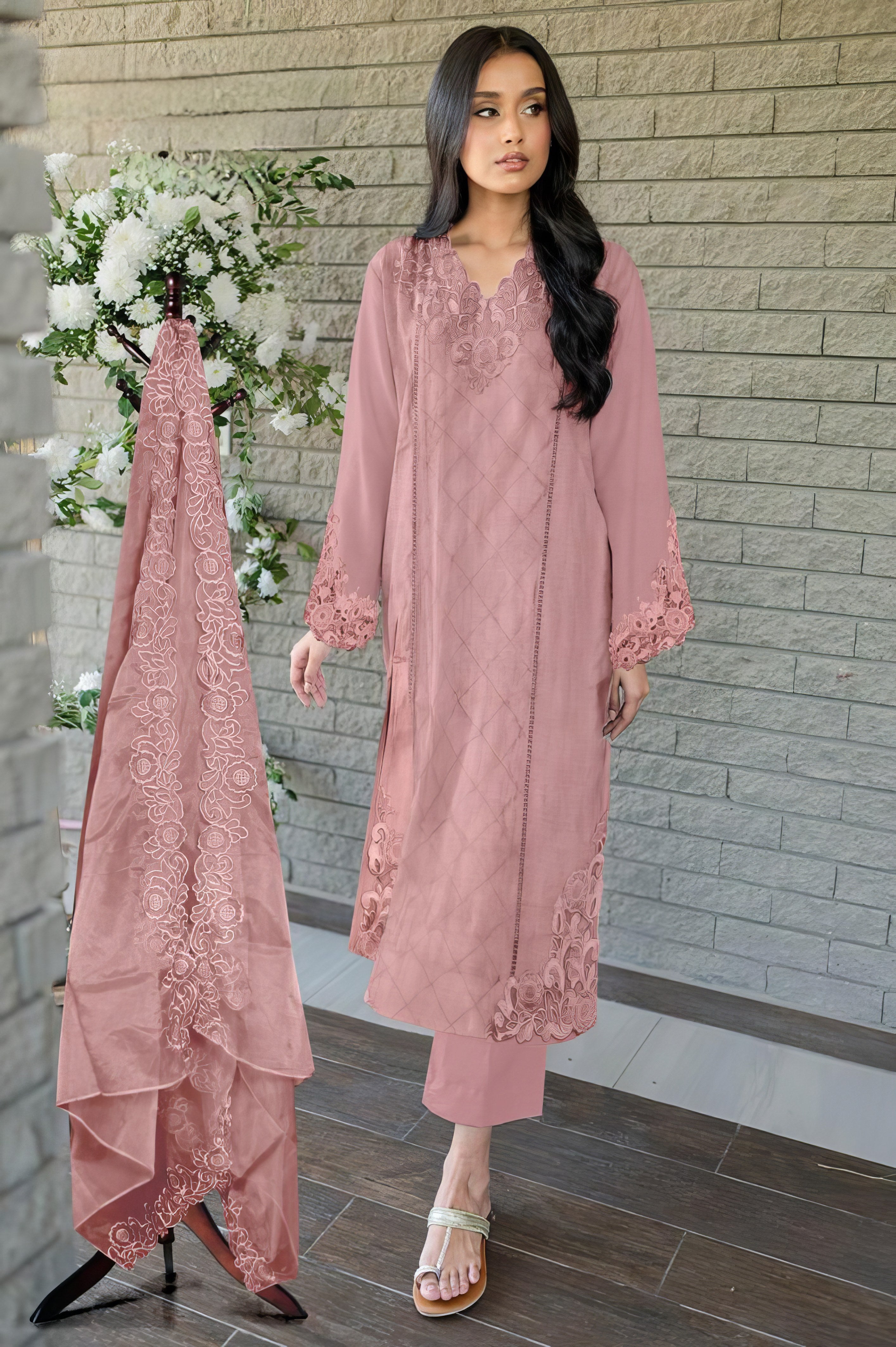 This designer tunic features stunning heavy embroidery with intricate cutwork and fine plating on the tunic and sleeves, adding a rich and glamorous appeal. Paired with a matching pant and a beautifully embroidered organza dupatta, this ensemble is perfect for making a statement at any event.