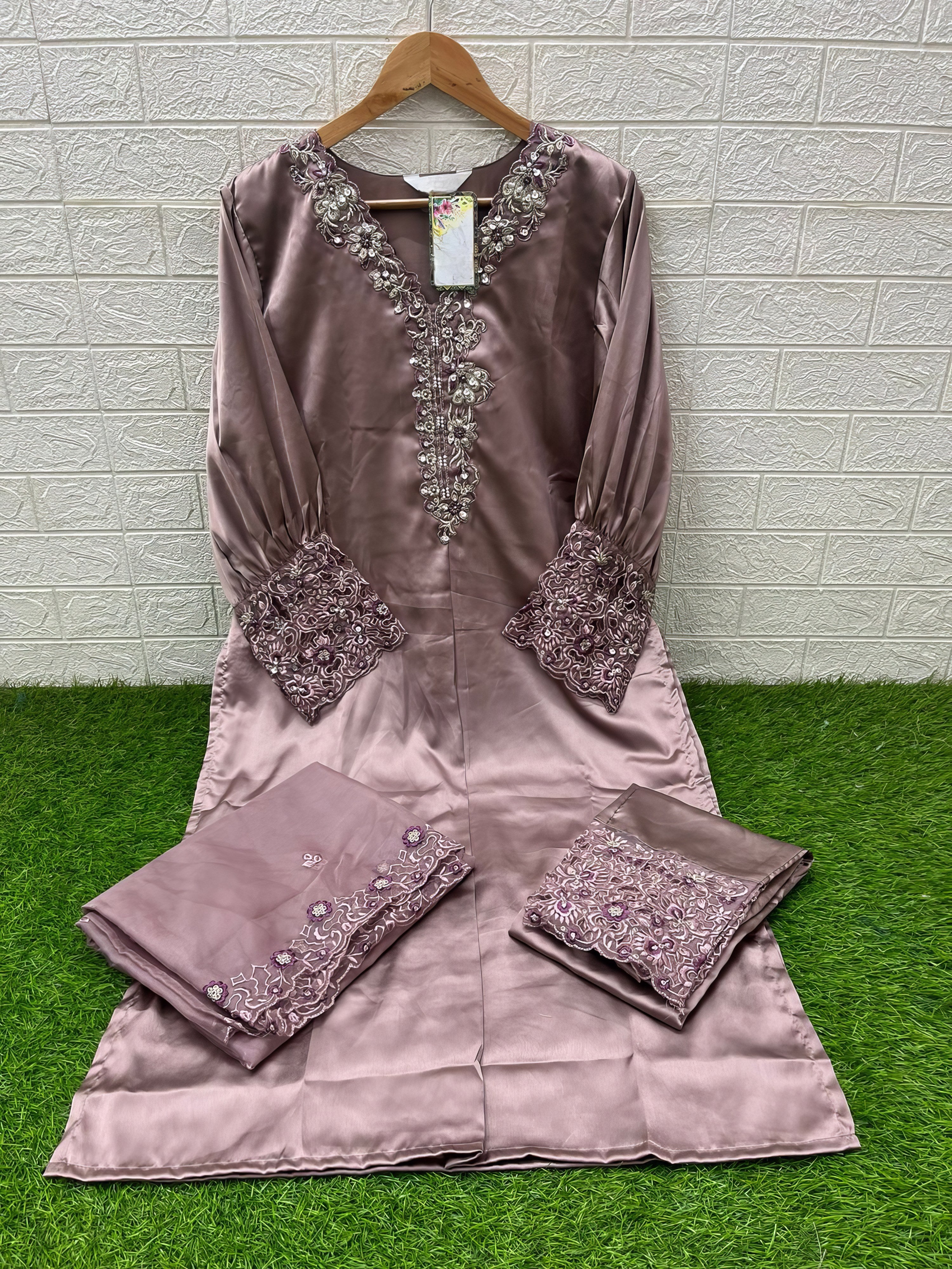 This designer tunic features classic embroidery combined with delicate handwork for a timeless look. The stylish kurti is beautifully complemented by glamorous embroidered sleeves, paired with matching satin pants and a finely embroidered organza dupatta for a complete and graceful ensemble.