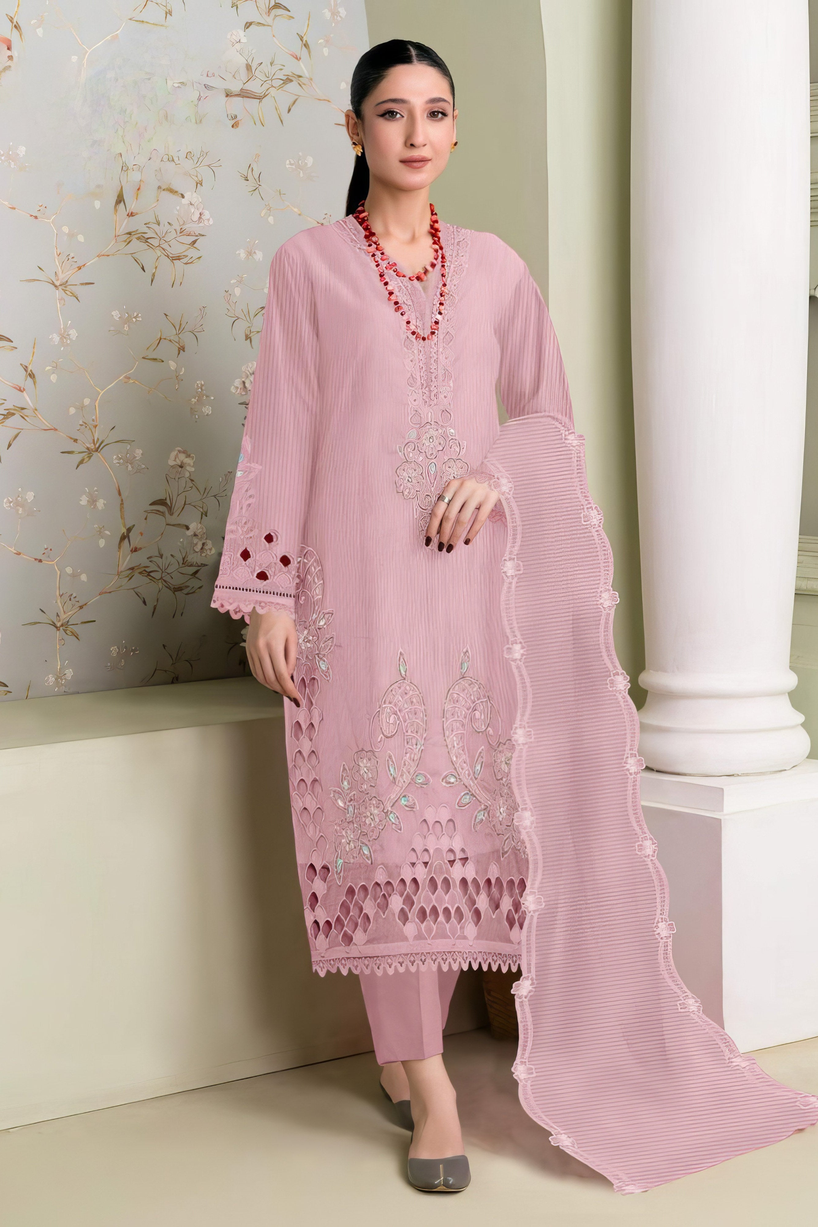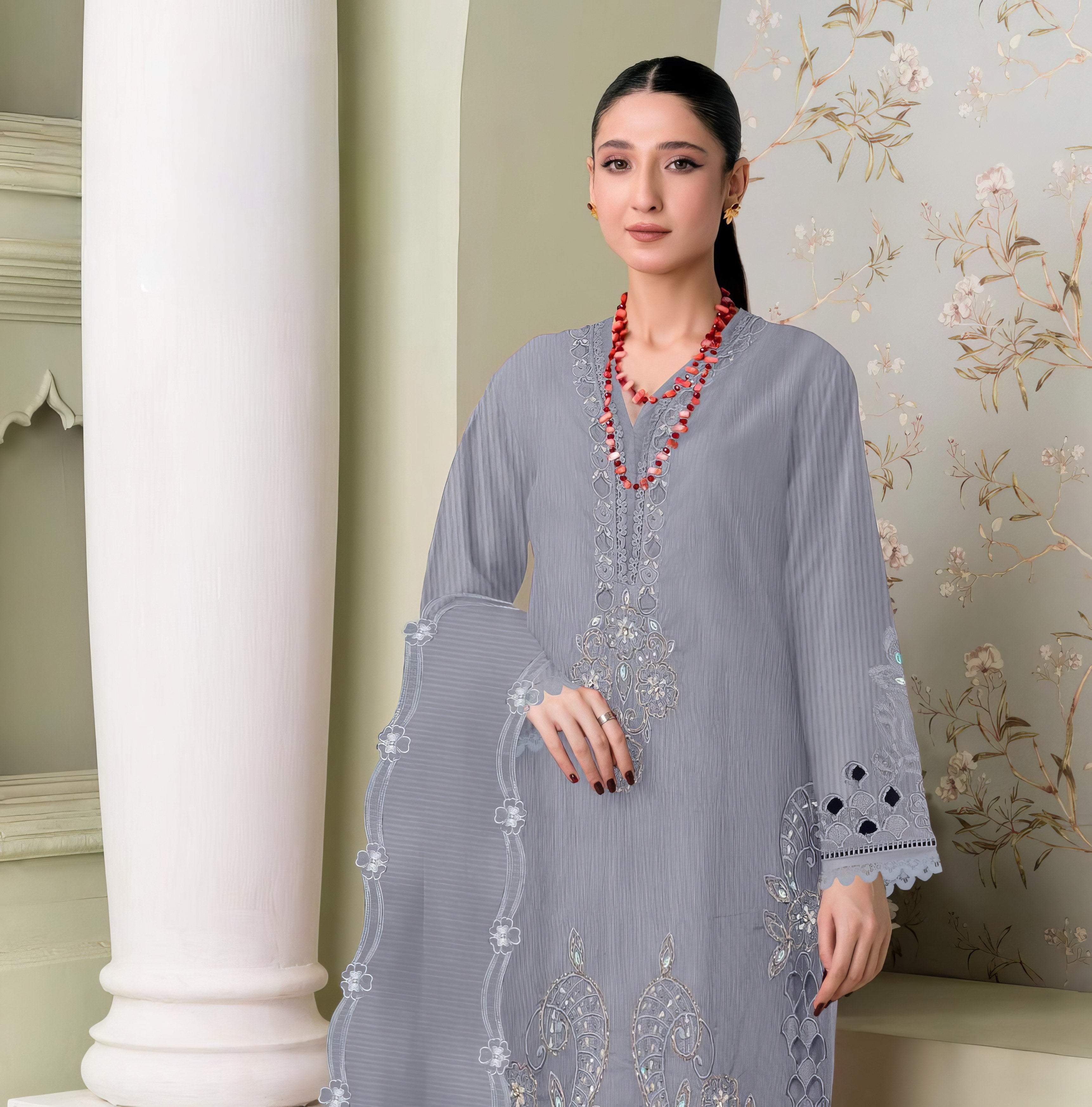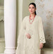 This designer tunic features gorgeous heavy embroidery and detailed handwork on both the tunic and sleeves for a rich, elegant appeal. Paired with a comfortable cotton lycra pant and a beautifully embroidered organza dupatta, this ensemble is a perfect blend of grace and glamour.