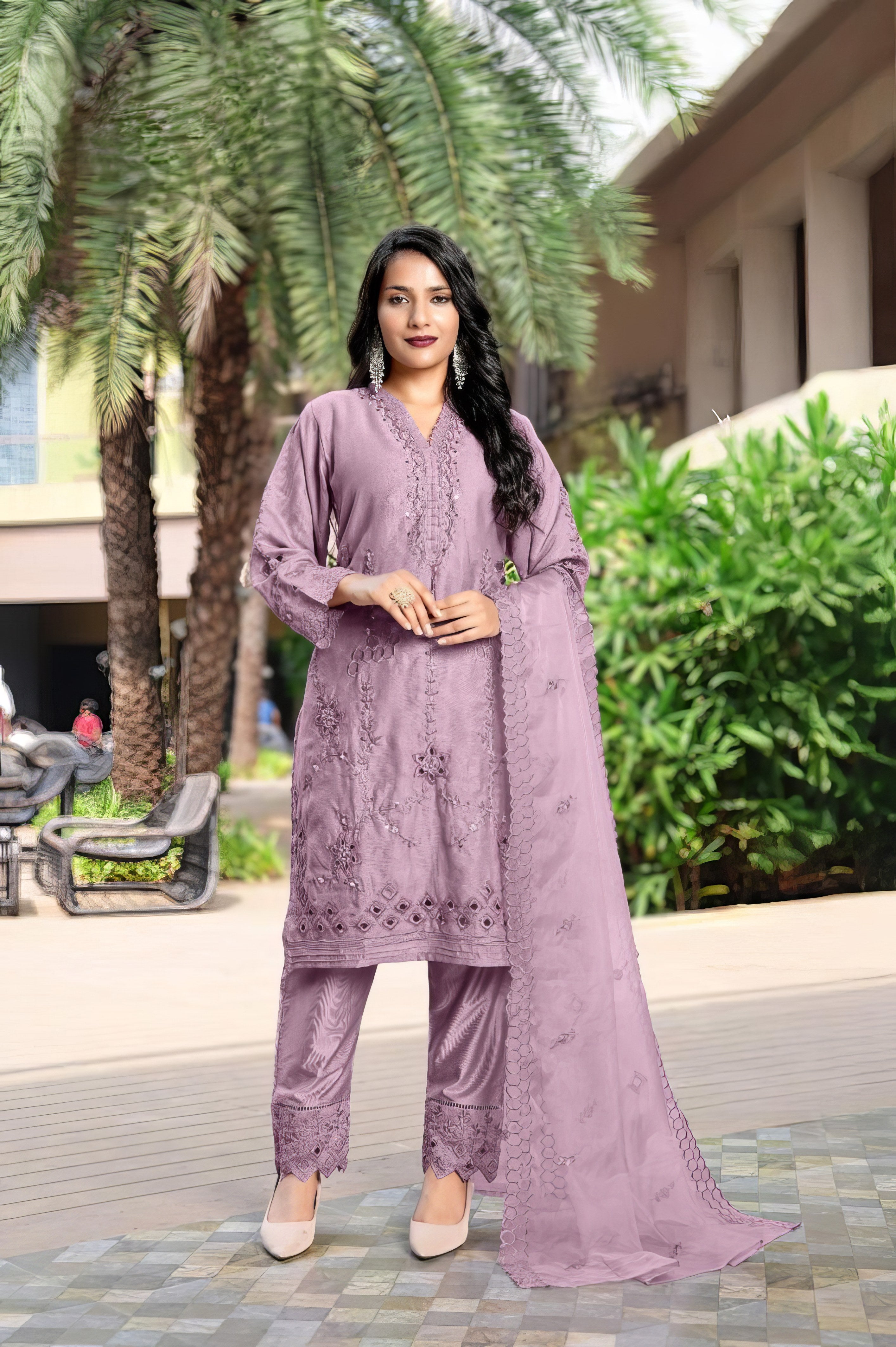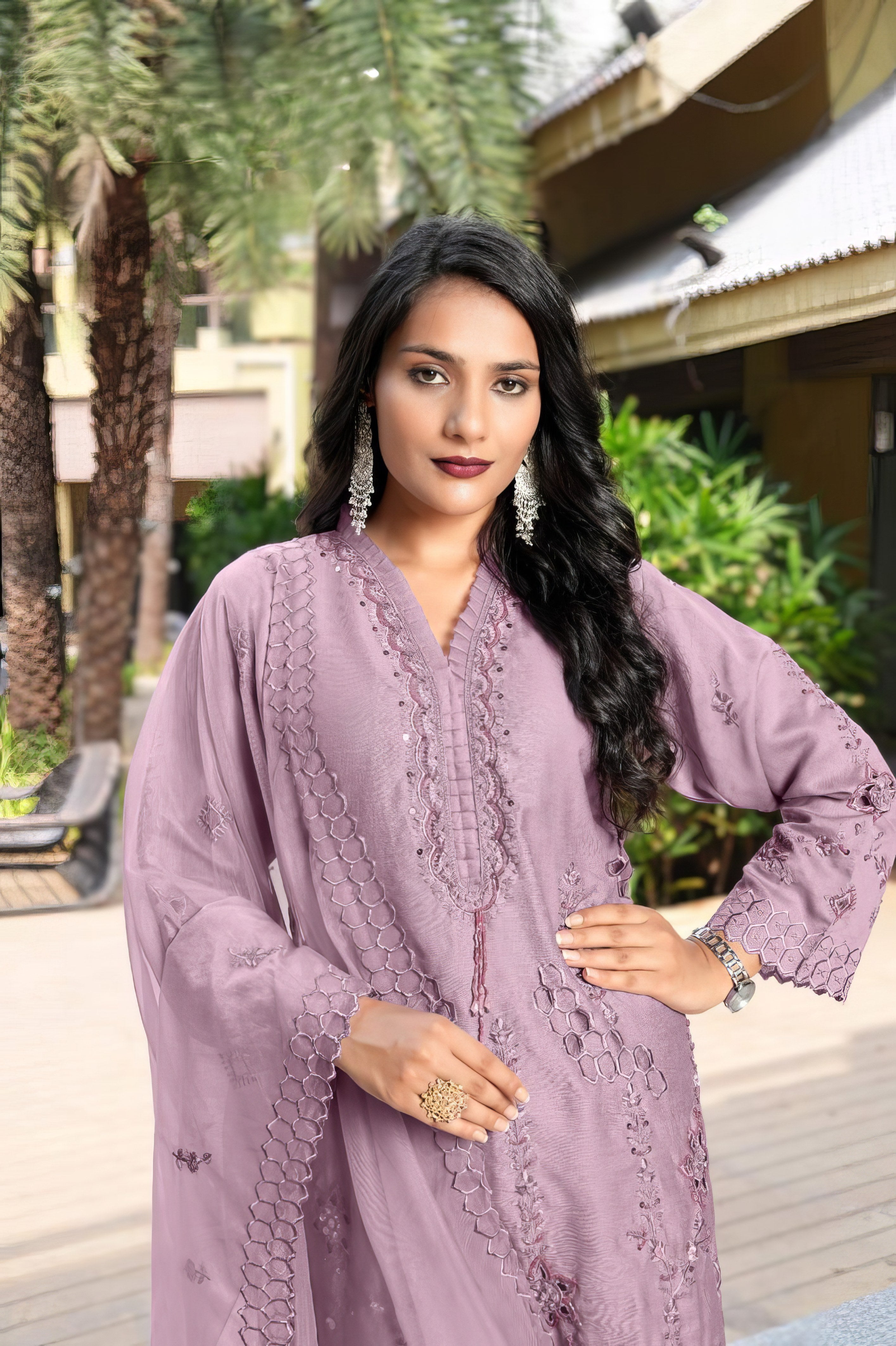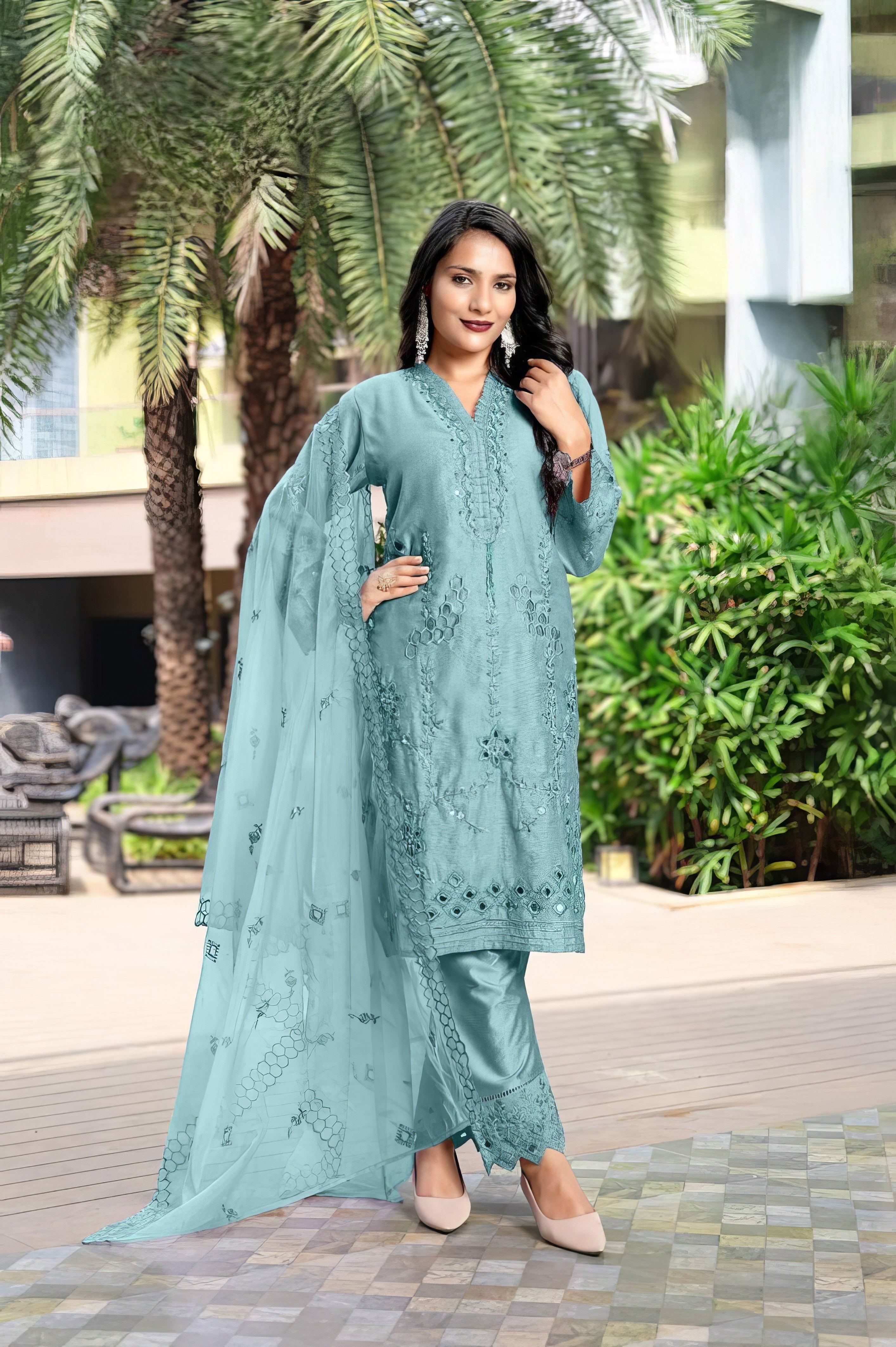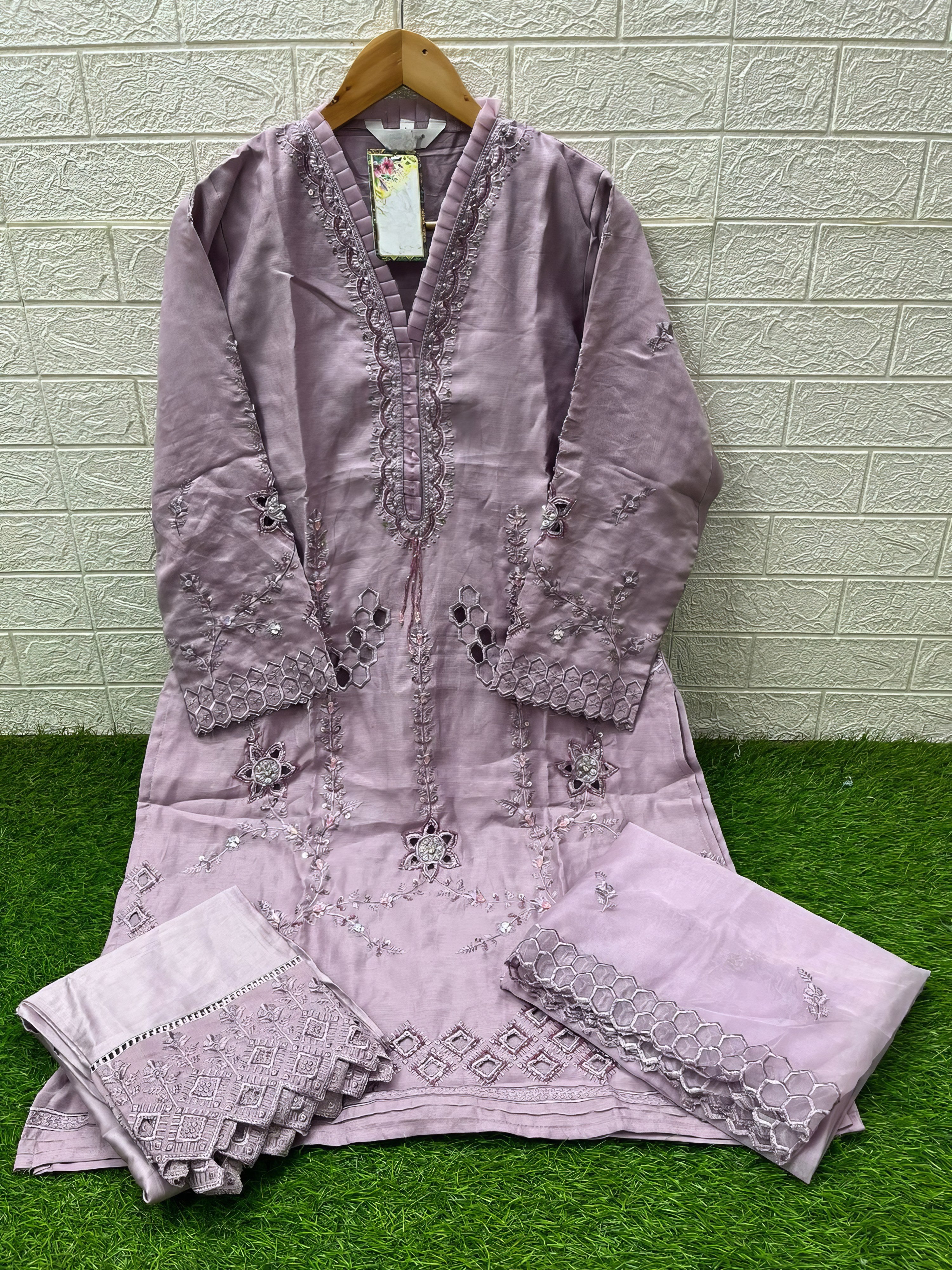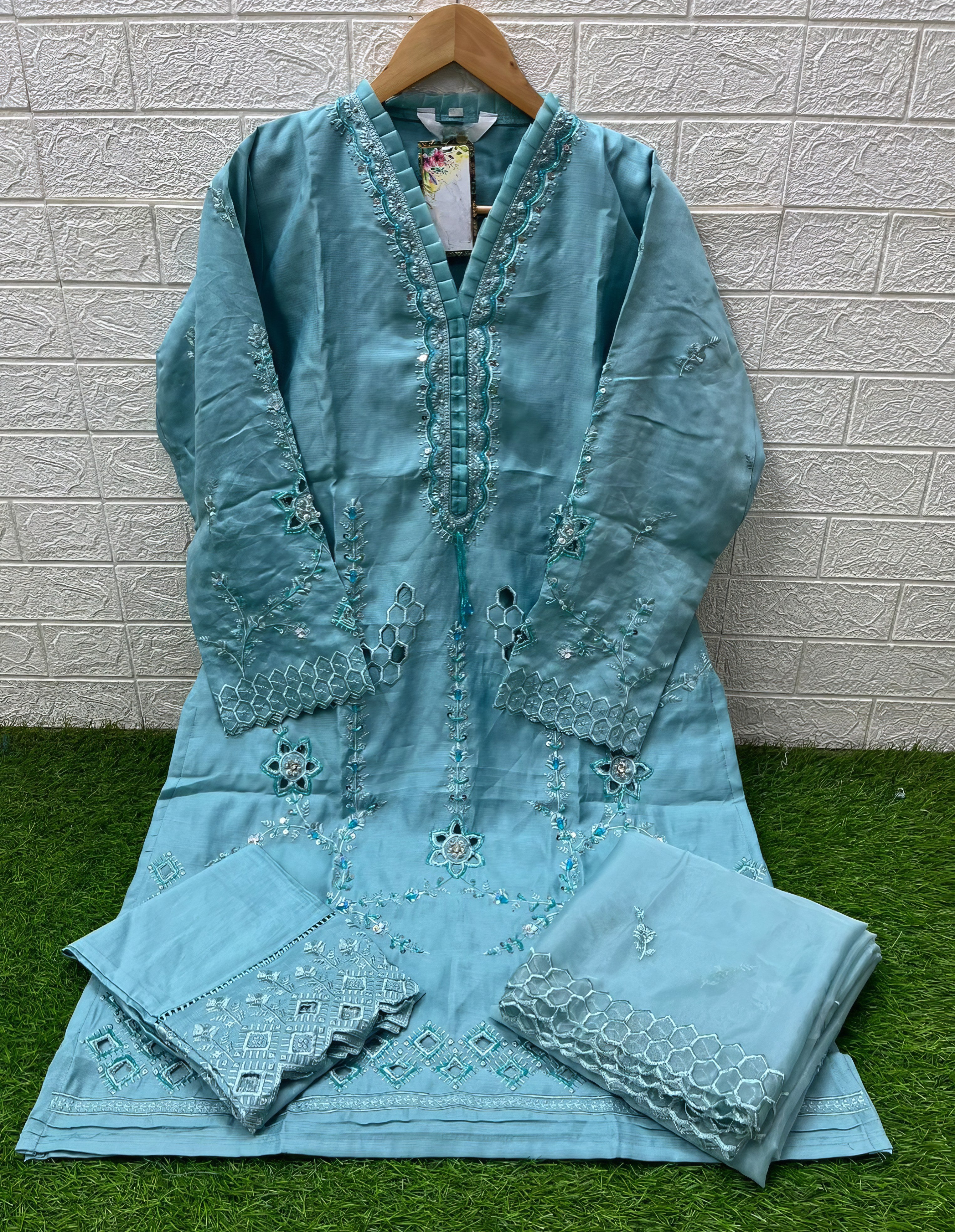 This designer tunic set showcases a beautifully crafted kurti in luxurious Lee Silk, featuring classic embroidery and delicate handwork on the front and sleeves. The look is completed with matching Lee Silk pants and an elegant embroidered organza dupatta, offering timeless style and festive charm.