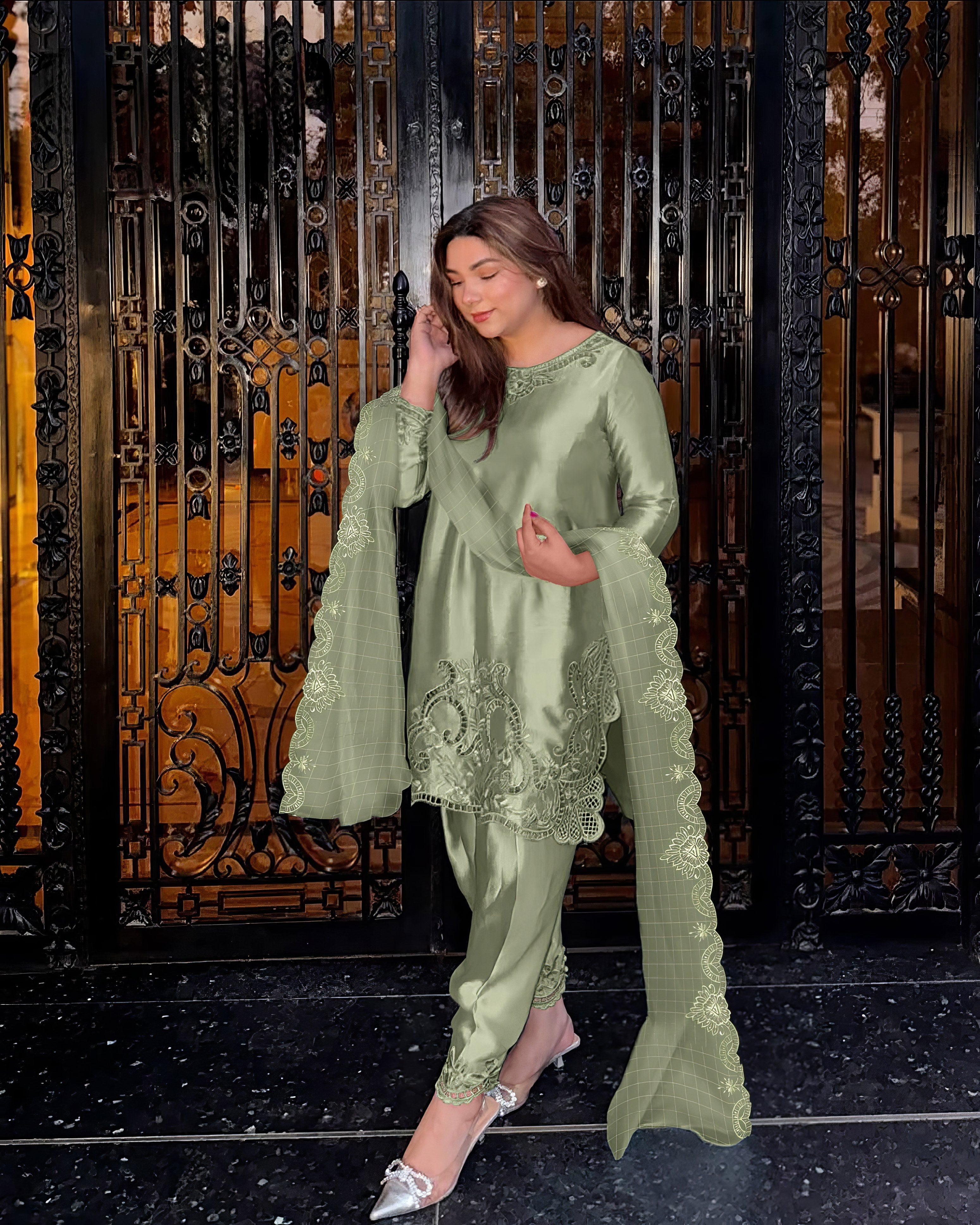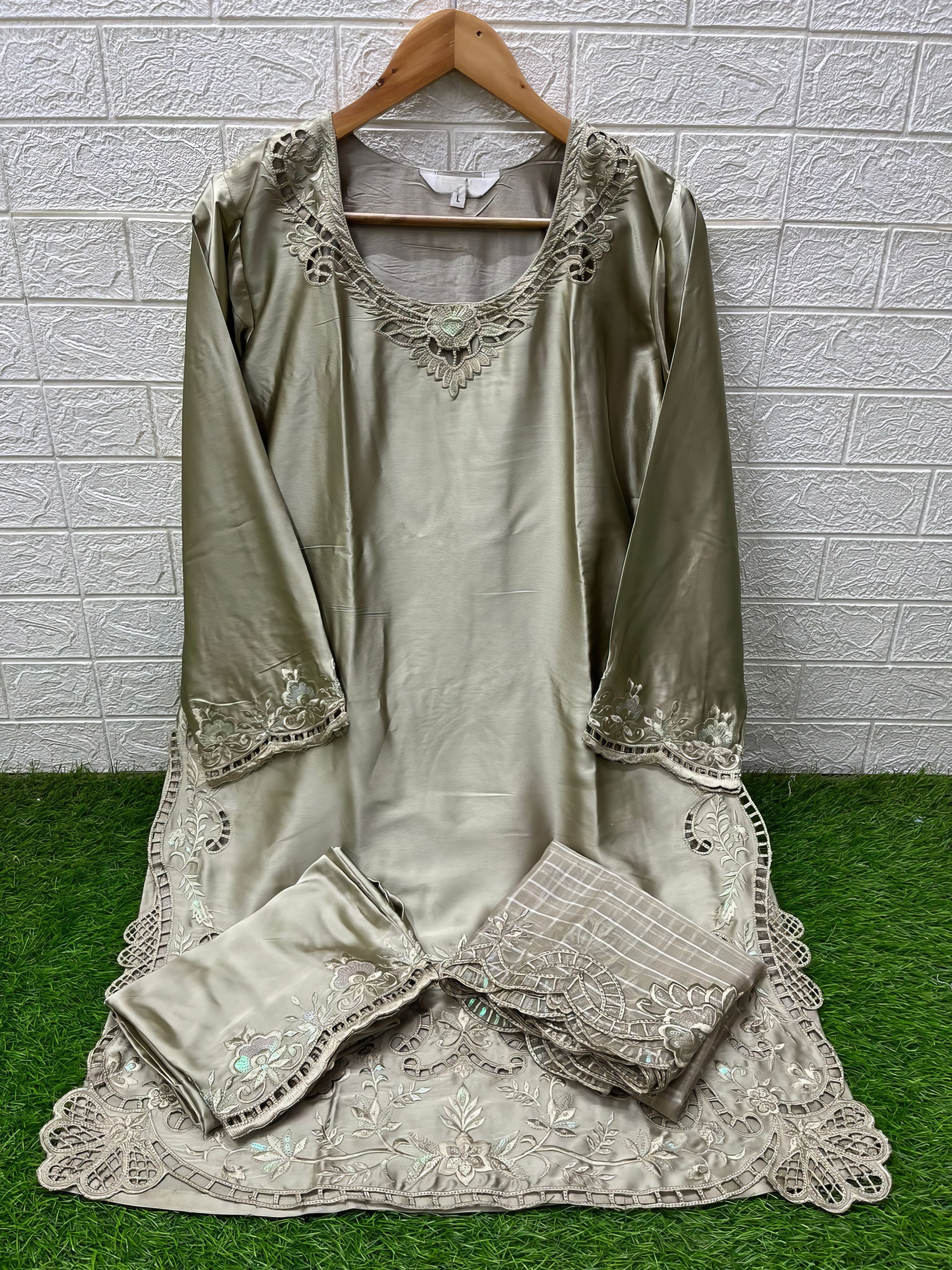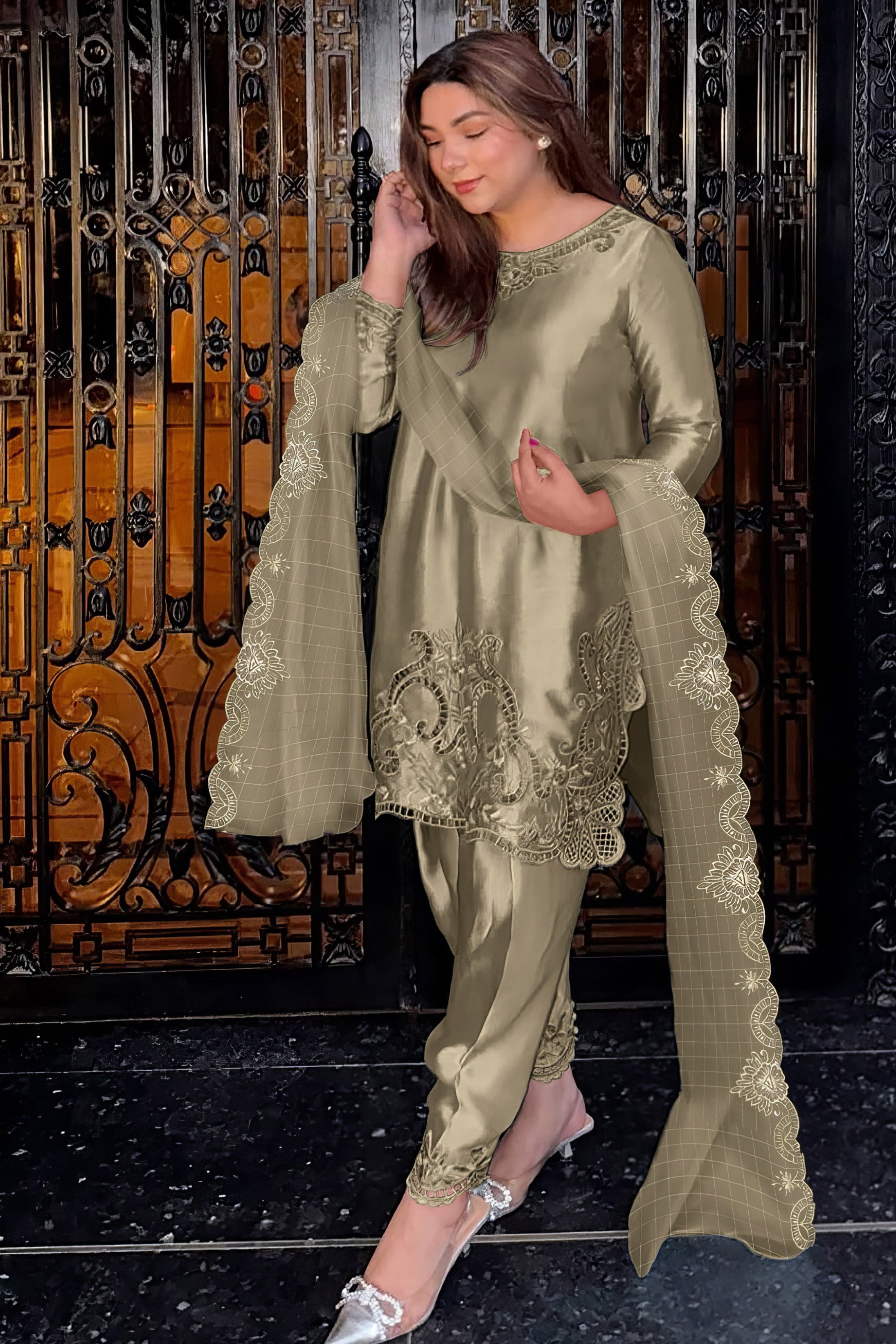This designer tunic set features a stylish satin kurti with classic sequin embroidery and elegant cut work, complemented by glamorously designed sleeves. Paired with matching satin pants and an intricately embroidered fancy organza dupatta, this ensemble exudes sophistication and festive flair.