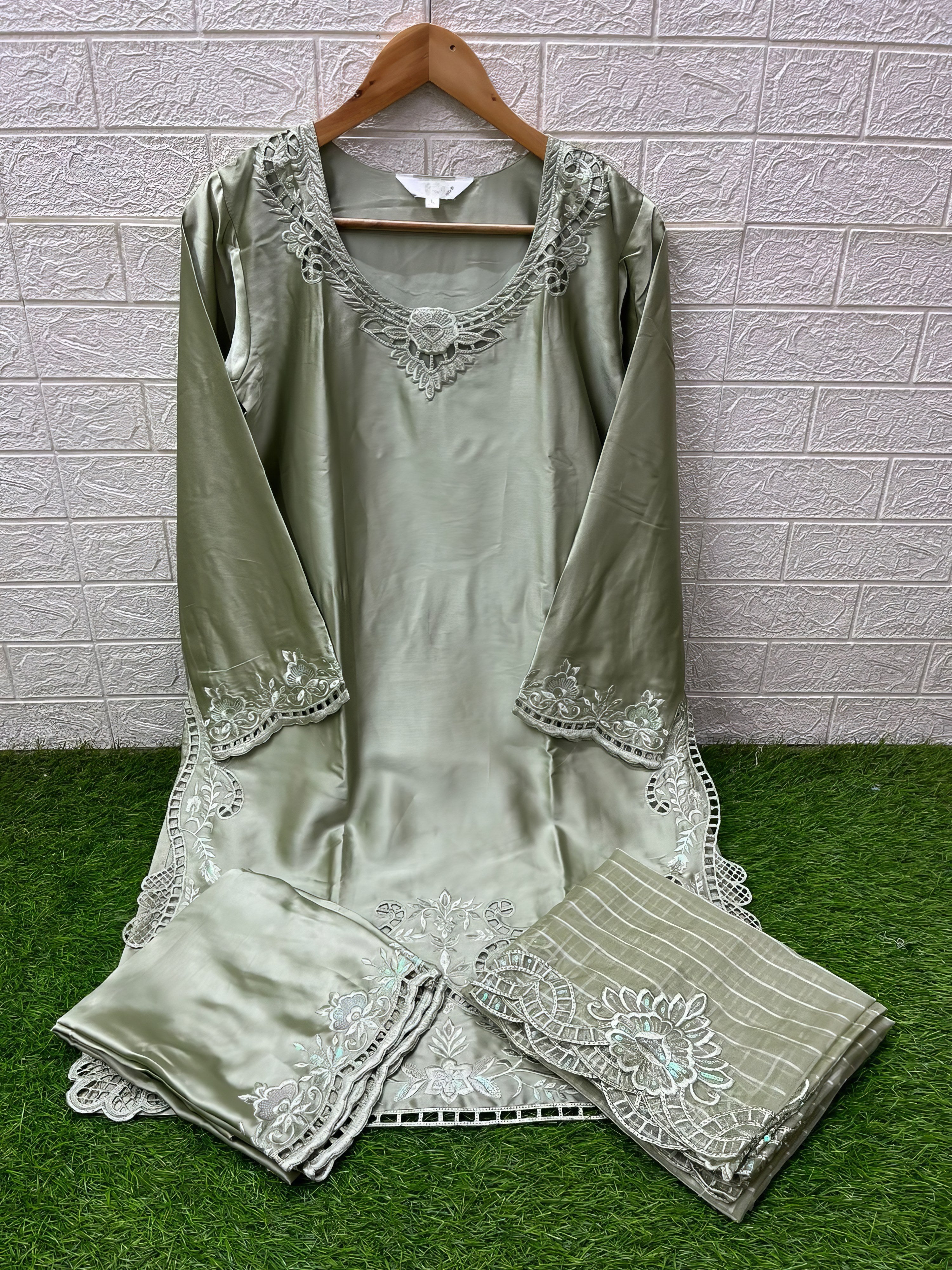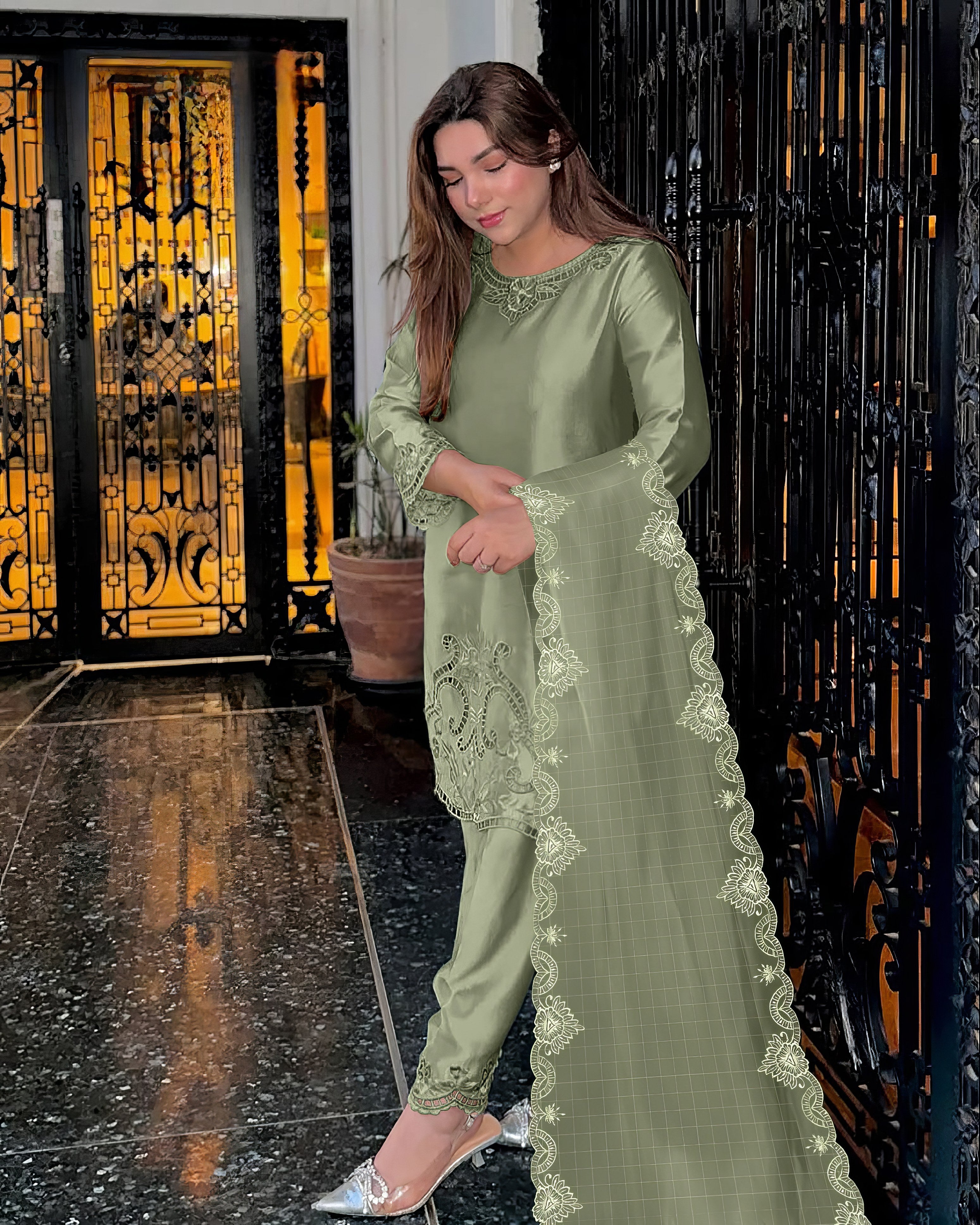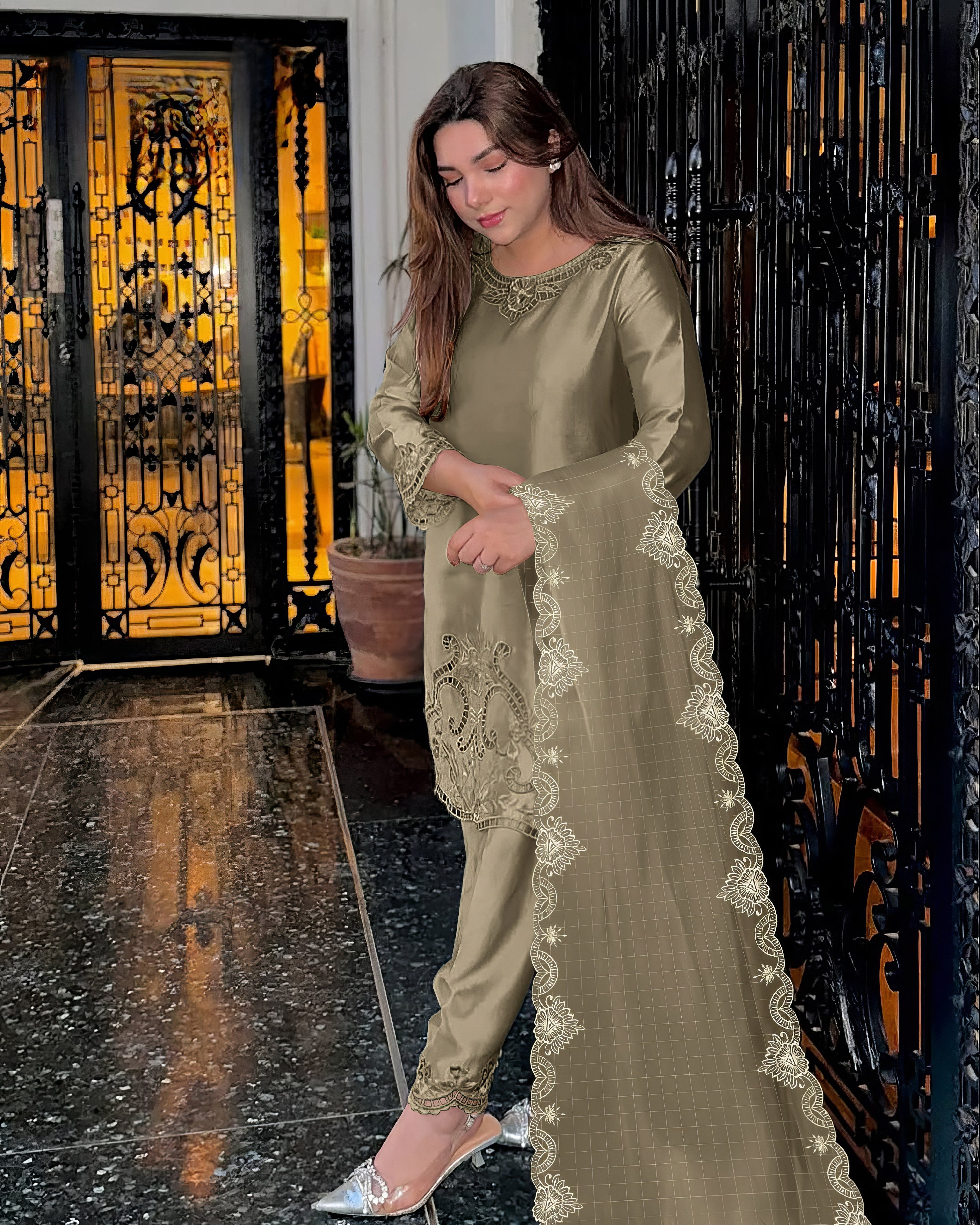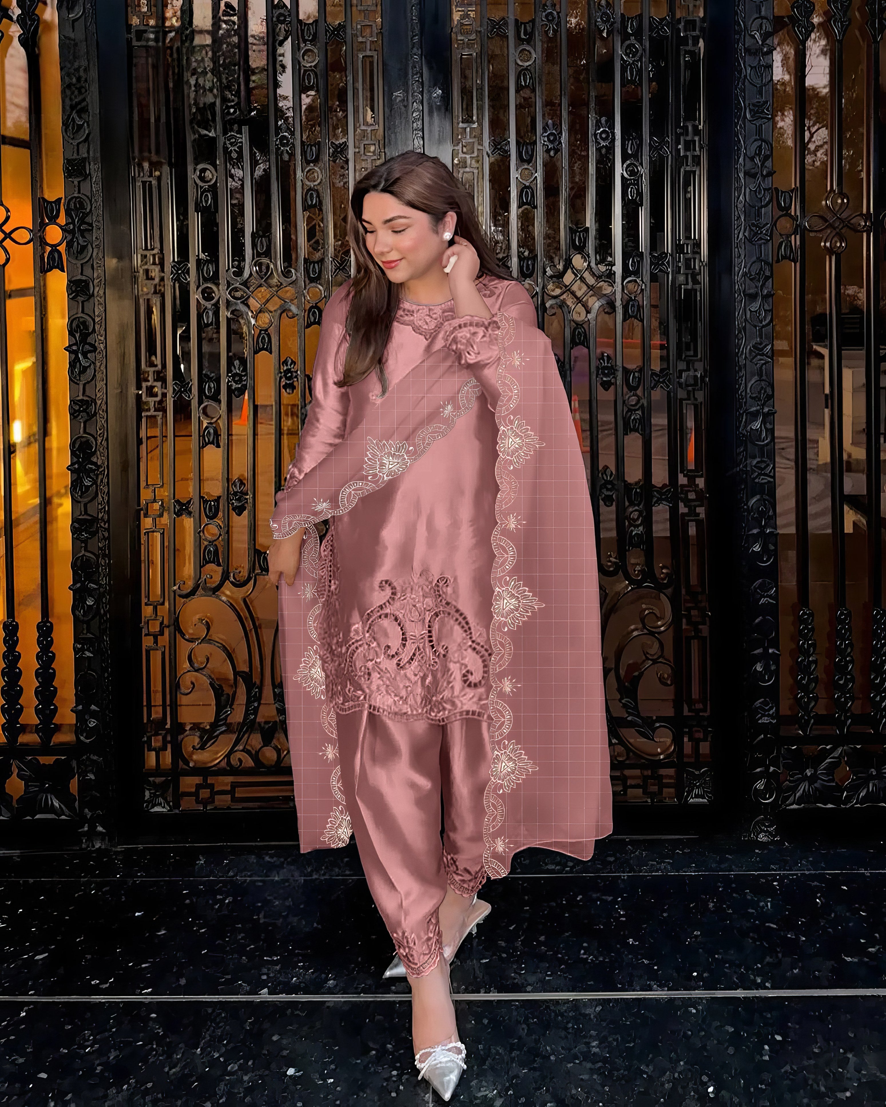 This designer tunic set features a stylish satin kurti with classic sequin embroidery and elegant cut work, complemented by glamorously designed sleeves. Paired with matching satin pants and an intricately embroidered fancy organza dupatta, this ensemble exudes sophistication and festive flair.