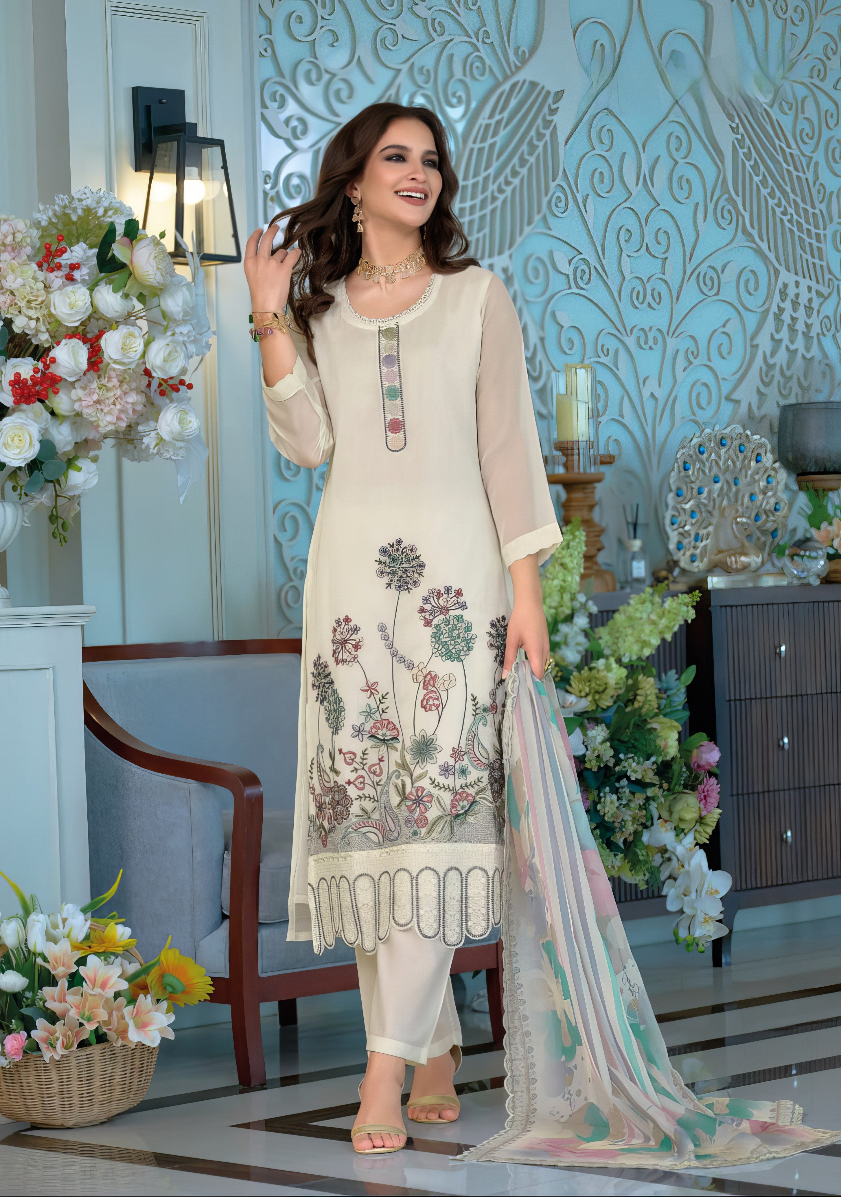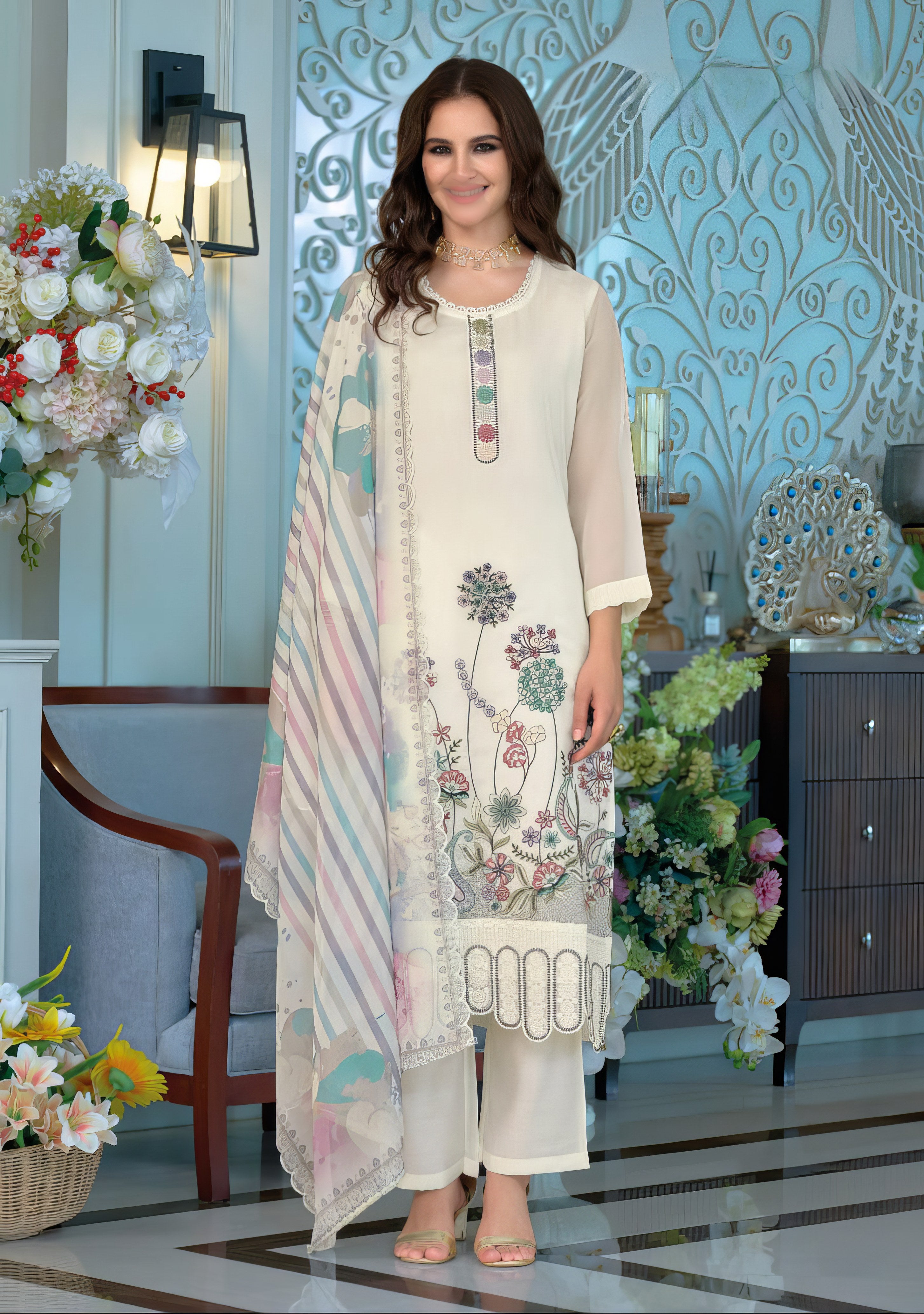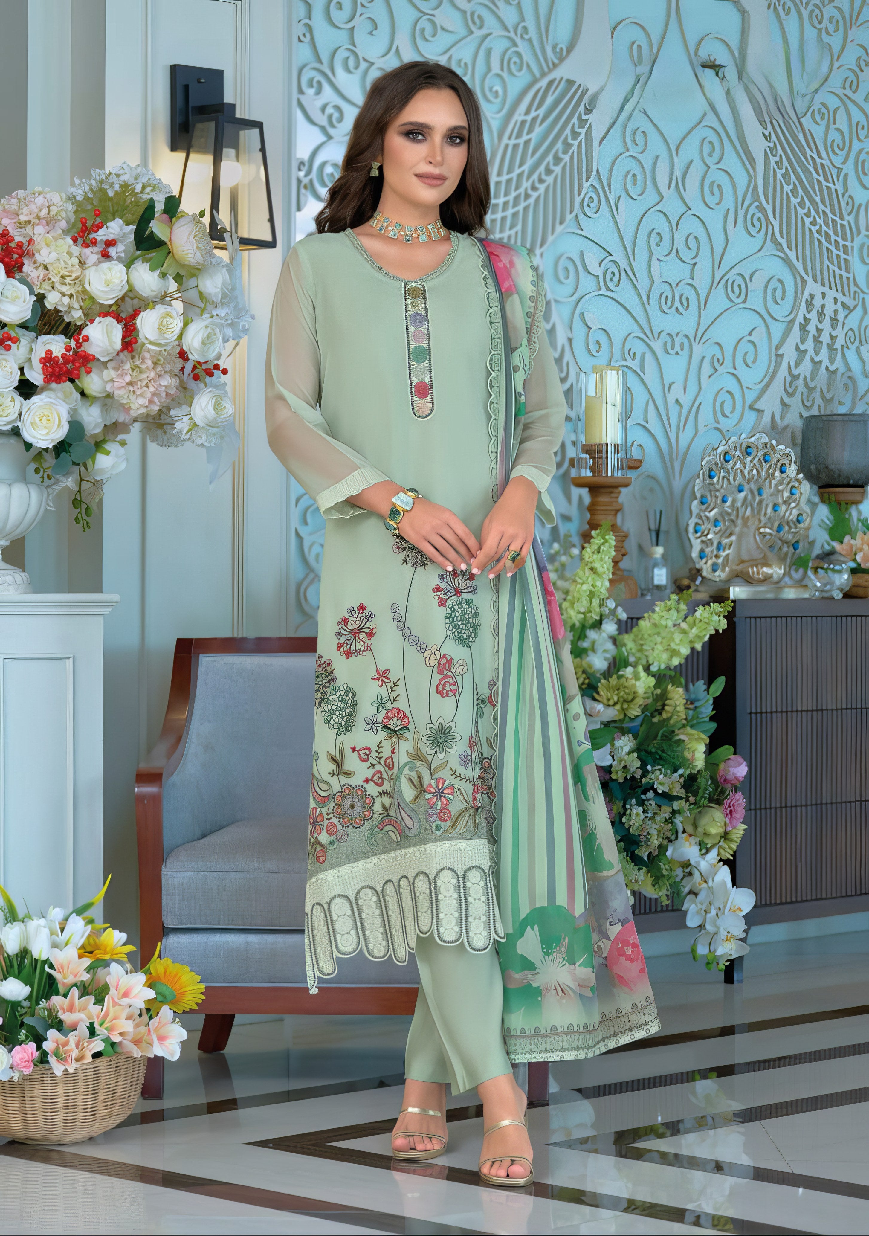 This elegant ensemble features a soft organza top adorned with intricate embroidery, creating a refined and graceful look. It is paired with a luxurious heavy silk bottom and a digitally printed organza dupatta that adds a modern artistic touch to the overall design.