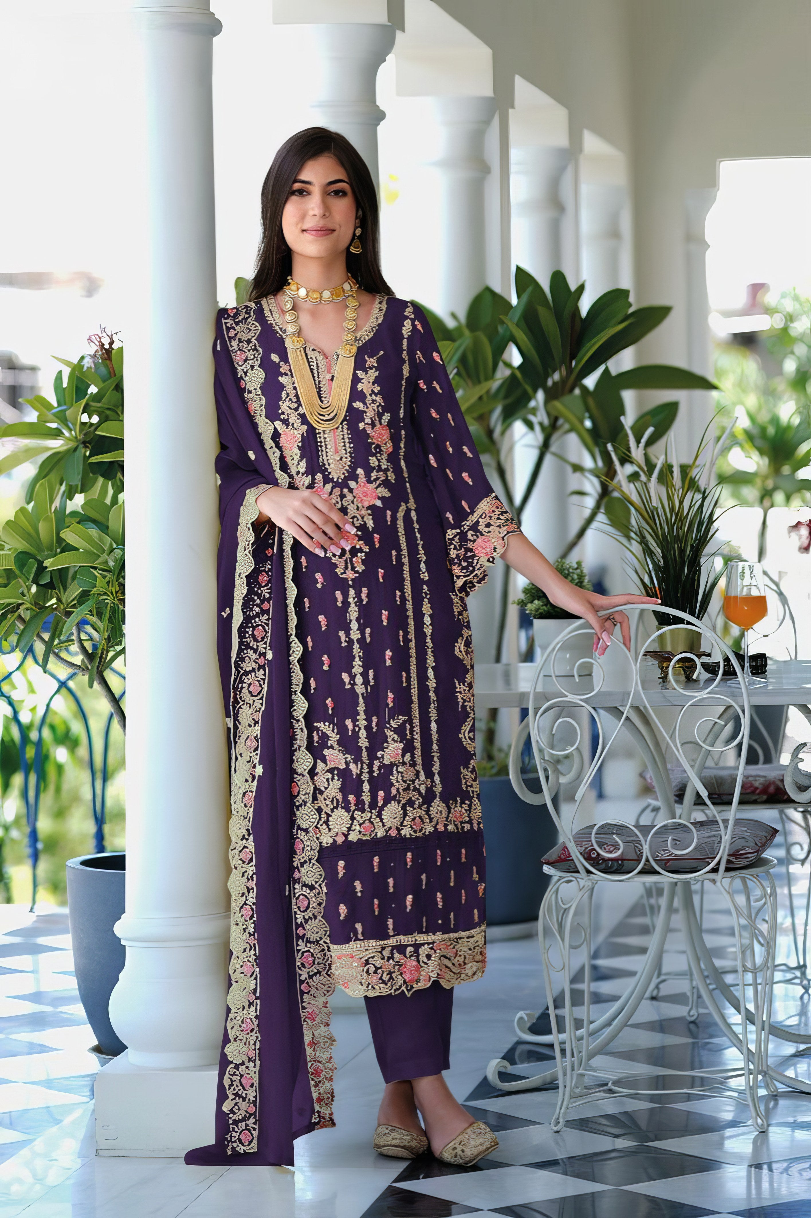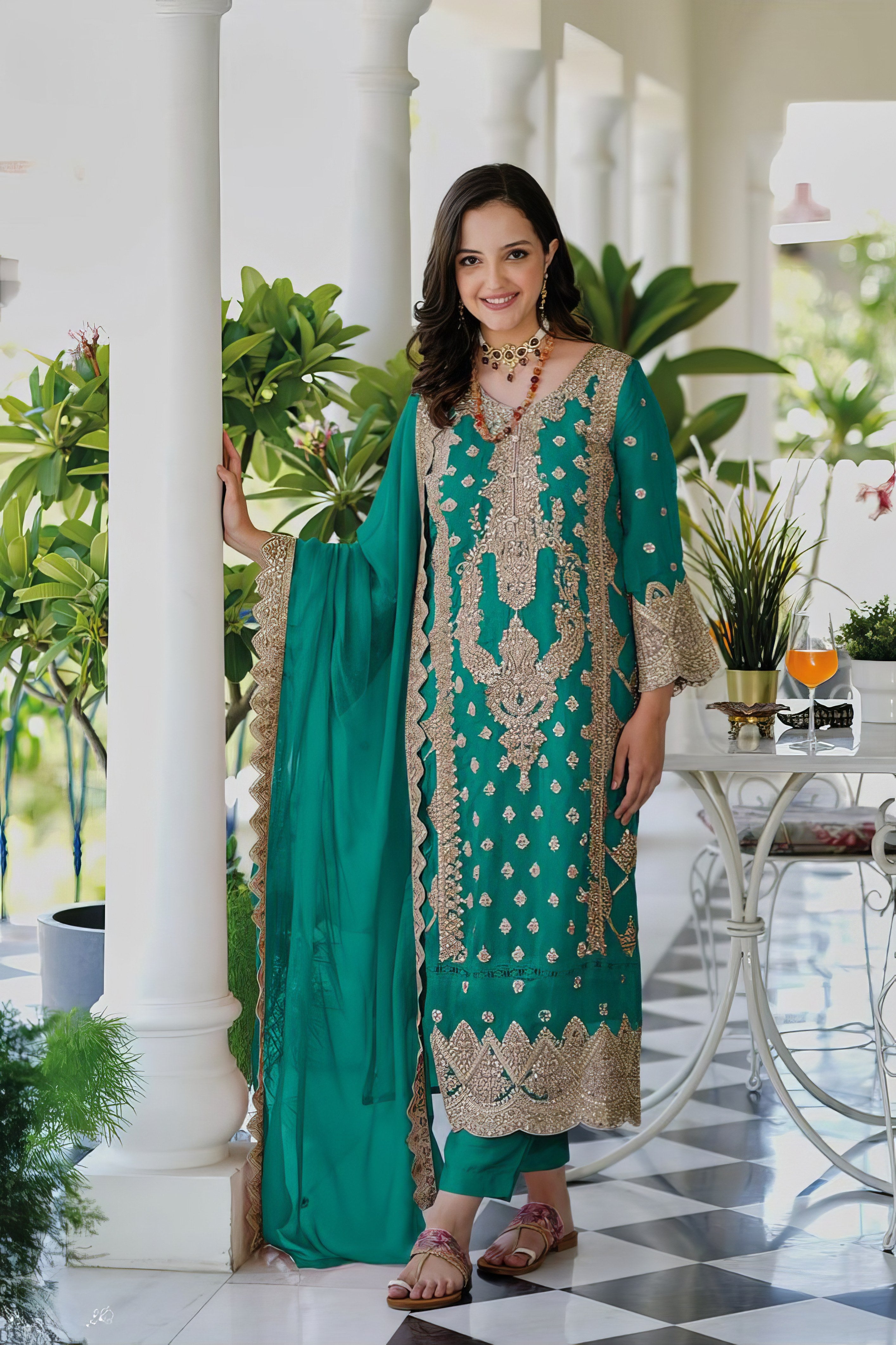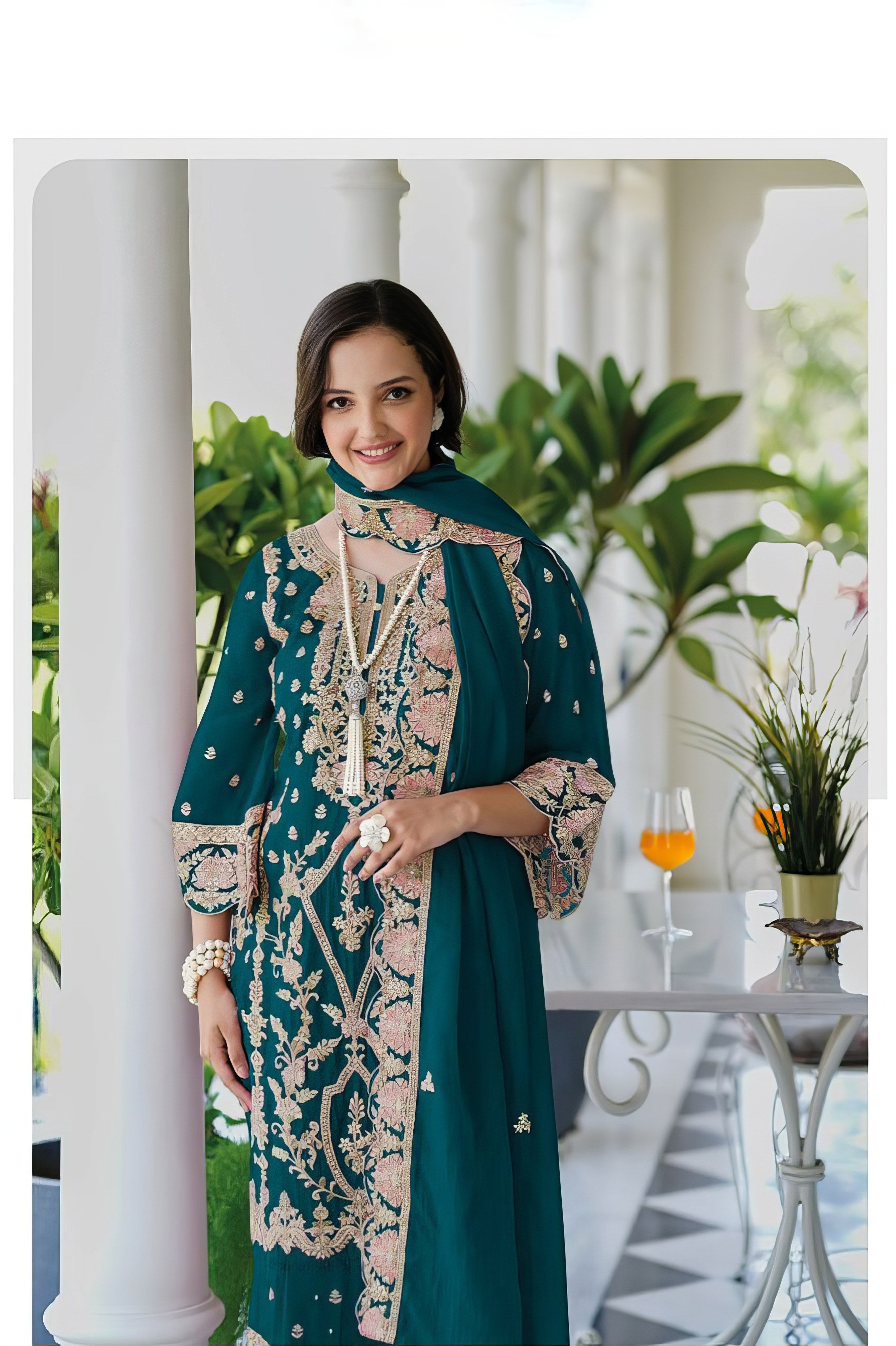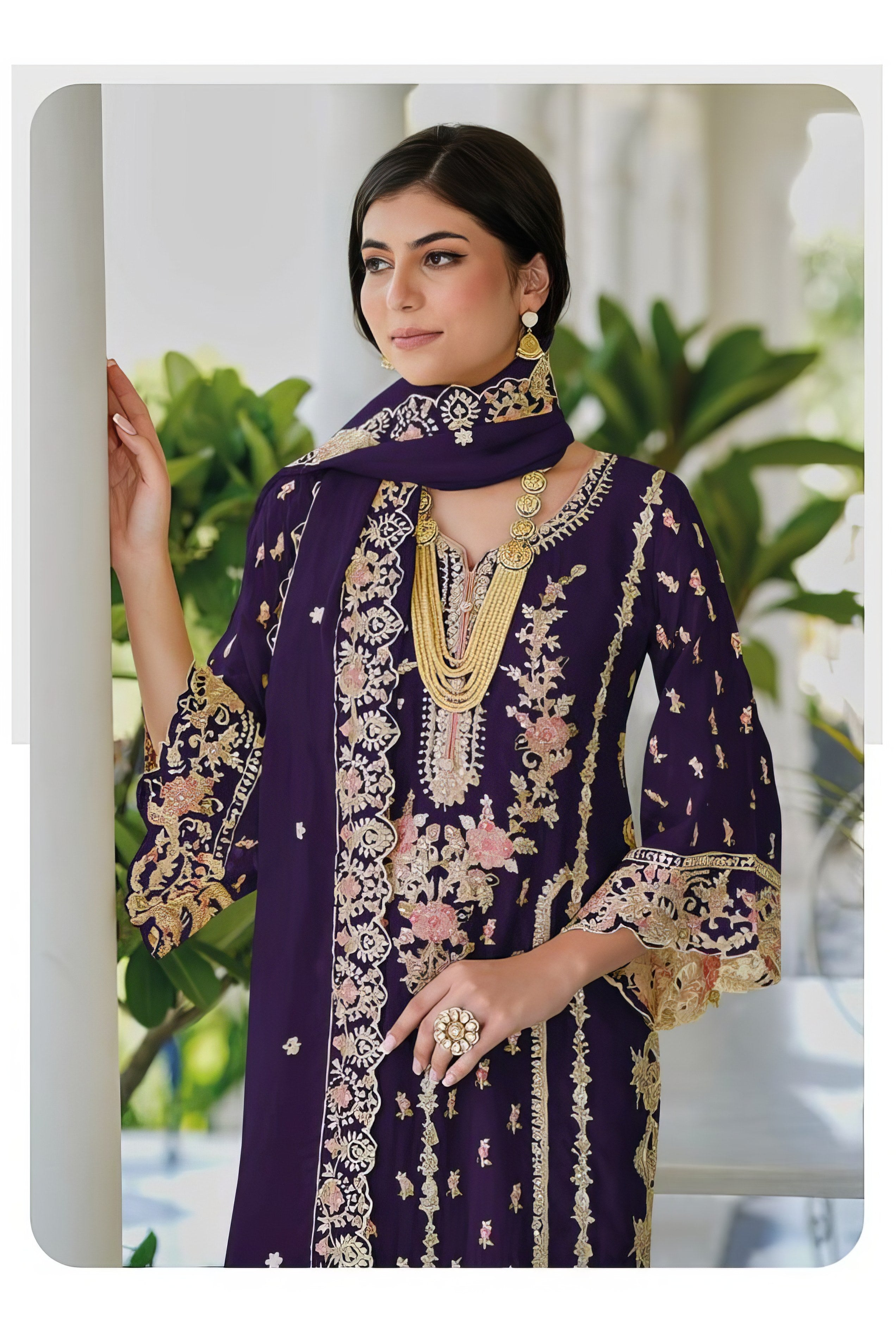 This elegant Pakistani suit features a beautifully crafted Soft Organza top adorned with delicate floral embroidery, bringing out a timeless charm. It is paired with a luxurious Heavy Silk bottom that adds richness to the overall look. The matching Soft Organza dupatta with elegant embroidery completes the ensemble, making it a graceful choice for refined occasions.