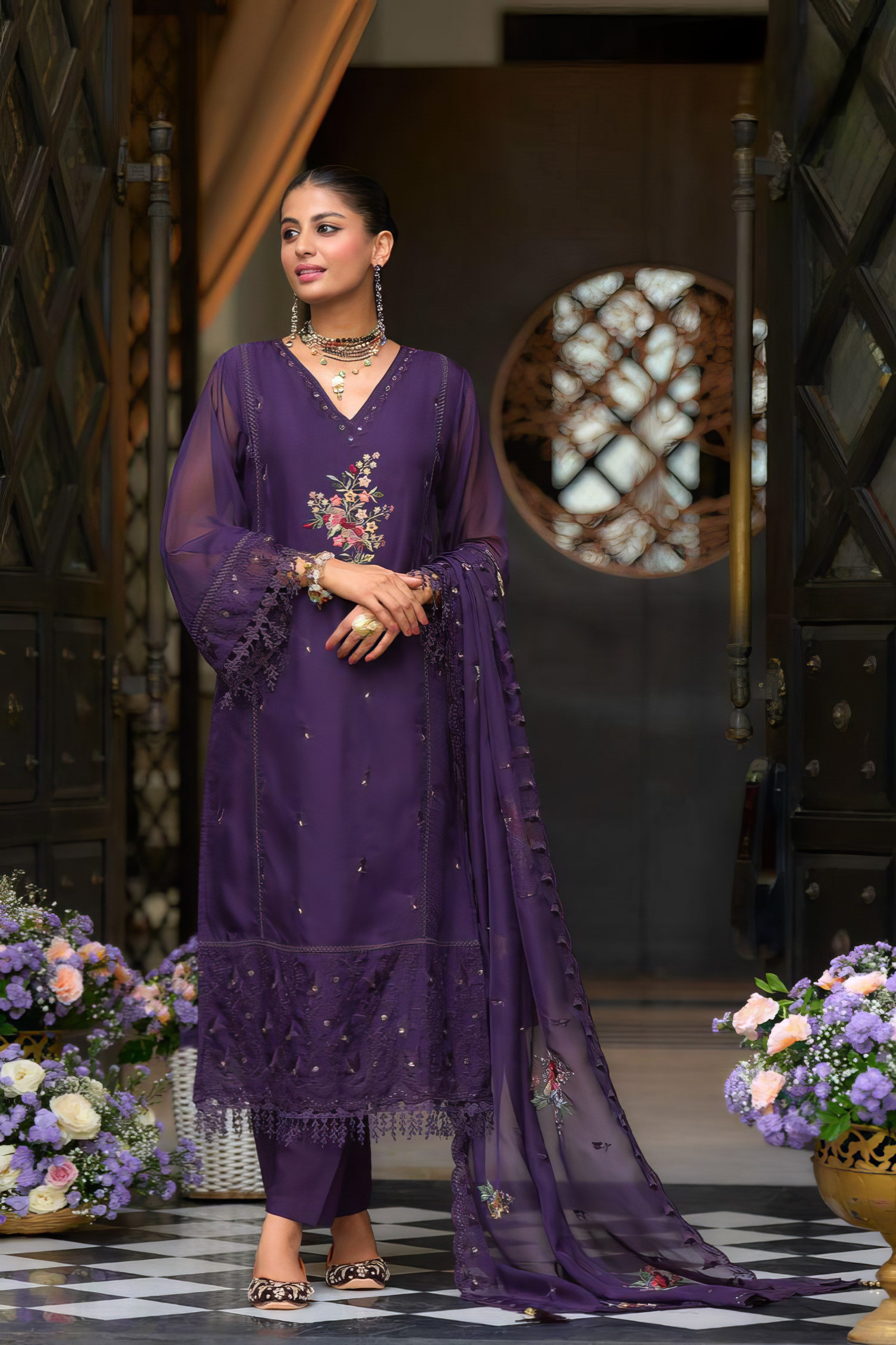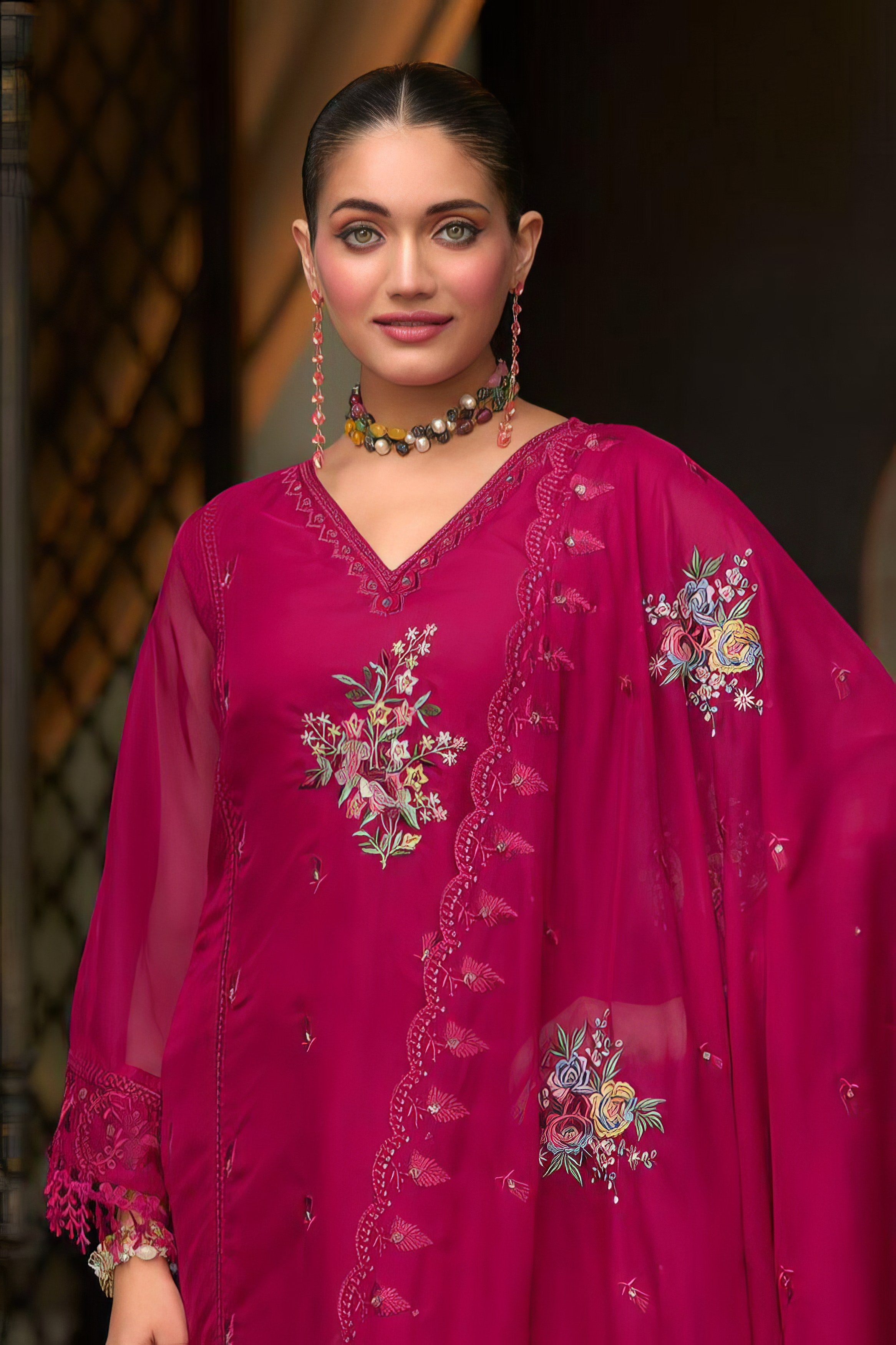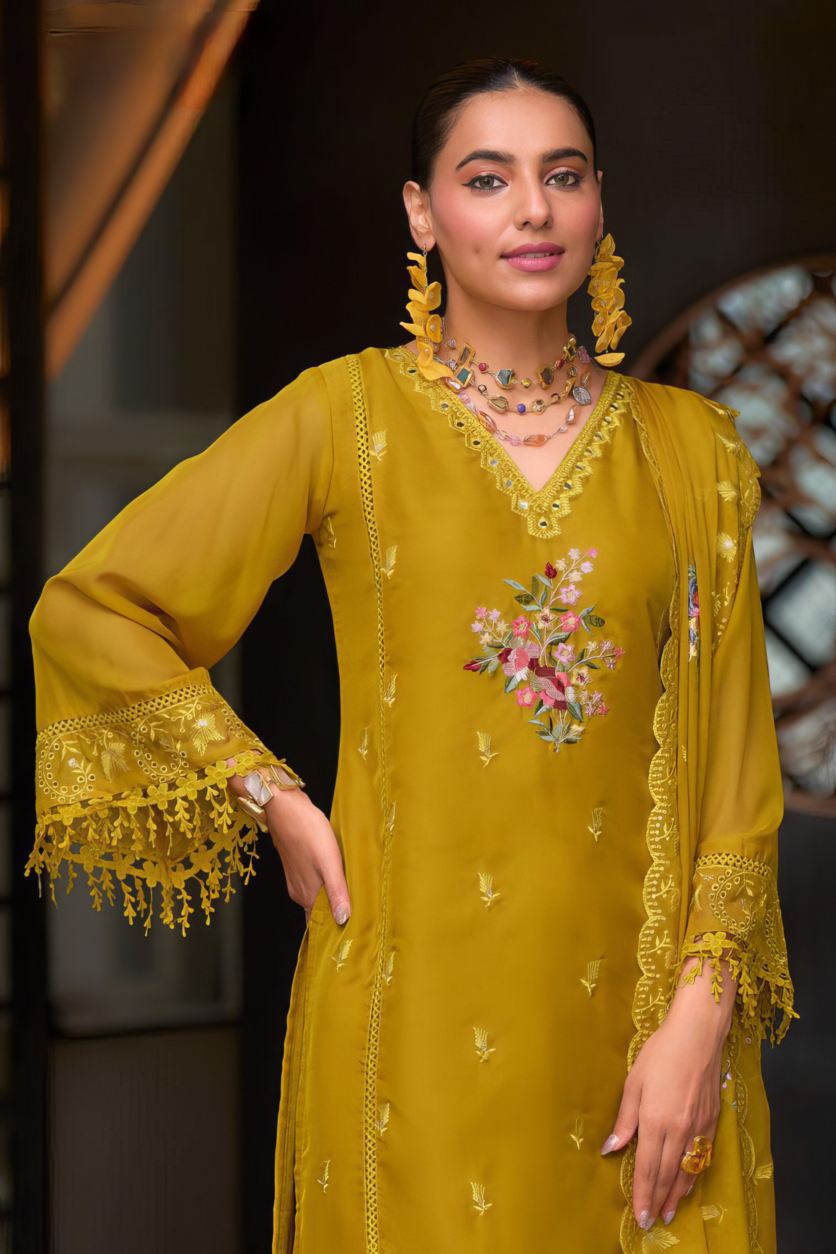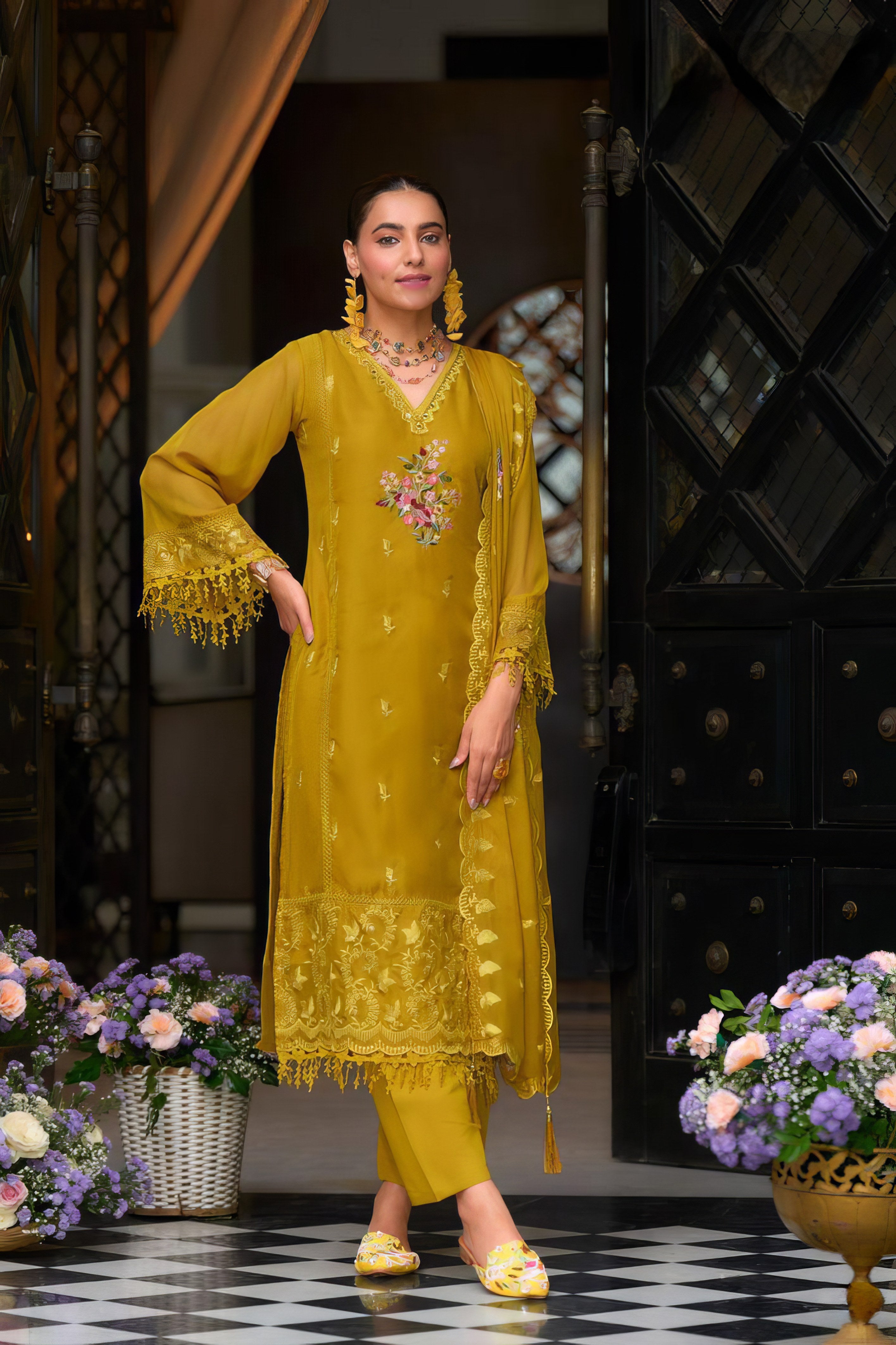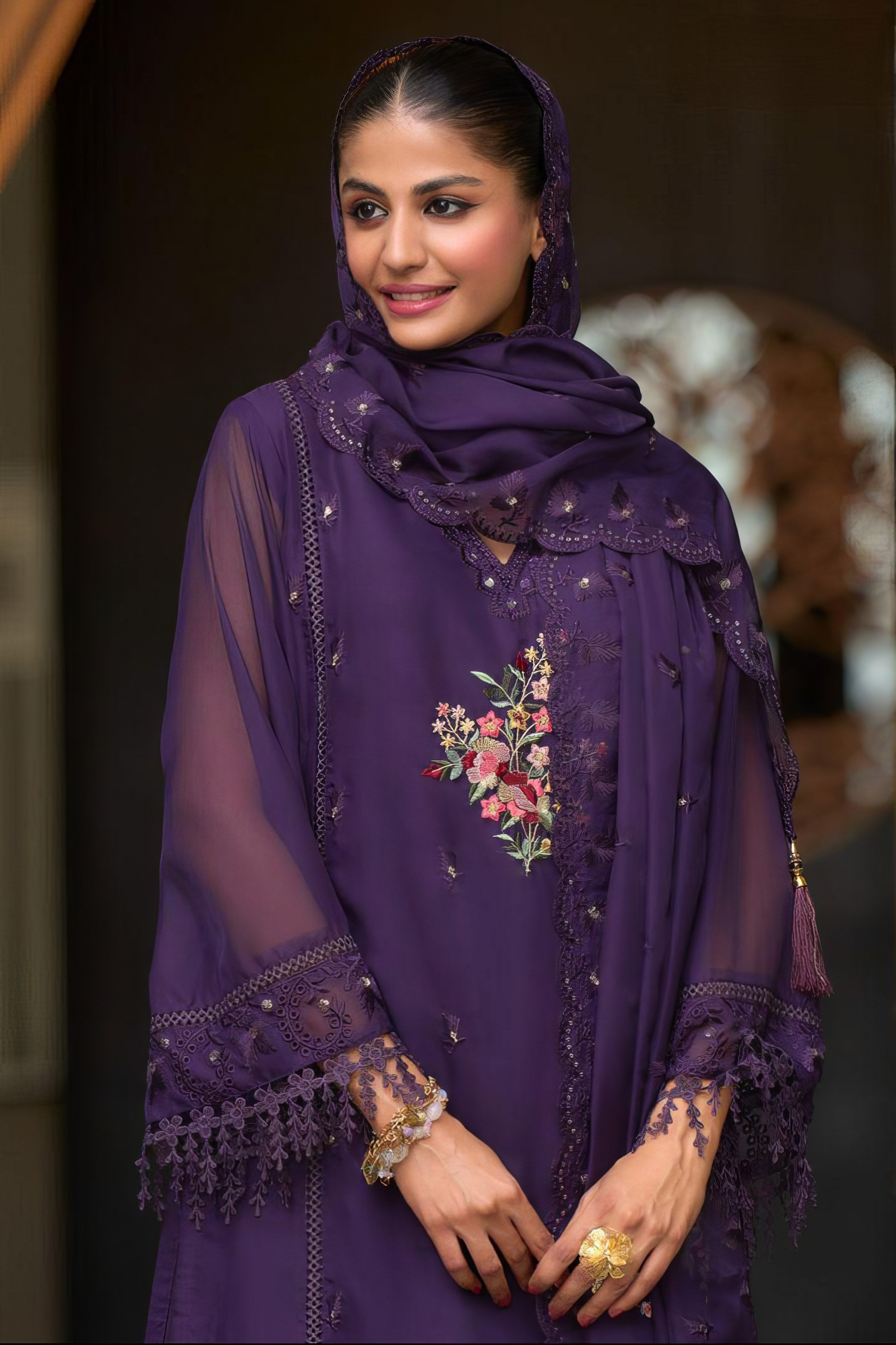 This graceful Pakistani suit features a soft blooming organza top intricately embellished with floral embroidery, traditional khatli handwork, and finished with premium GPU lace for an elegant edge. It is paired with a rich heavy silk bottom that adds depth and contrast. The soft blooming organza dupatta, highlighted with delicate embroidery, completes the ensemble with effortless charm.