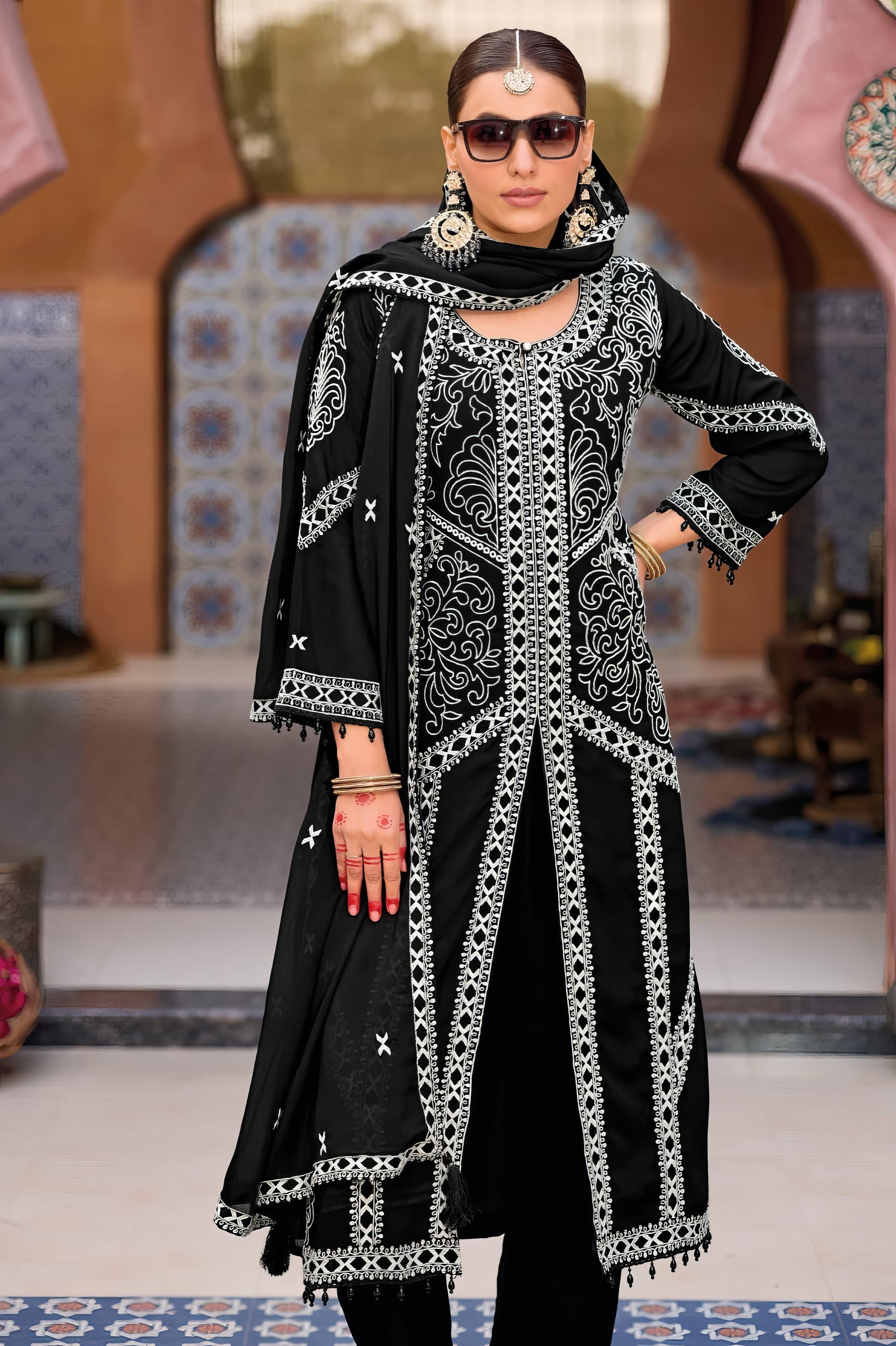 This elegant set is crafted from luxurious chinon fabric highlighted with intricate embroidery. The heavy chinon top showcases detailed embroidery that adds richness to the outfit. The pant, designed in chinon with fine embroidery, offers both style and comfort. Completing the look is a beautifully embroidered heavy chinon dupatta, giving the set a refined and graceful finish.