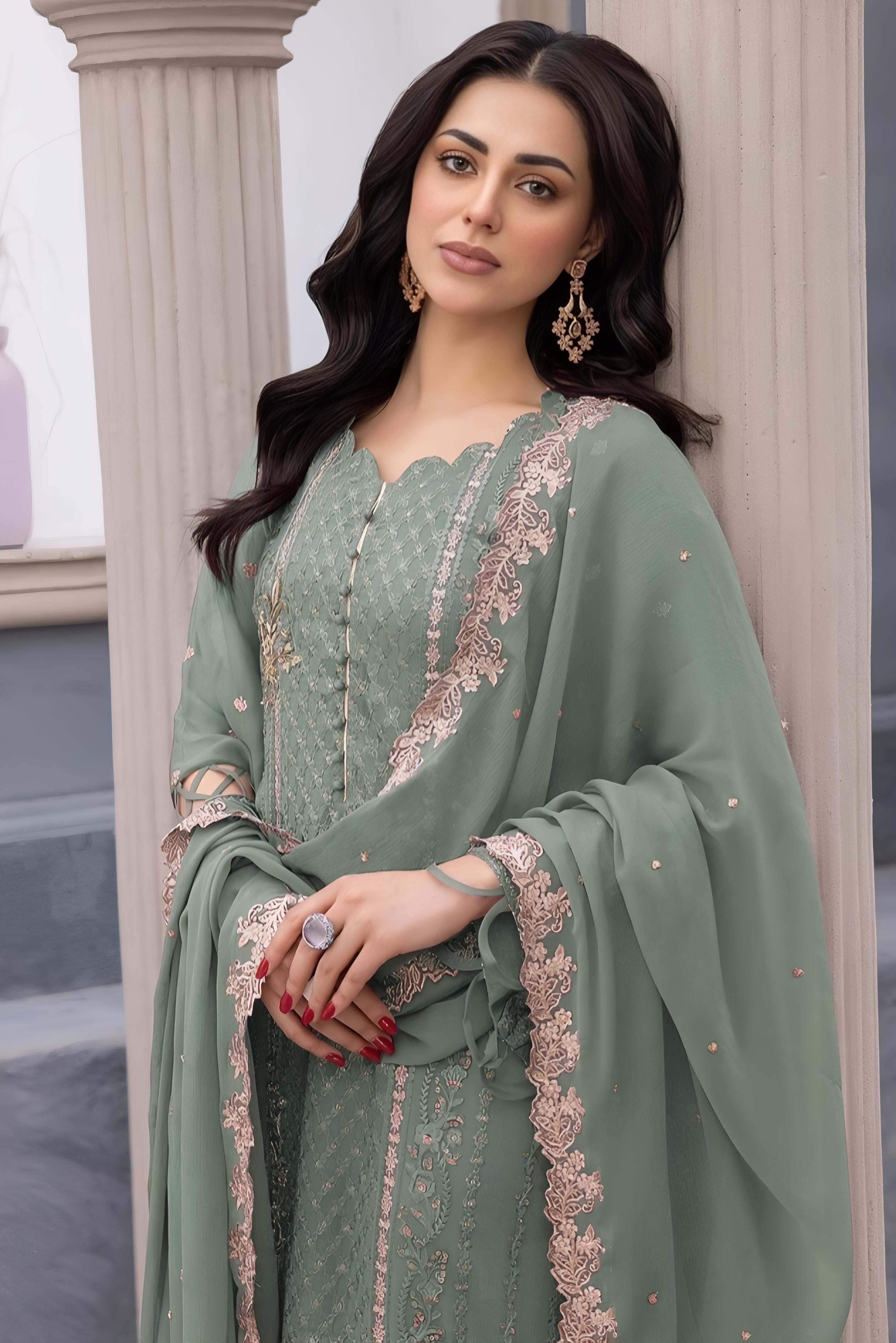 Elegant and effortlessly festive, Foxira Latkan combines the charm of heavy embroidery with the graceful flow of Fox Georgette. Embellished with delicate sequence work and playful latkan accents, this suit set brings refined celebration-ready style.
