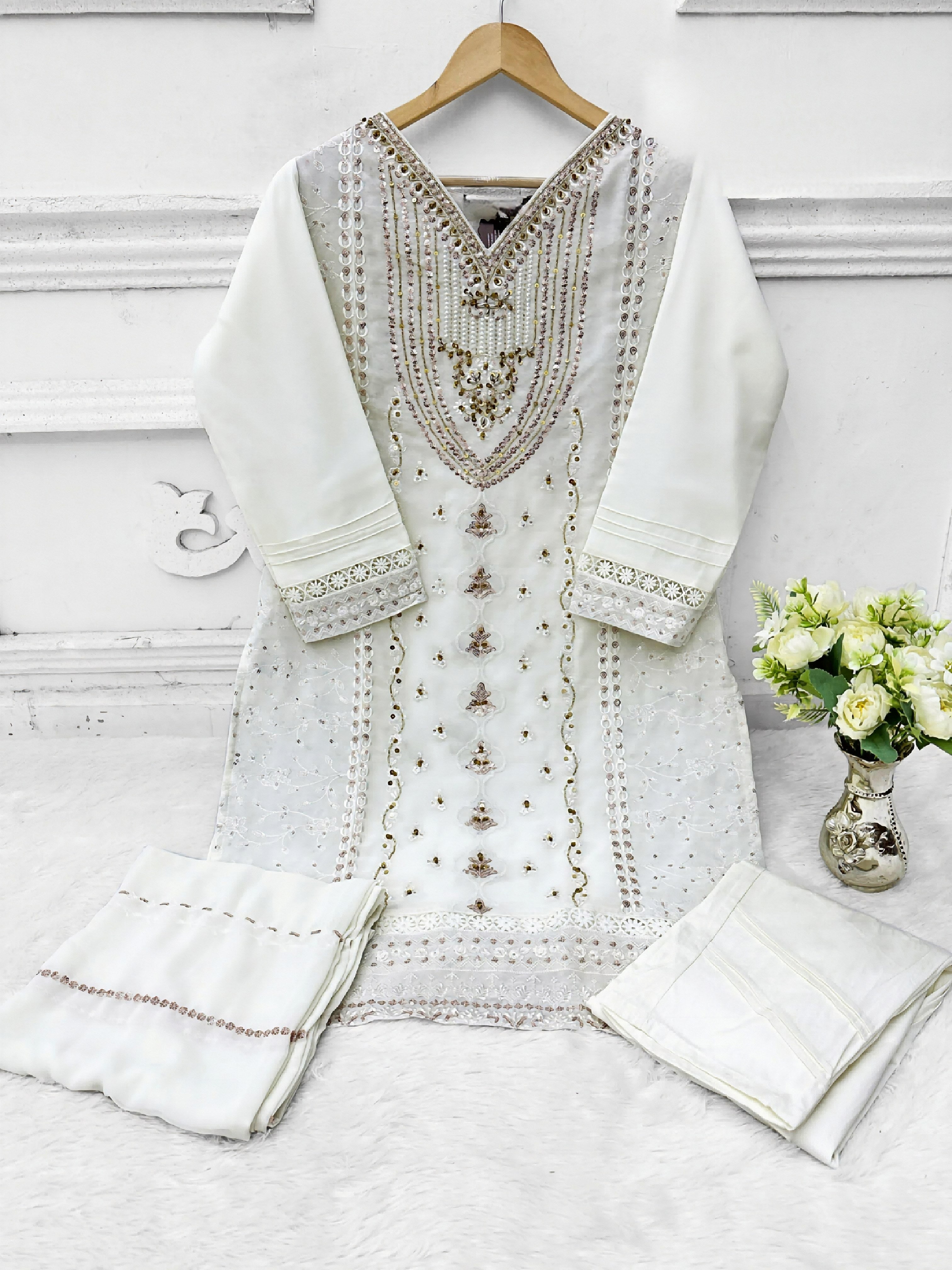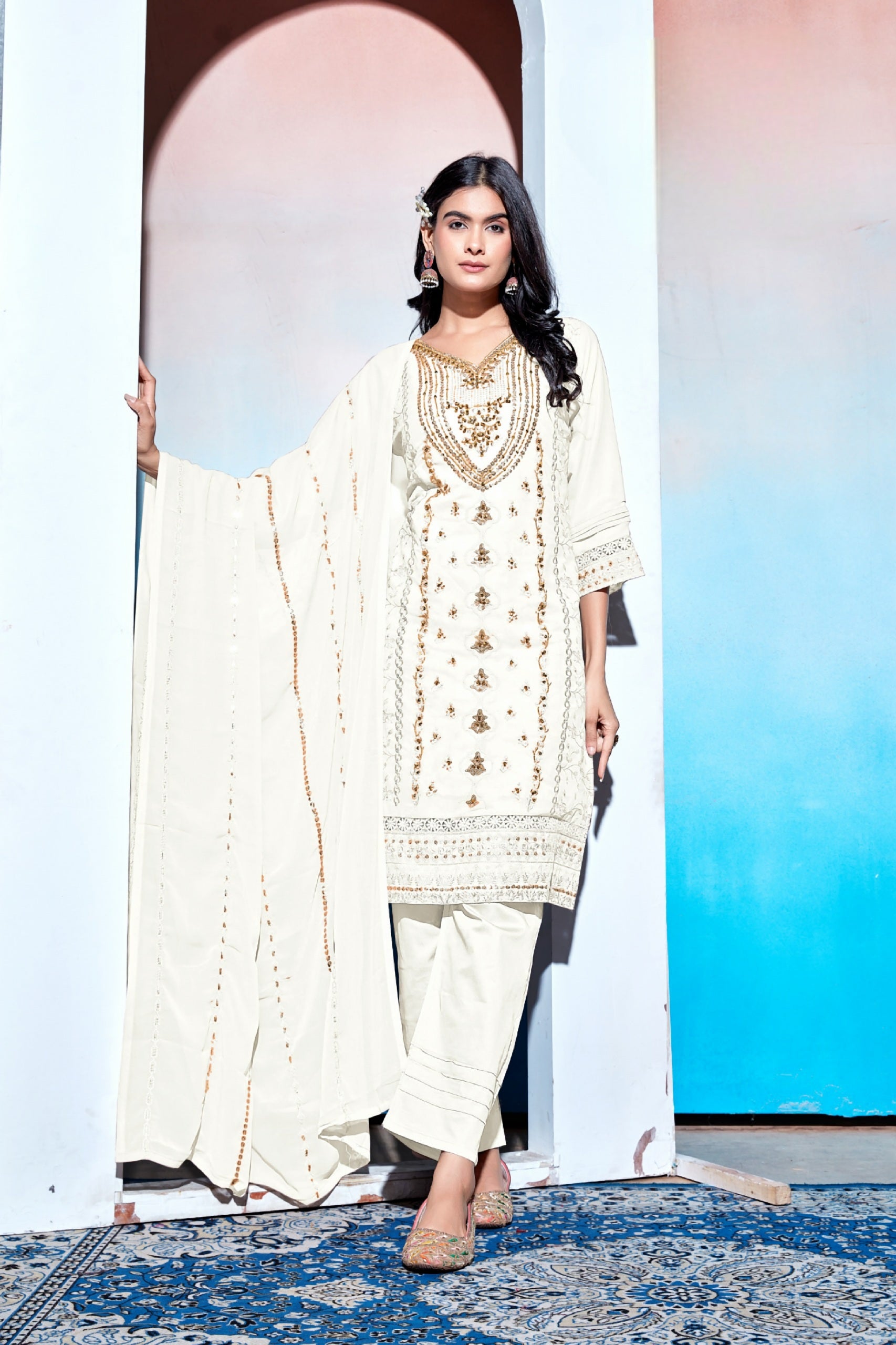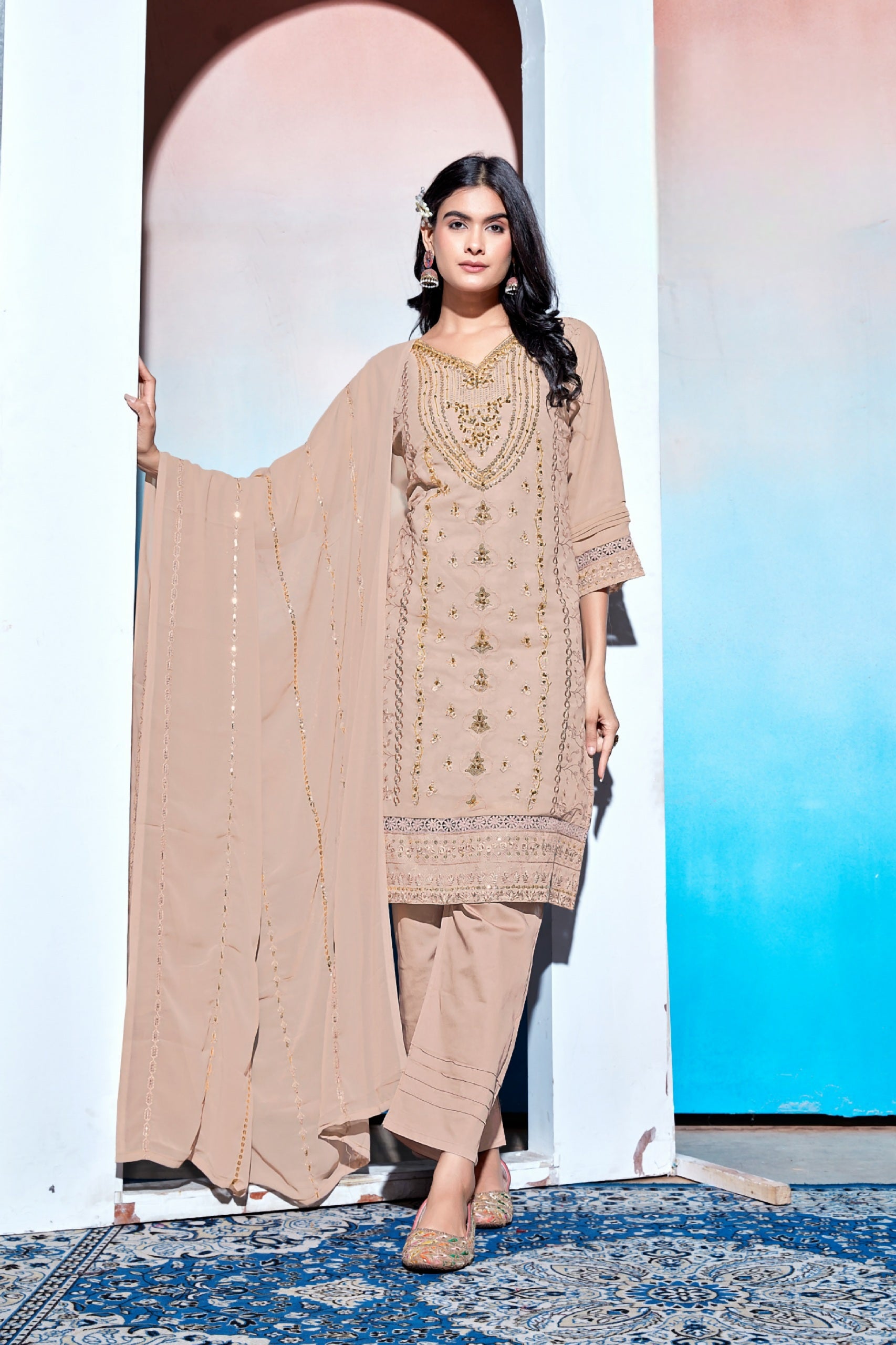 This graceful set features a georgette top paired with beautifully embroidered sleeves finished with delicate lace detailing. The cotton inner provides all-day comfort. It comes with a heavy cotton stretchable pant for a sleek and stylish silhouette. Completing the set is a georgette dupatta adorned with intricate multi-sequins embroidery, perfect for adding festive charm to your look.
