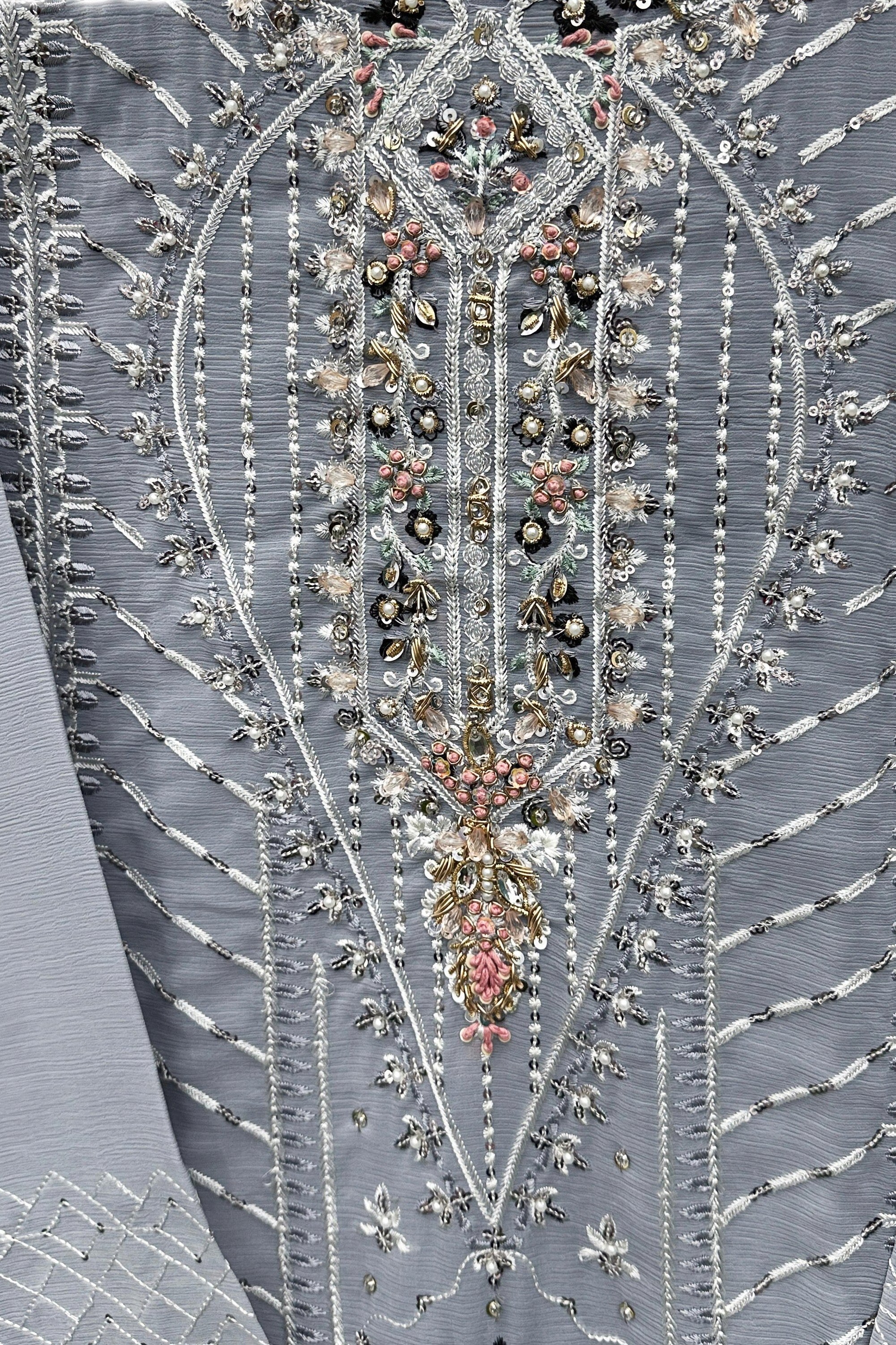 A beautifully embroidered Chiffon dupatta, featuring intricate multisequence work that adds shimmer and elegance to the overall look.