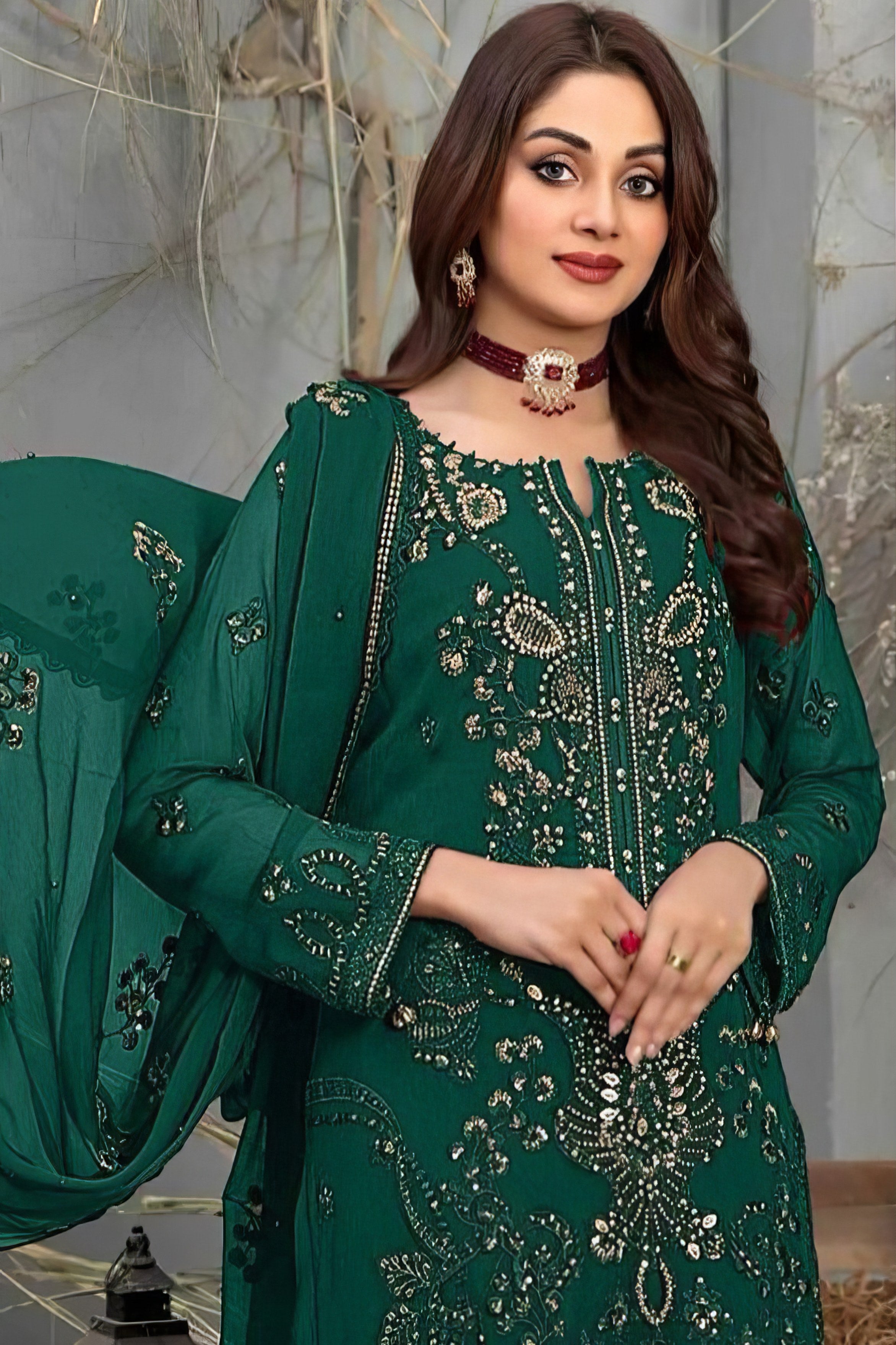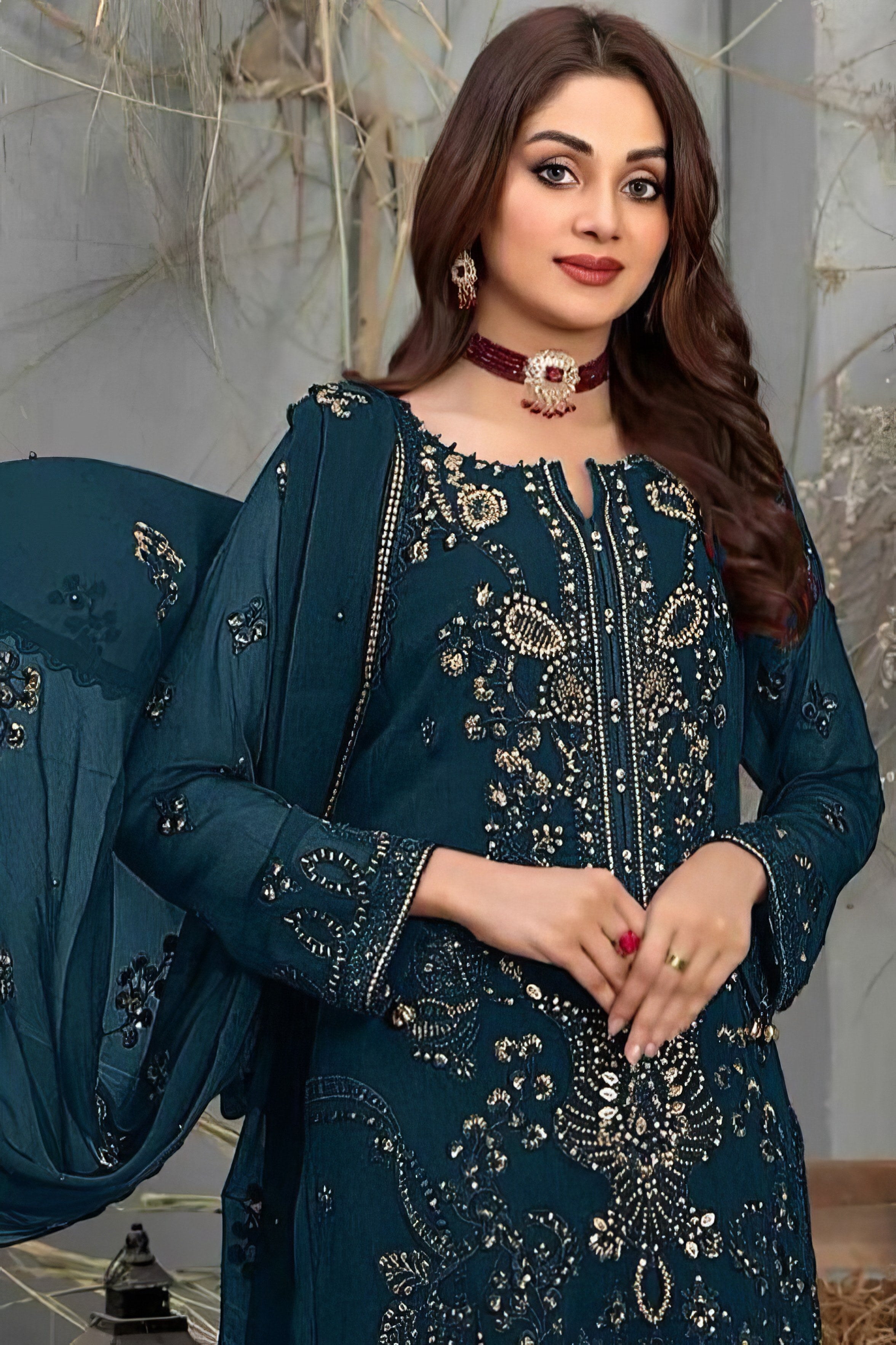 Heavy Chinon Dupatta embellished with Embroidery and Sequin Work, finished with delicate Four-Side Lace to enhance the overall grace of the outfit.