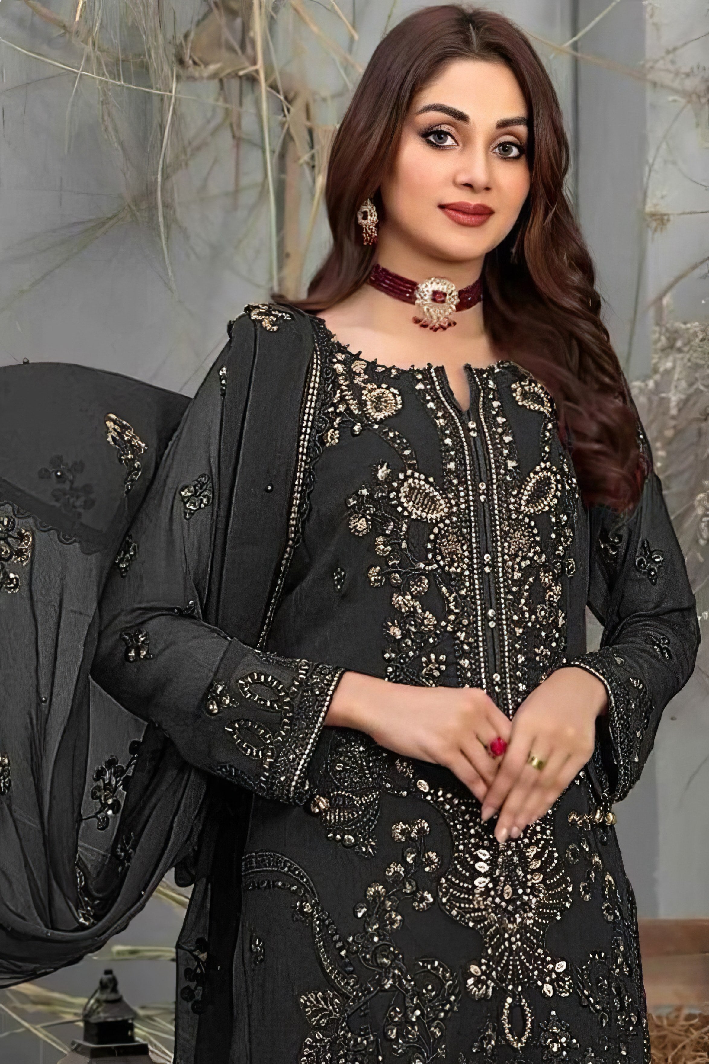 Step into festive flair with this beautifully crafted Heavy Chinon gown set, featuring intricate embroidery and sequin work, finished with a graceful four-side lace dupatta โ perfect for weddings, parties, and traditional celebrations.