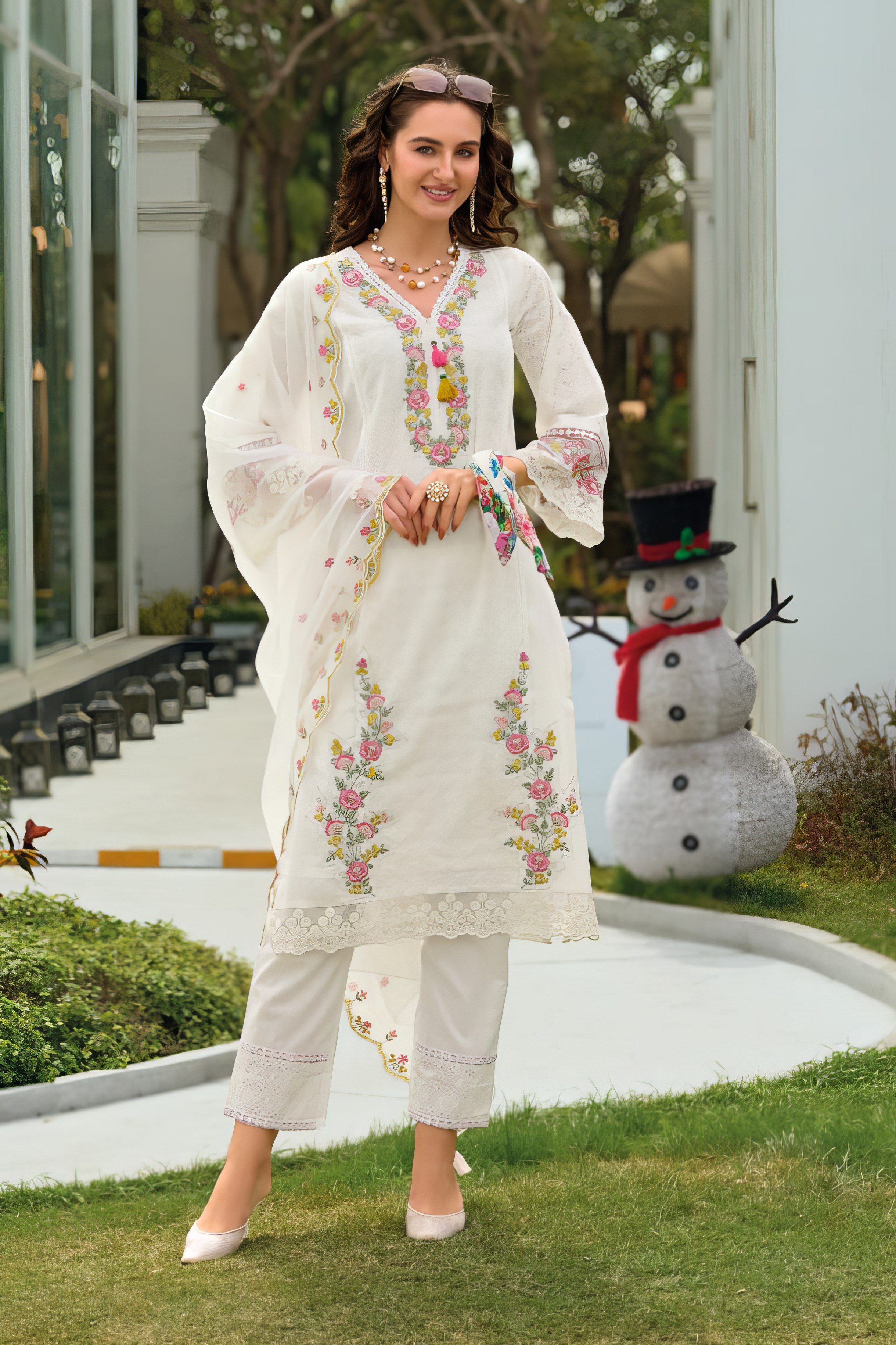 The set is paired with a Pure Organza dupatta adorned with intricate threadwork, adding a soft and sophisticated layer of elegance.