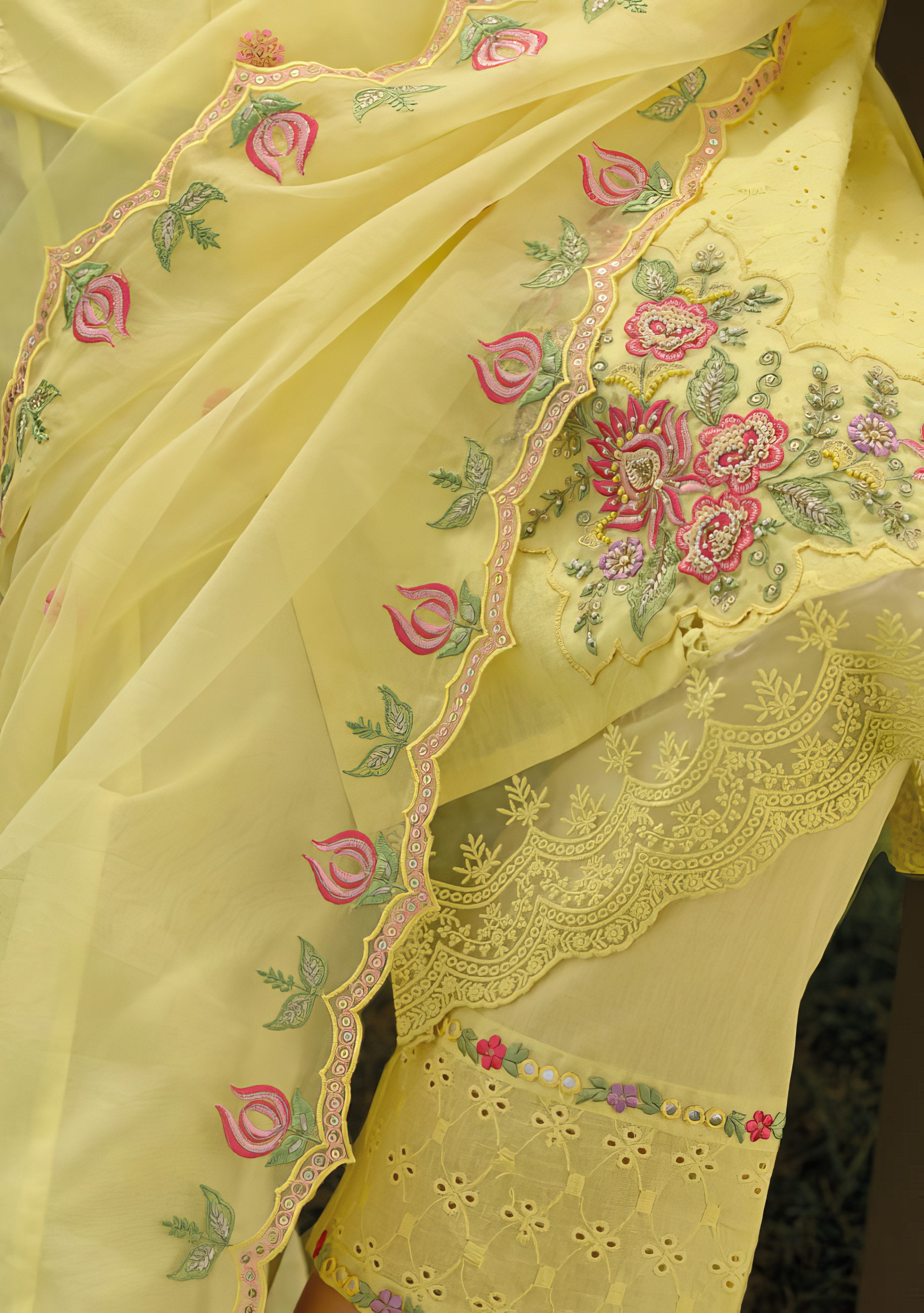A timeless fusion of elegance and craft—this designer-style suit set redefines grace with soft cotton, intricate threadwork, and a flowy organza dupatta.