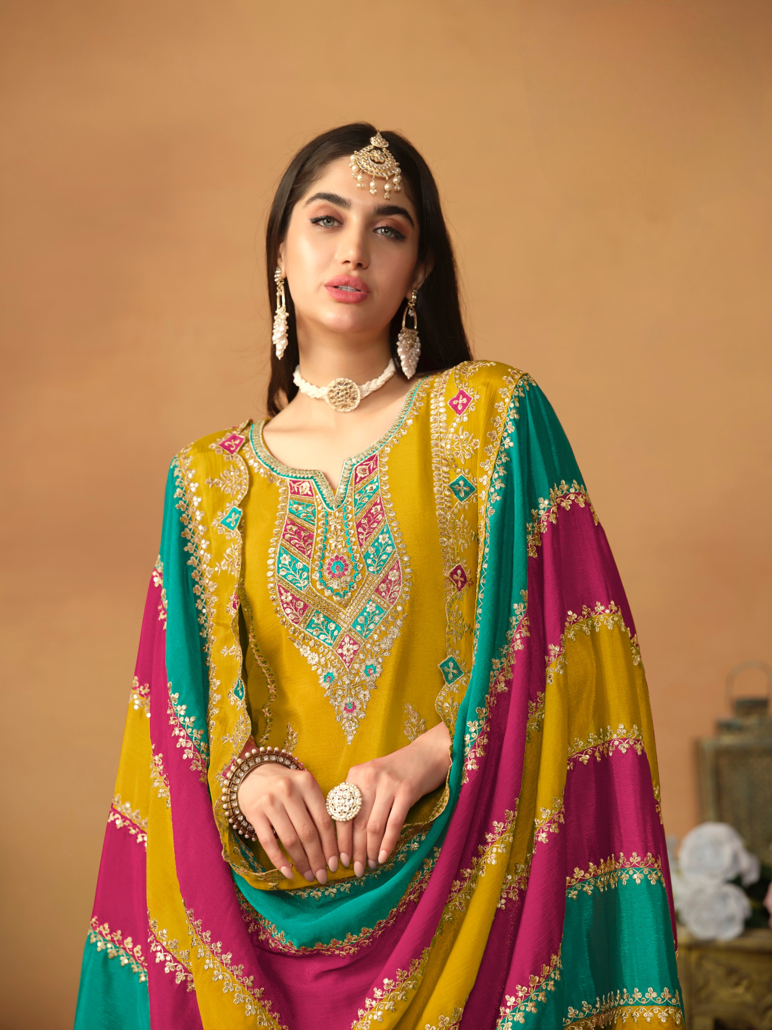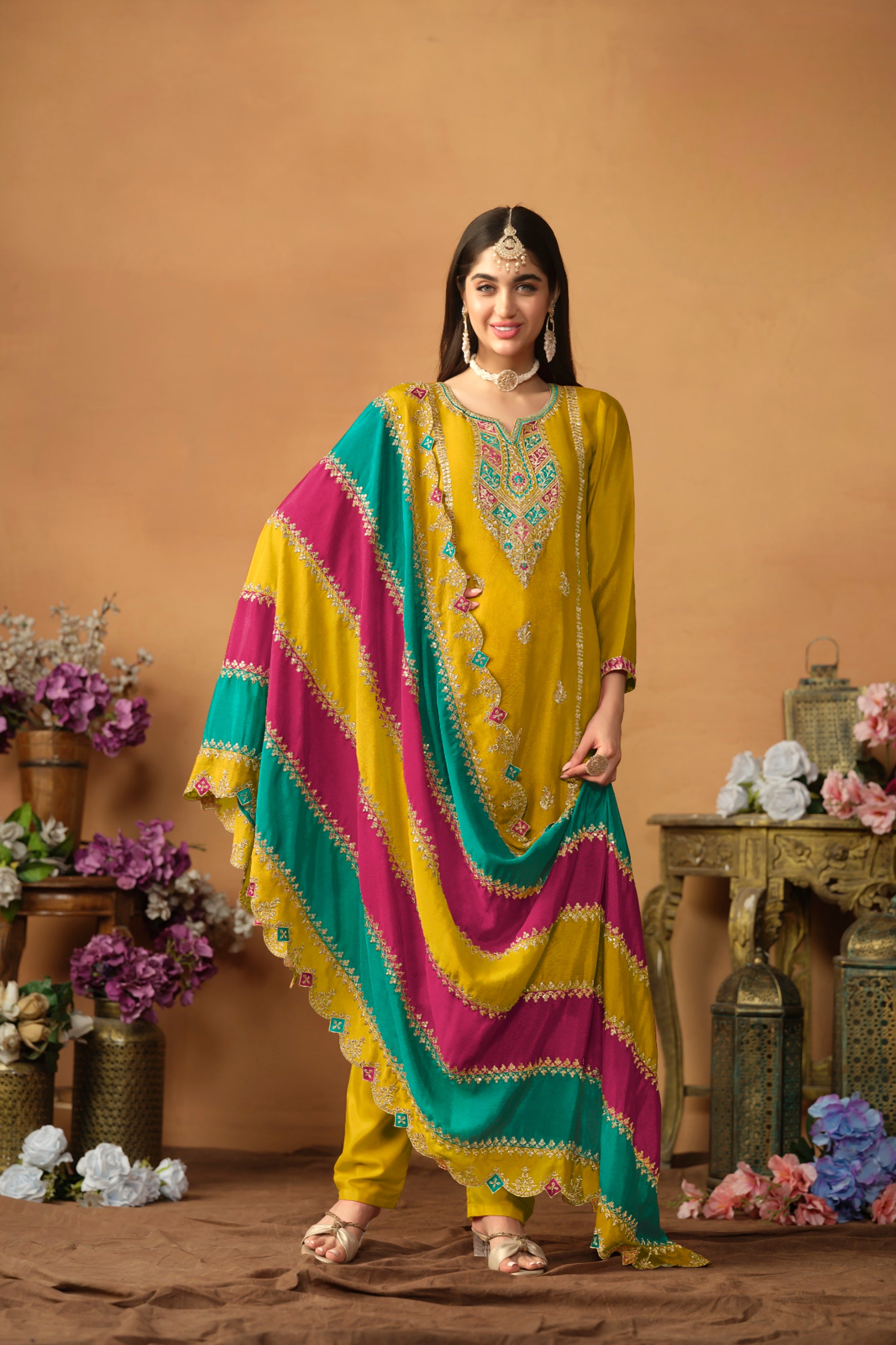 Indulge in understated luxury with this elegant suit set, crafted from premium Chinon Silk — perfect for festive gatherings, family functions, and graceful ethnic wear.