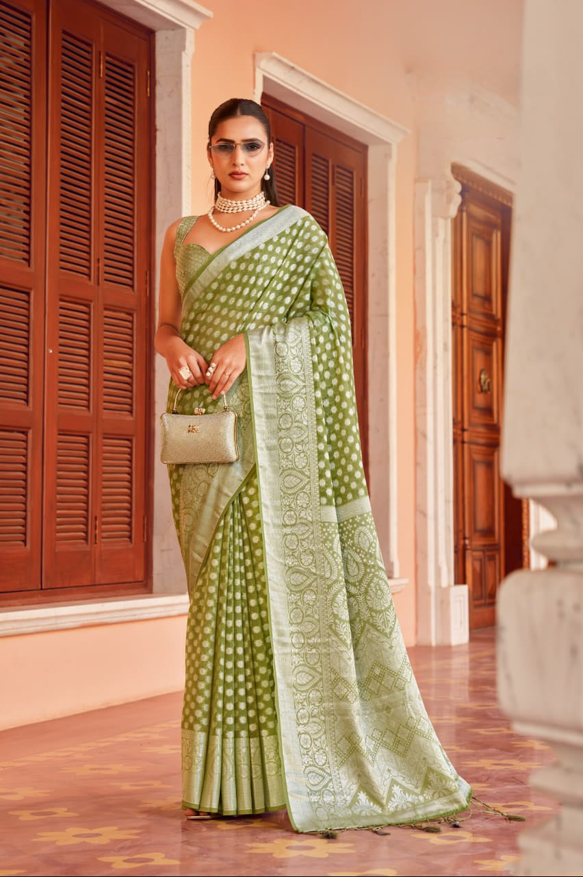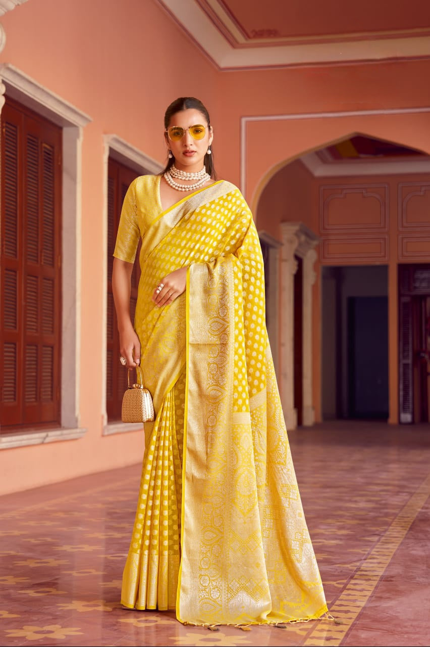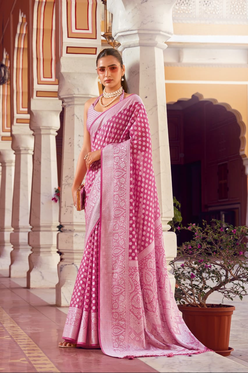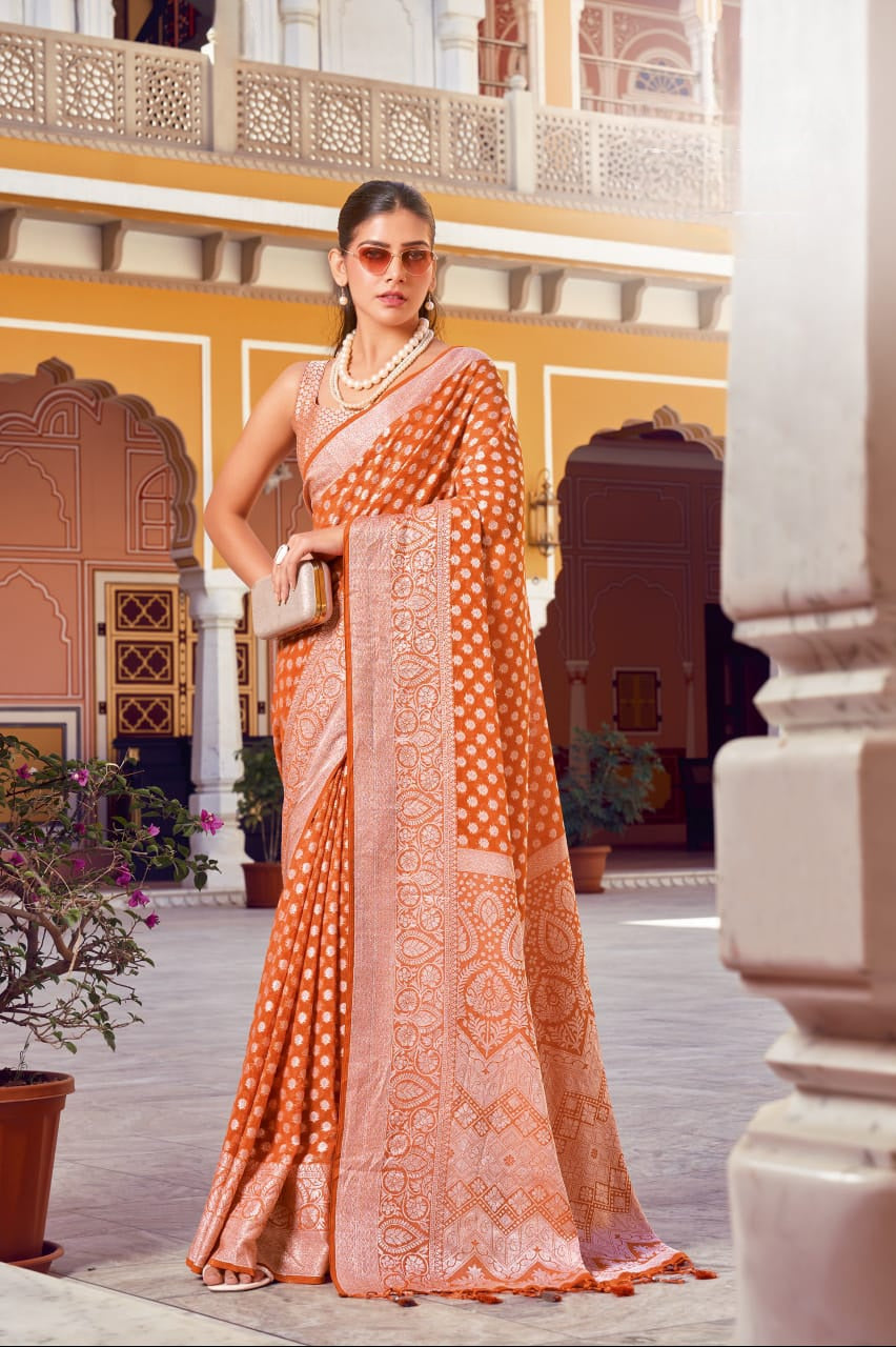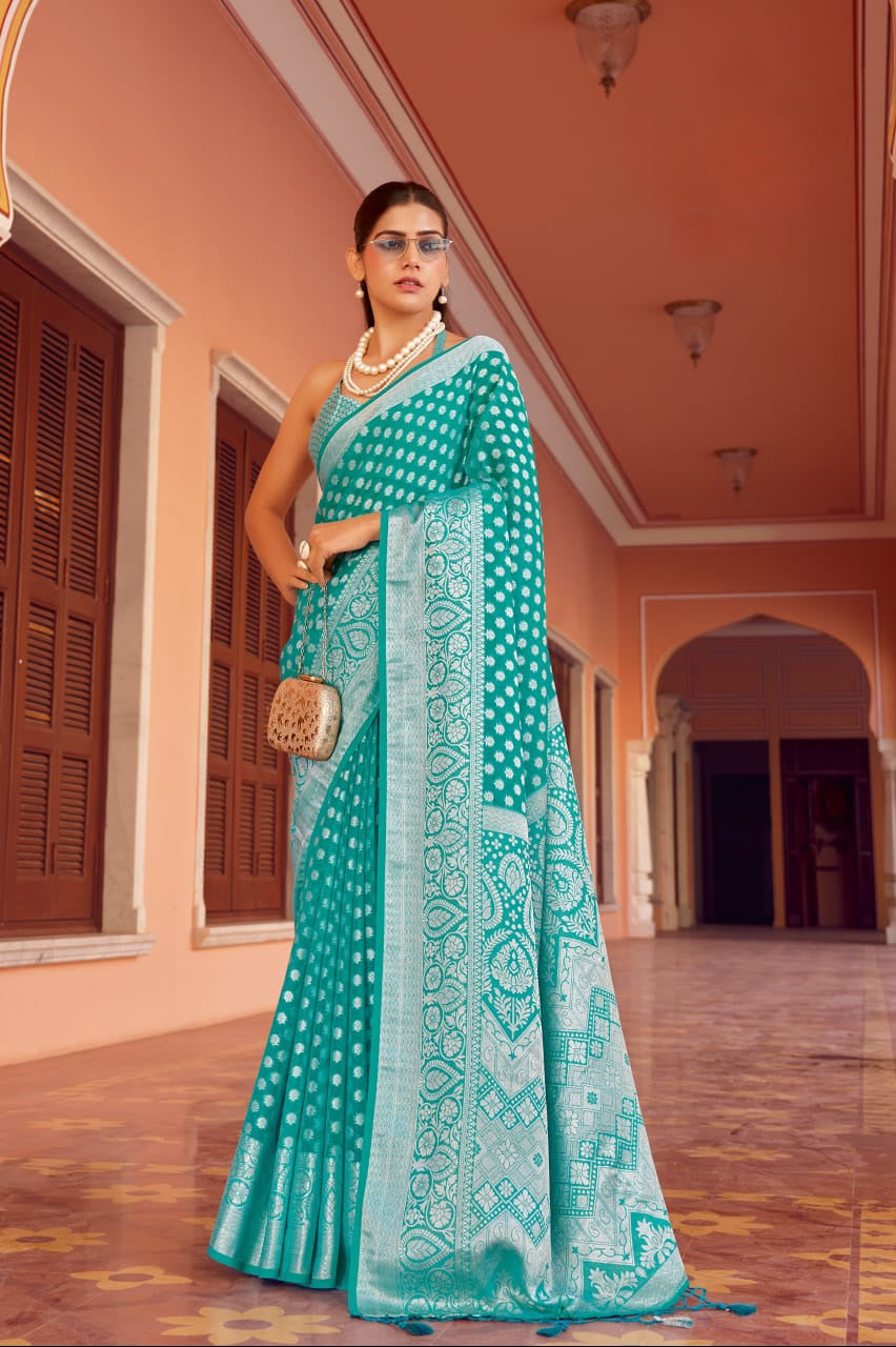 The Aarvi Weaving Buta Georgette Saree is crafted from premium two-tone georgette, designed to flow gracefully with every step. It features a delicately woven buta border and pallu, enhanced with a luxurious premier coating and soft-touch finish for a smooth, elegant drape. This saree perfectly combines traditional charm with modern wearability, making it a beautiful pick for any festive or cultural celebration.