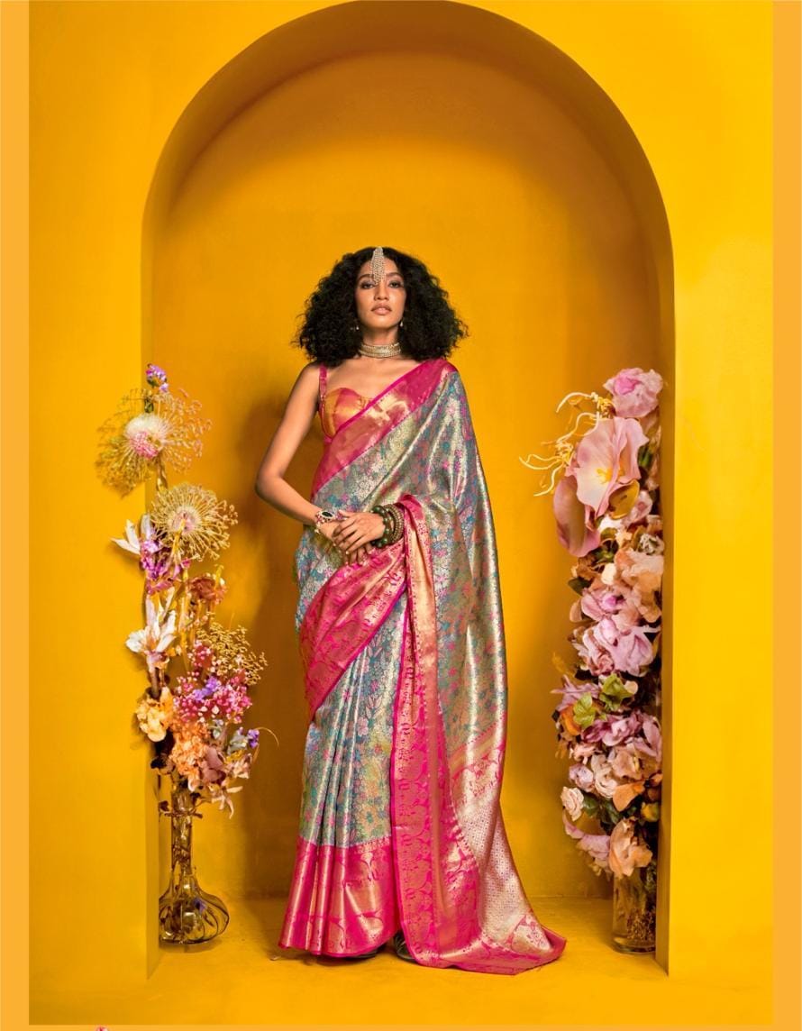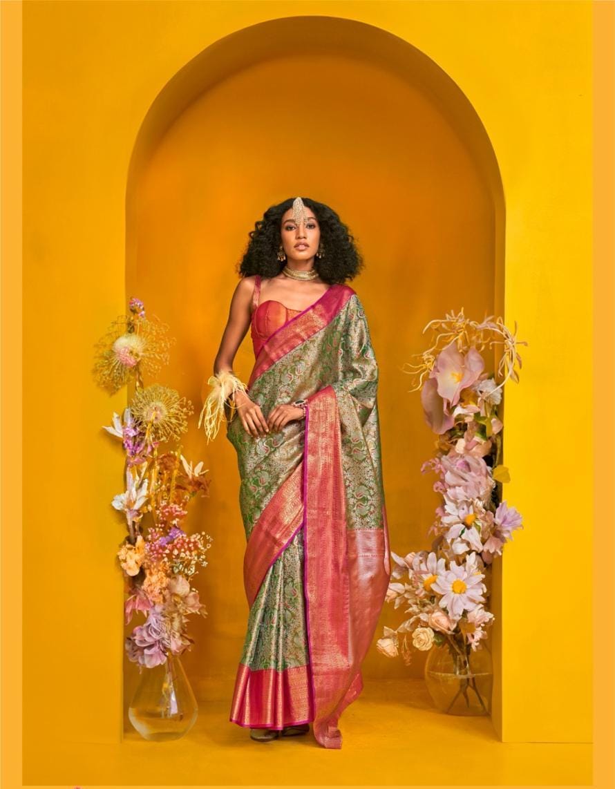 Design: Traditional handwoven patterns with intricate zari work that adds a regal touch.