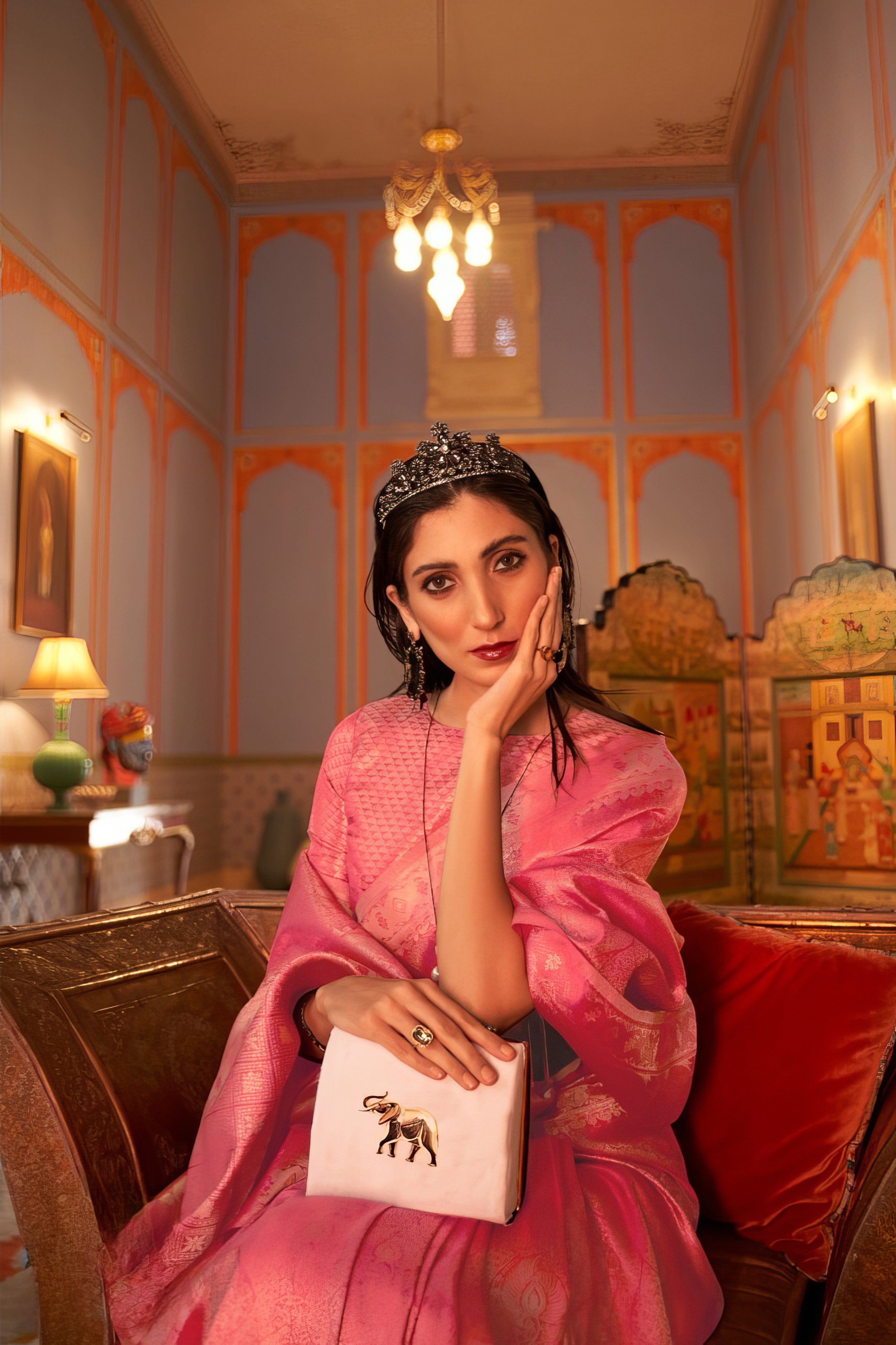Turn heads in this statement-making Nylon Satin Weaving Saree — designed for women who love bold elegance with a luxurious finish. Perfect for weddings, parties, and grand celebrations.