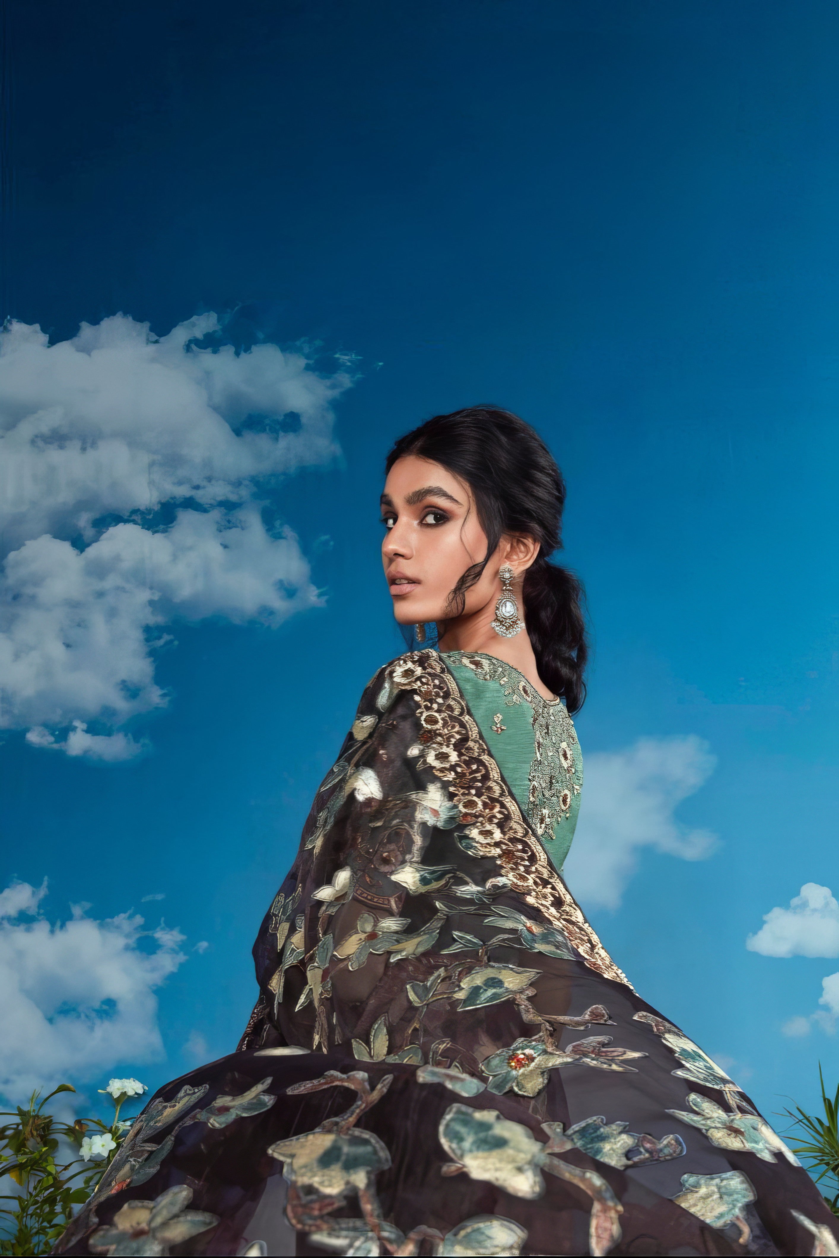 Made from Pure Brasso, this saree features heavy embroidered work on the border and innovative multicolour floral motifs all over. The pallu is adorned with attached tassels, adding movement and flair.