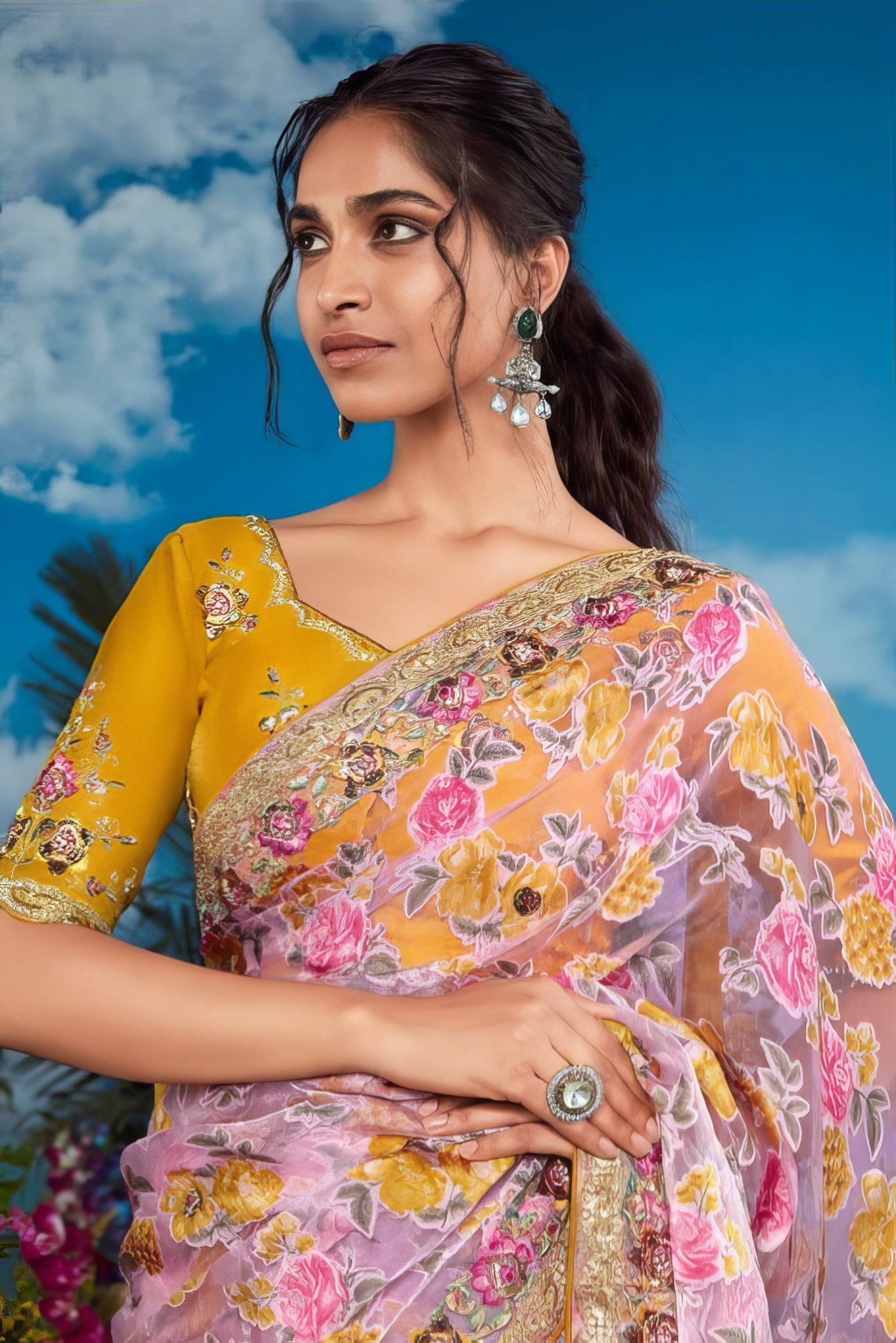 Pure Brasso saree with heavy embroidery work on the border and vibrant multicolour flower patterns all over. The pallu is adorned with attached tassels, adding a graceful finish.