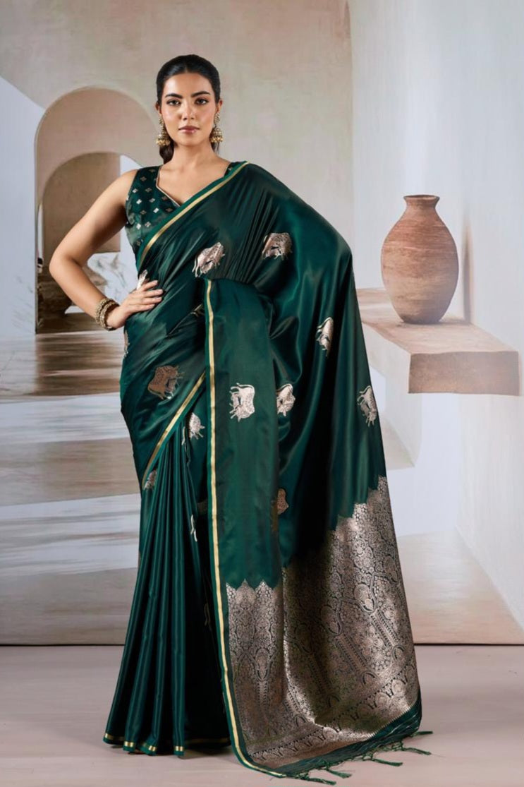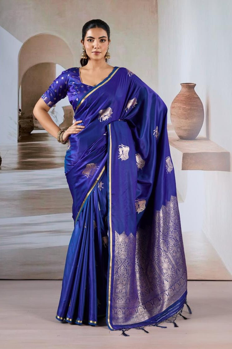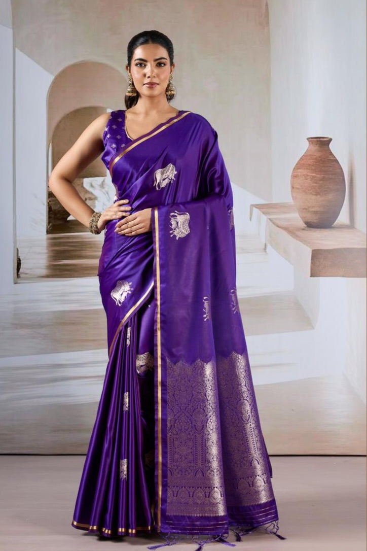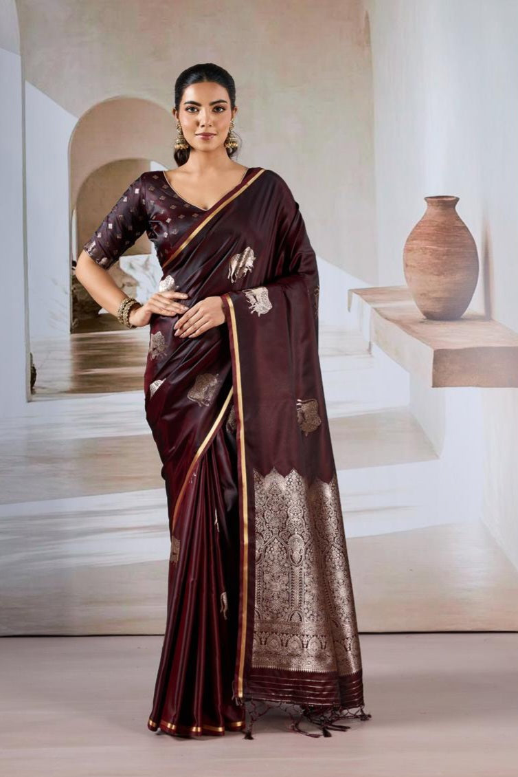 Experience the richness of tradition with this premium handloom saree, crafted from pure satin weaving fabric. It features a naturally lustrous drape with a soft, fluid fall and elegant craftsmanship. The matching blouse completes the regal ensemble, perfect for occasions where timeless elegance matters.