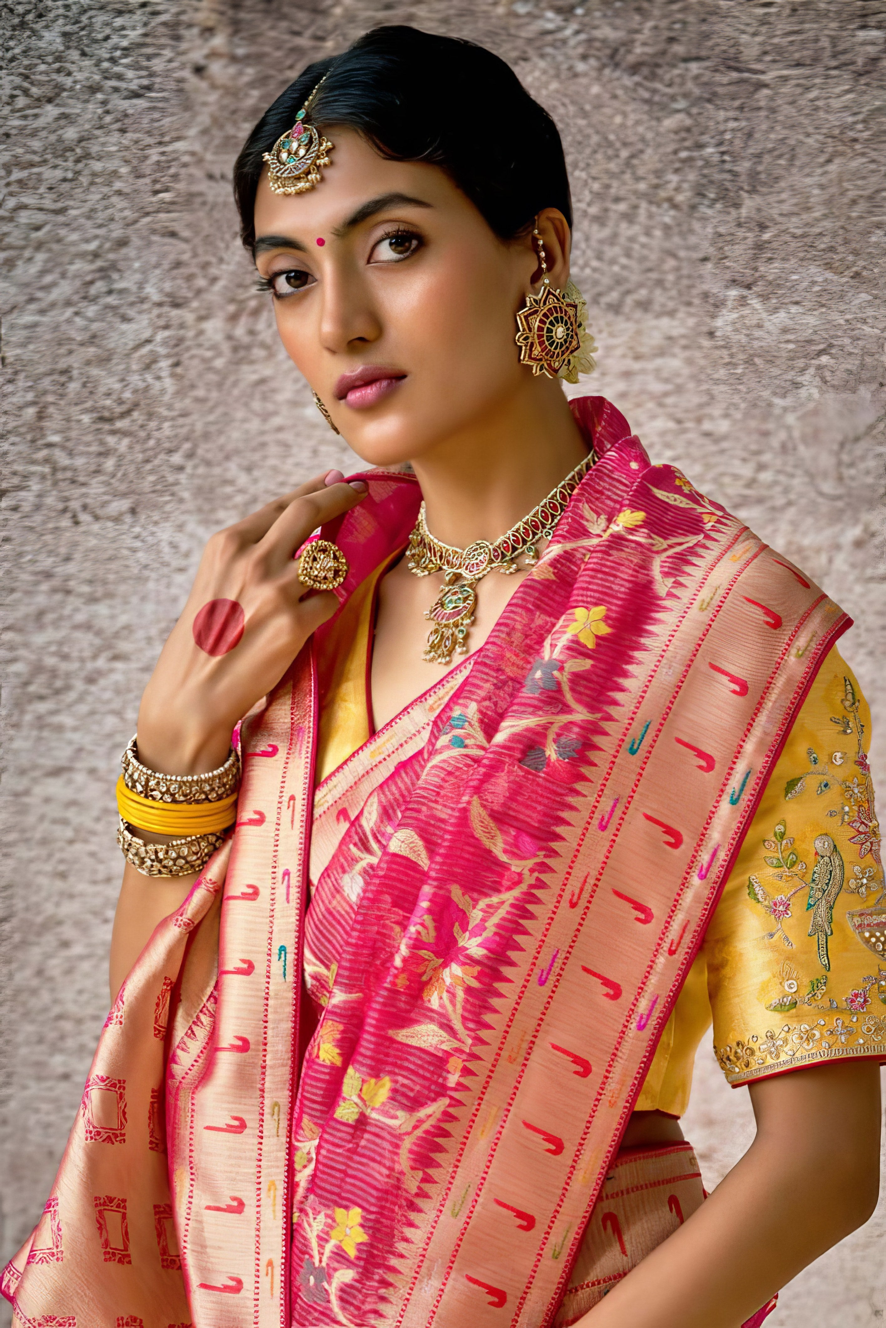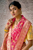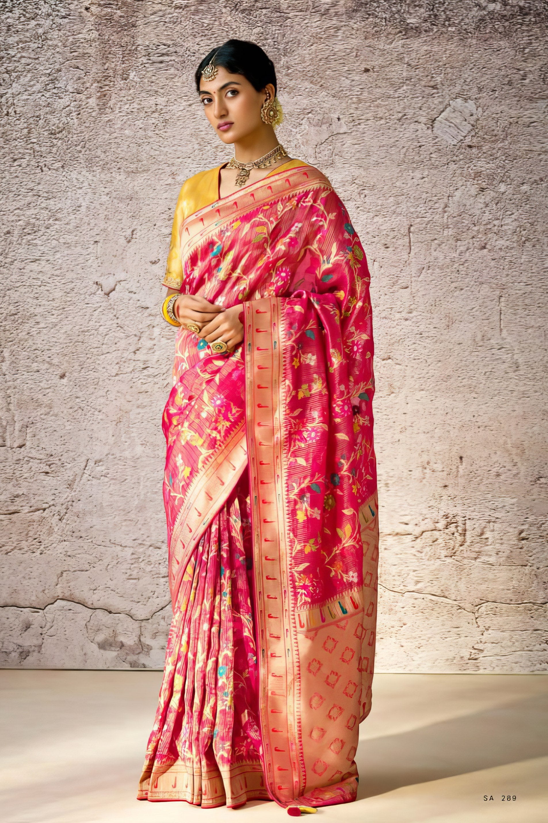 Indulge in timeless elegance with this Kora Banarasi Art Silk saree, intricately woven with delicate motifs and rich textures. The fabric offers a luxurious sheen and lightweight comfort, making it ideal for grand occasions. The fully stitched matching blouse enhances the overall traditional appeal of the ensemble.