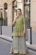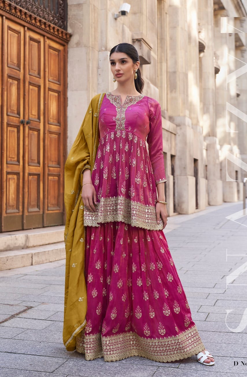 Shine with elegance in this fully-stitched designer set, crafted from Heavy Premium Real Simmer and beautifully adorned with fine embroidery and four-side lace work — a radiant choice for parties, festive occasions, and evening functions.