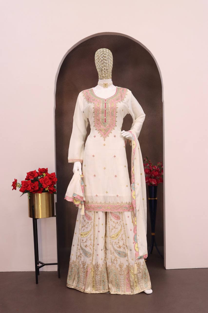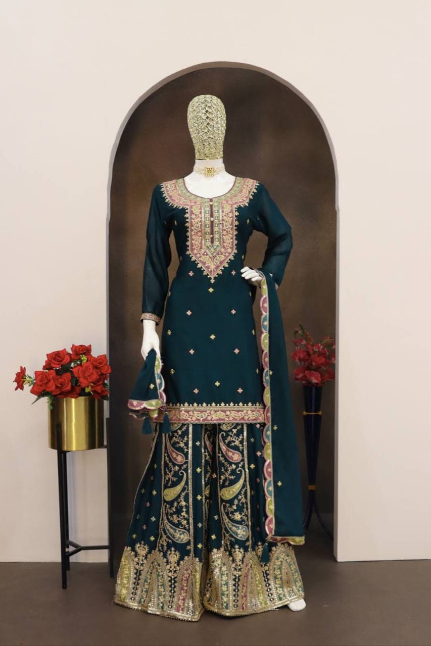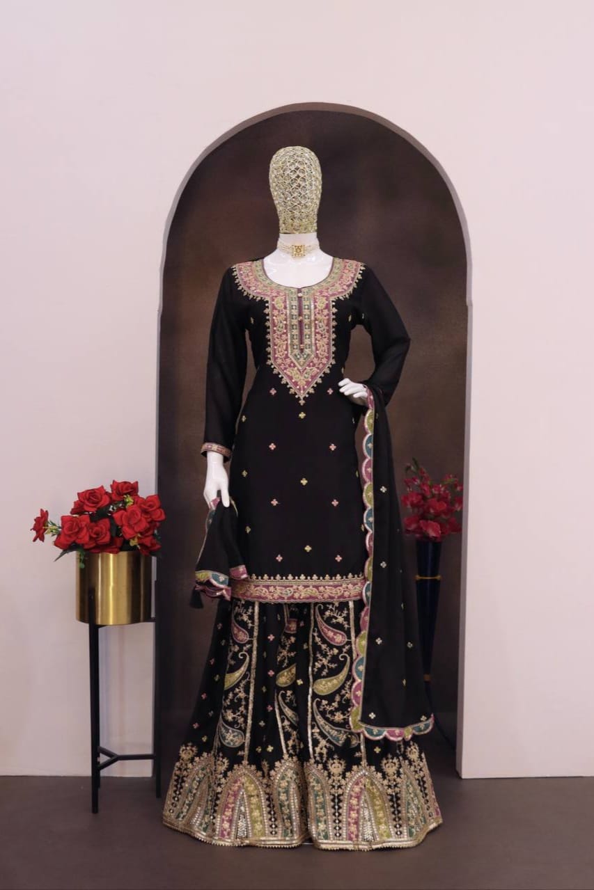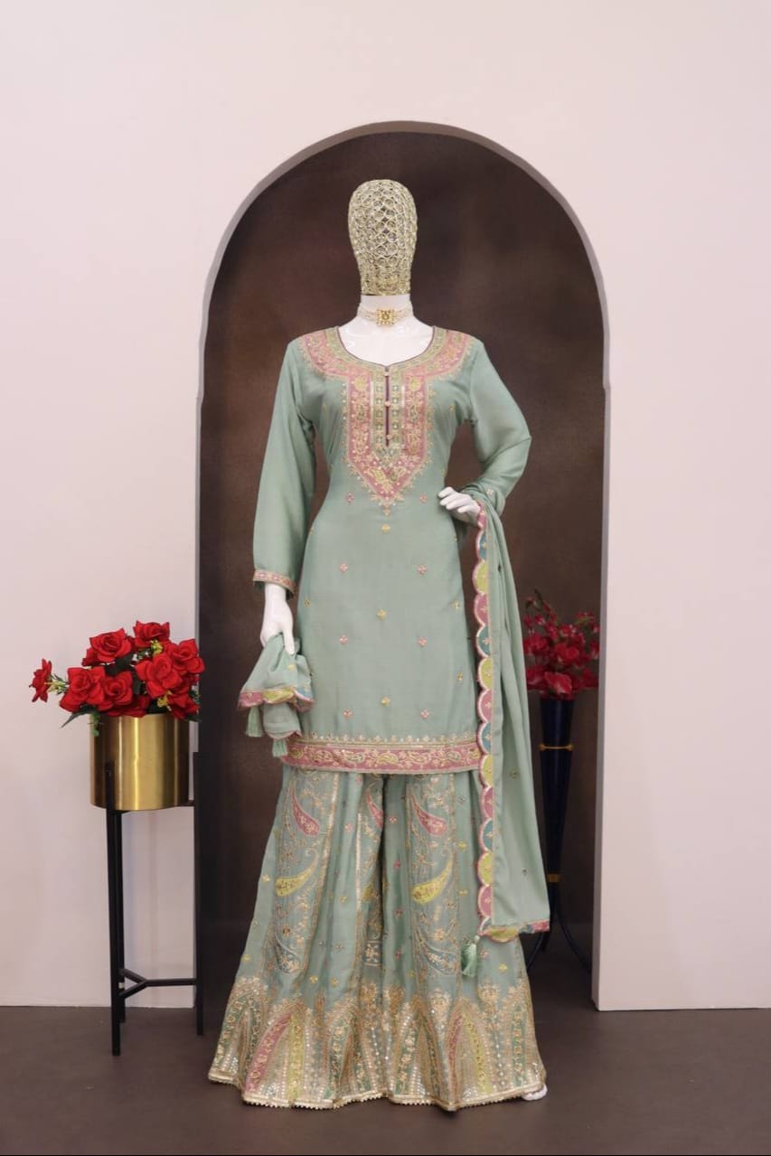 Radiate elegance in this beautifully crafted ethnic ensemble made from Heavy Chinon, adorned with multi-thread embroidery and 5mm matte sequin work — a stunning pick for festive evenings, weddings, and traditional celebrations.