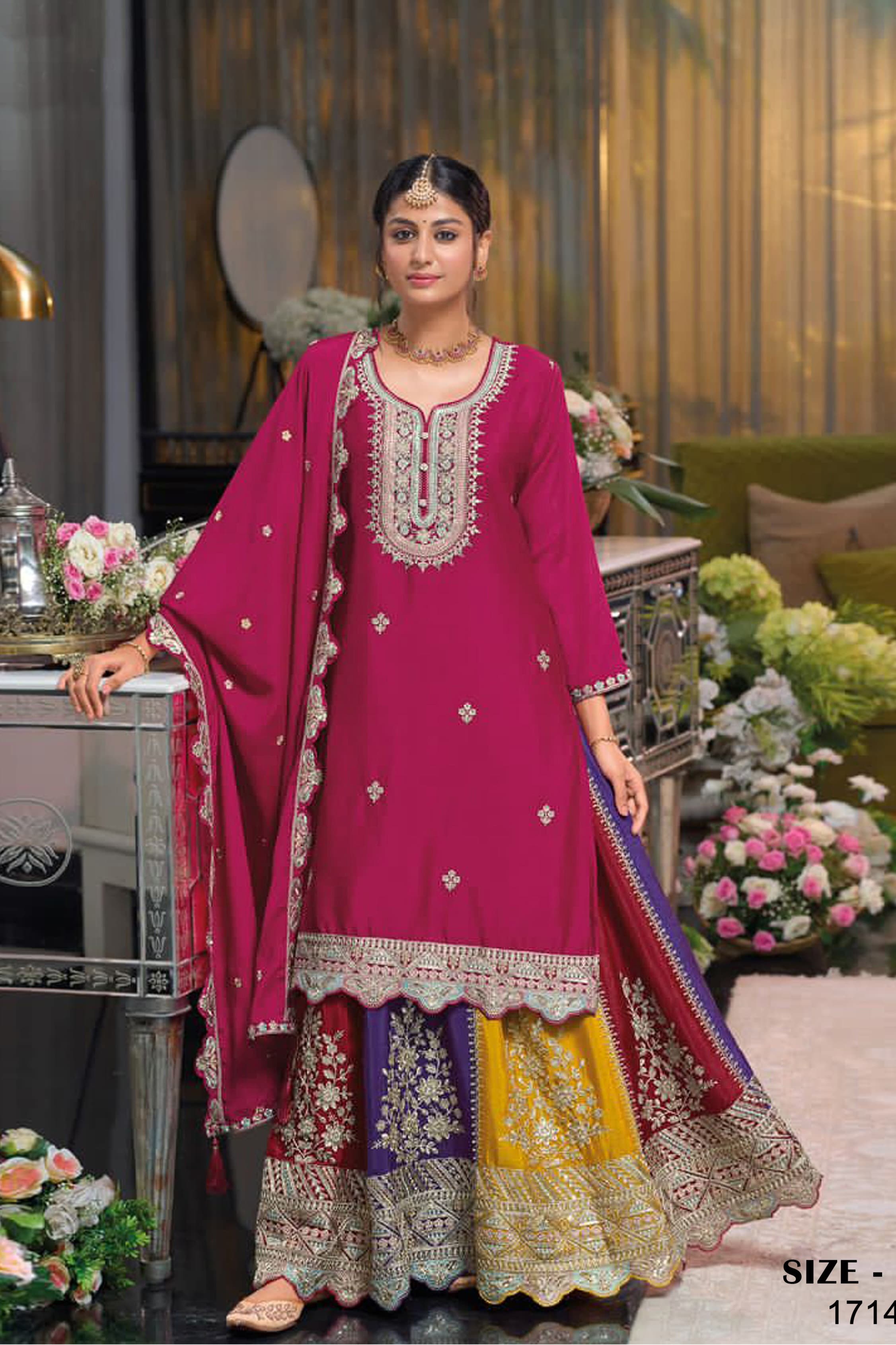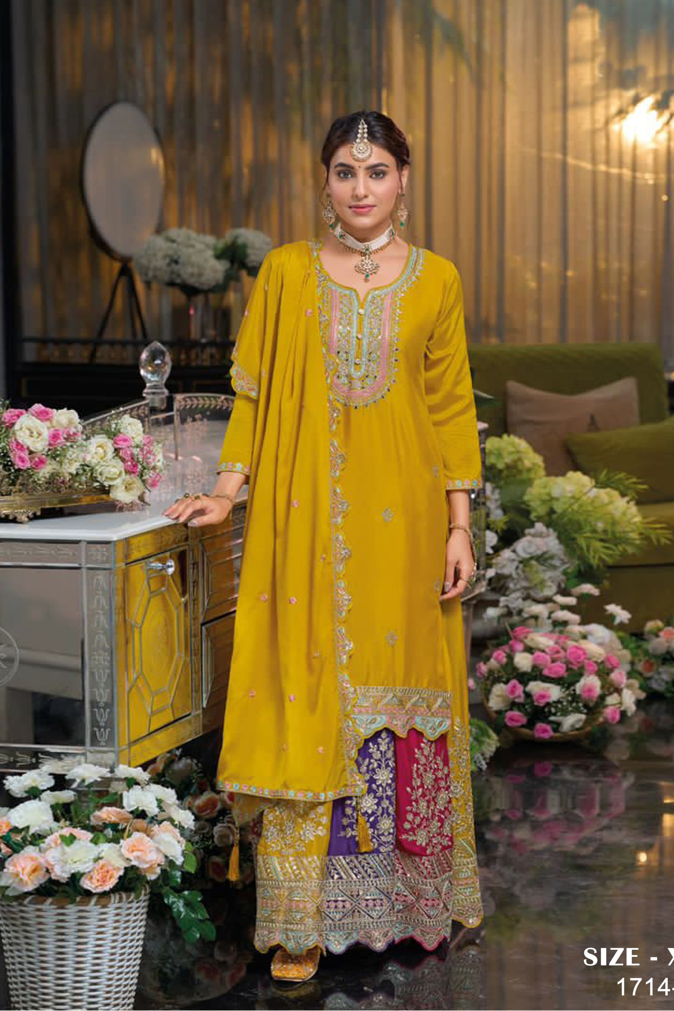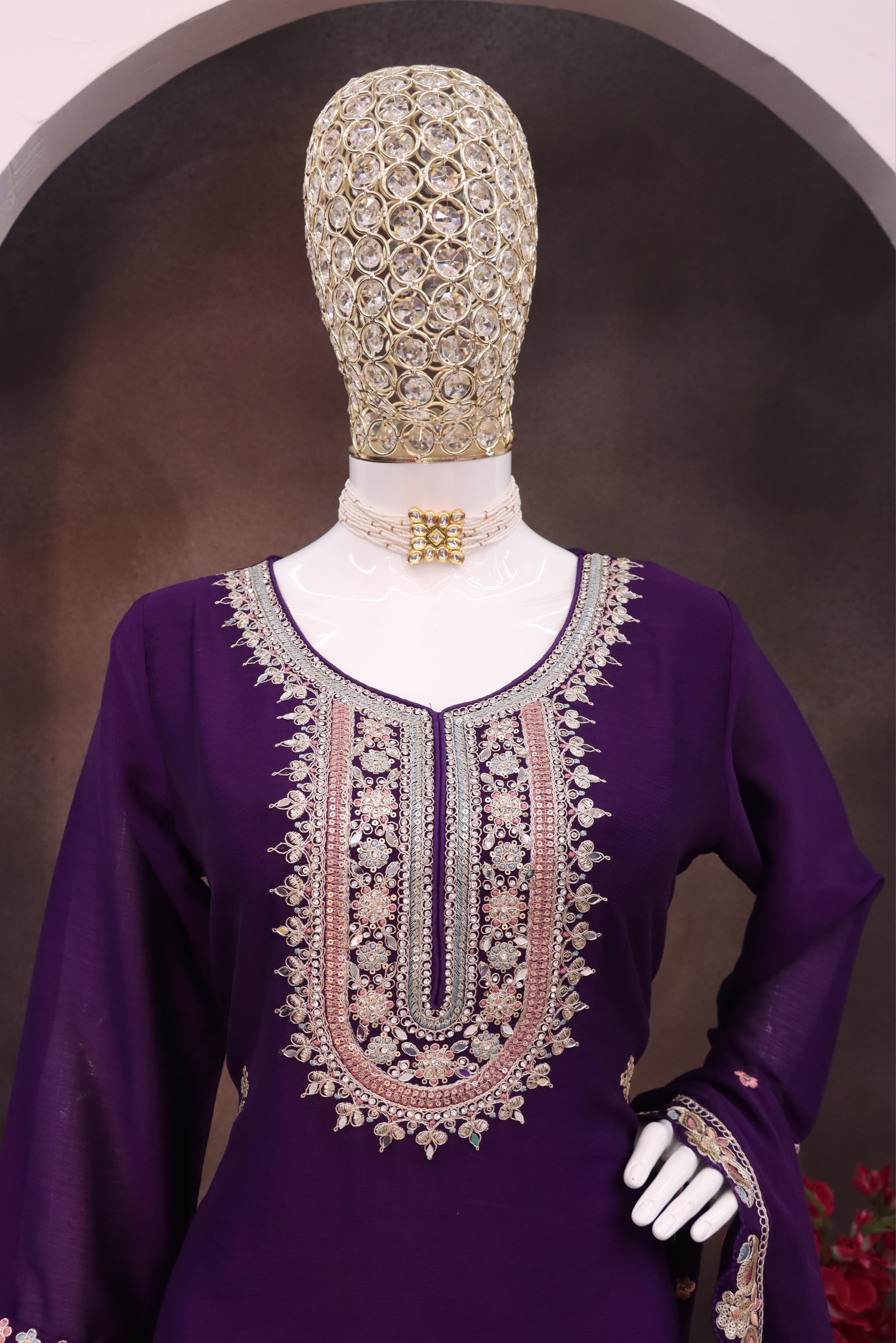 Step into refined elegance with this designer suit set, beautifully crafted in Heavy Chinon and adorned with multi-thread embroidery, matte sequins, and delicate Zarkan work — a perfect blend of grace and festive sparkle for any special occasion.