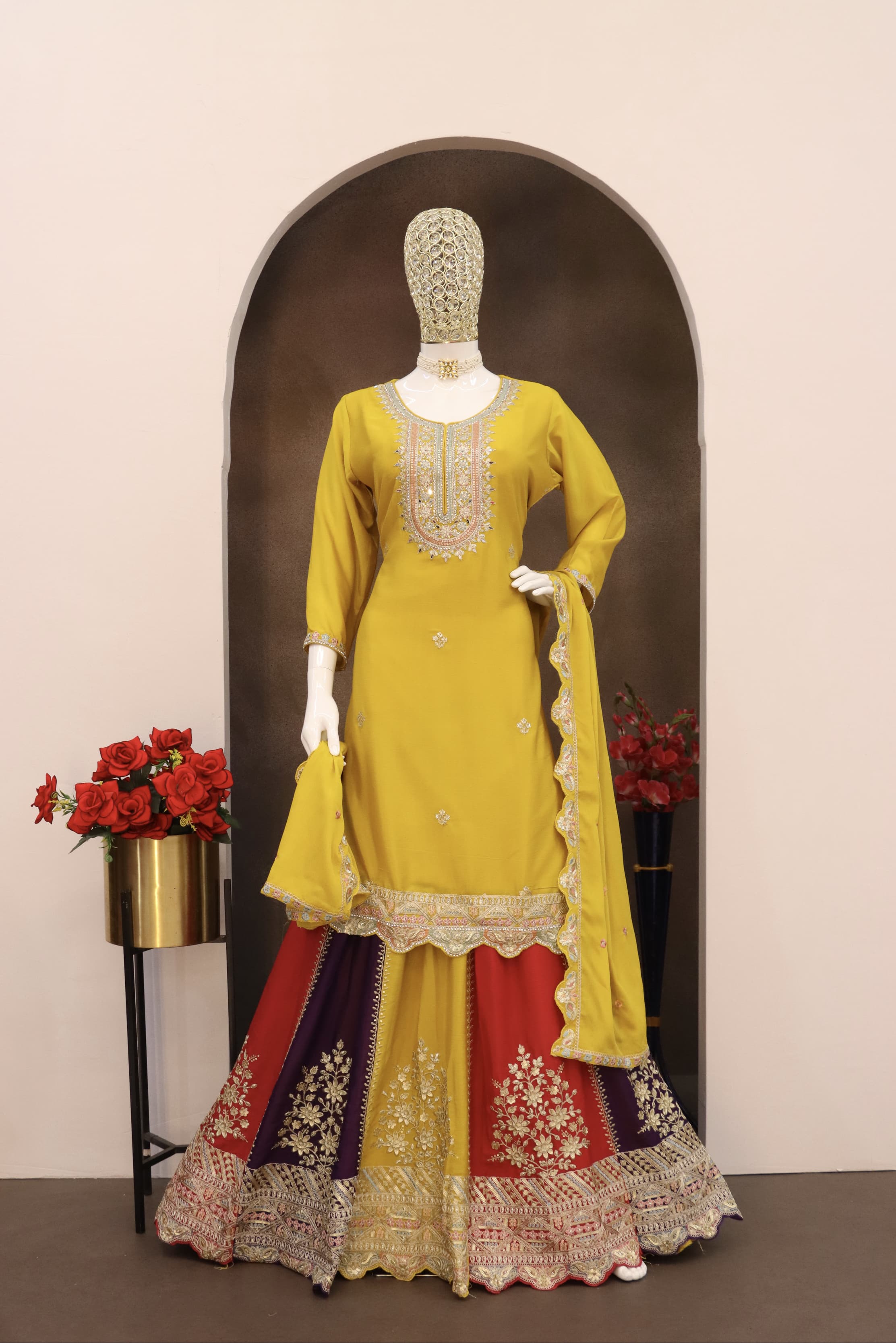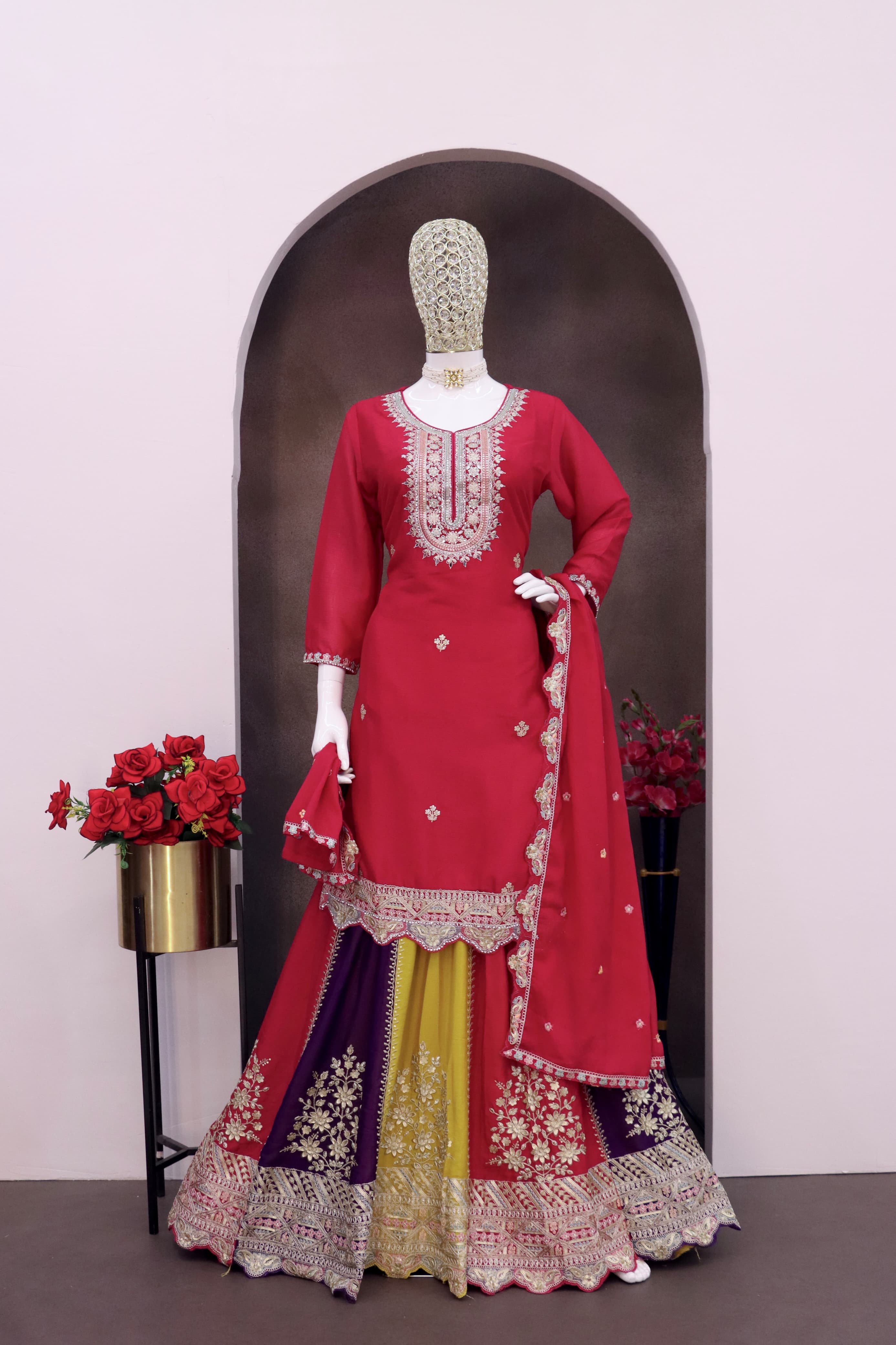 Made from Heavy Chinon, the top and sleeves feature detailed Multi Embroidery, 3mm Matte Sequin Work, and elegant Zarkan Work for a radiant yet sophisticated finish.