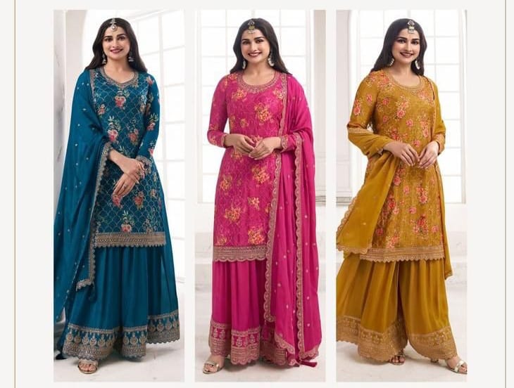 Crafted from Heavy Vichitra fabric, featuring elegant digital print work enhanced with embroidery, sequin, and delicate coding for a regal appearance.