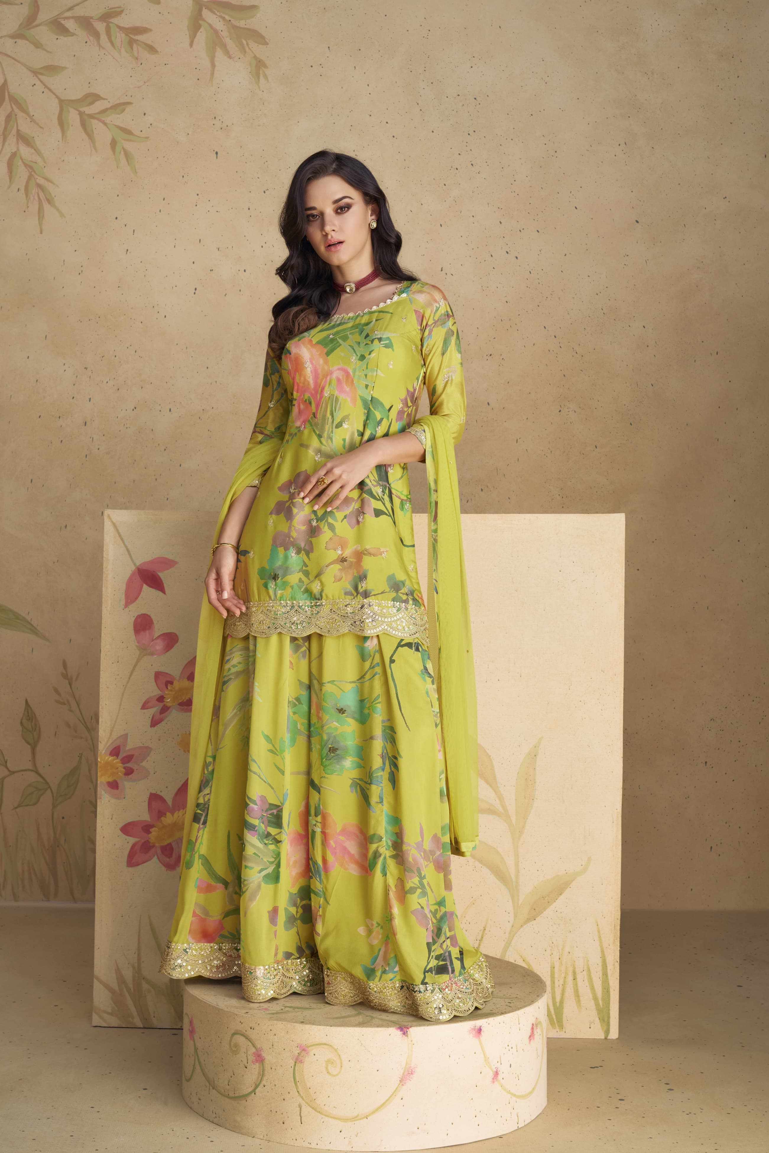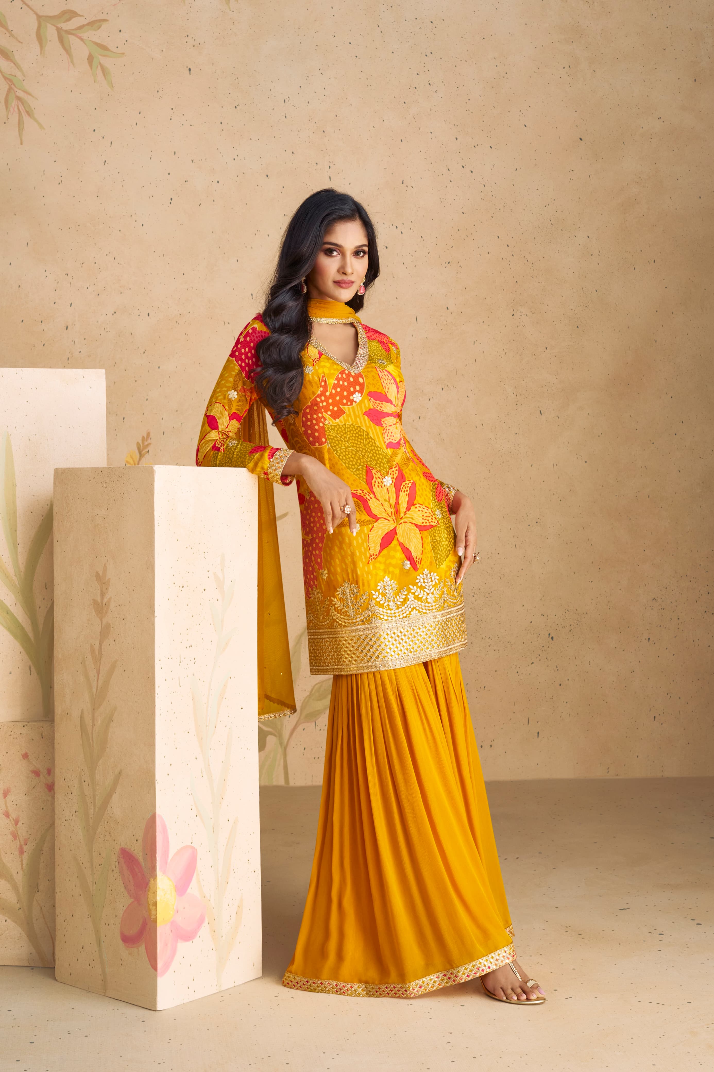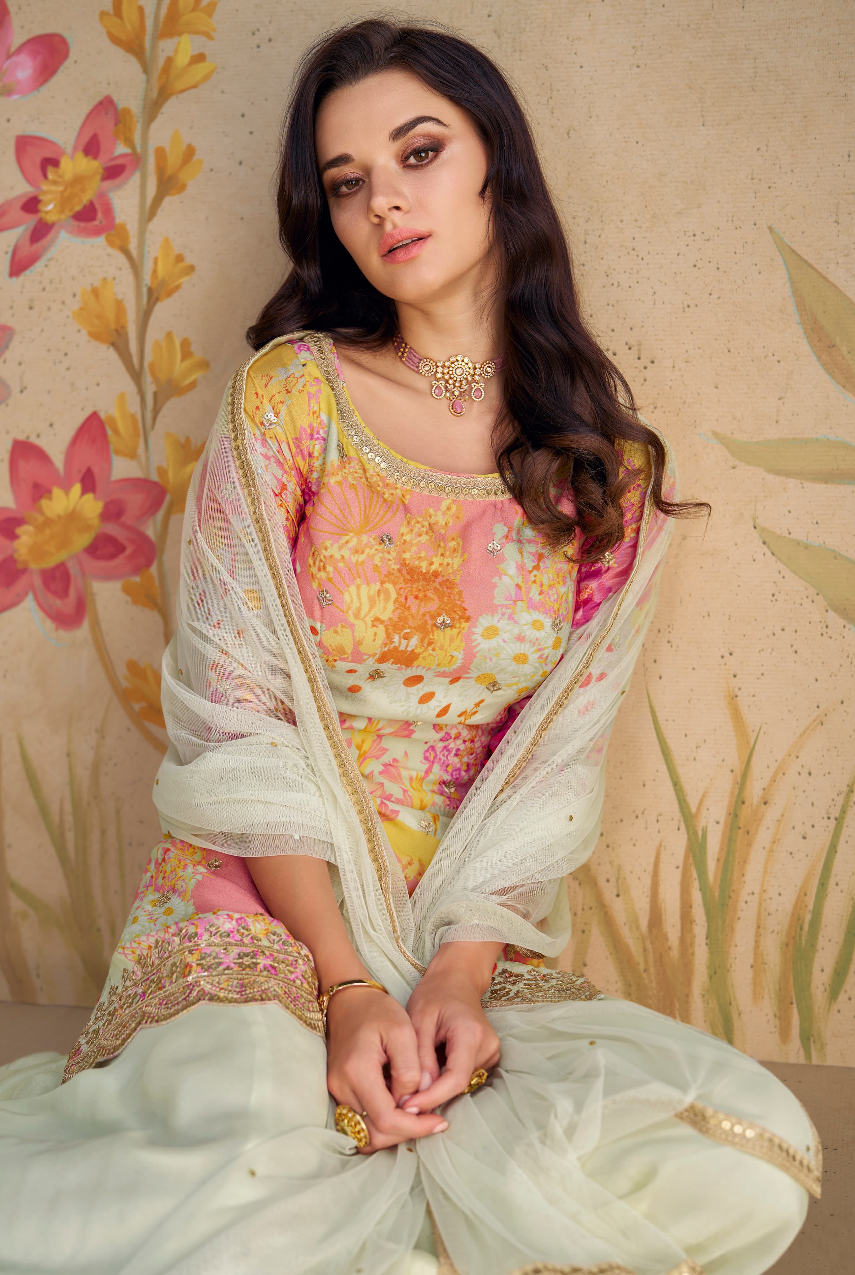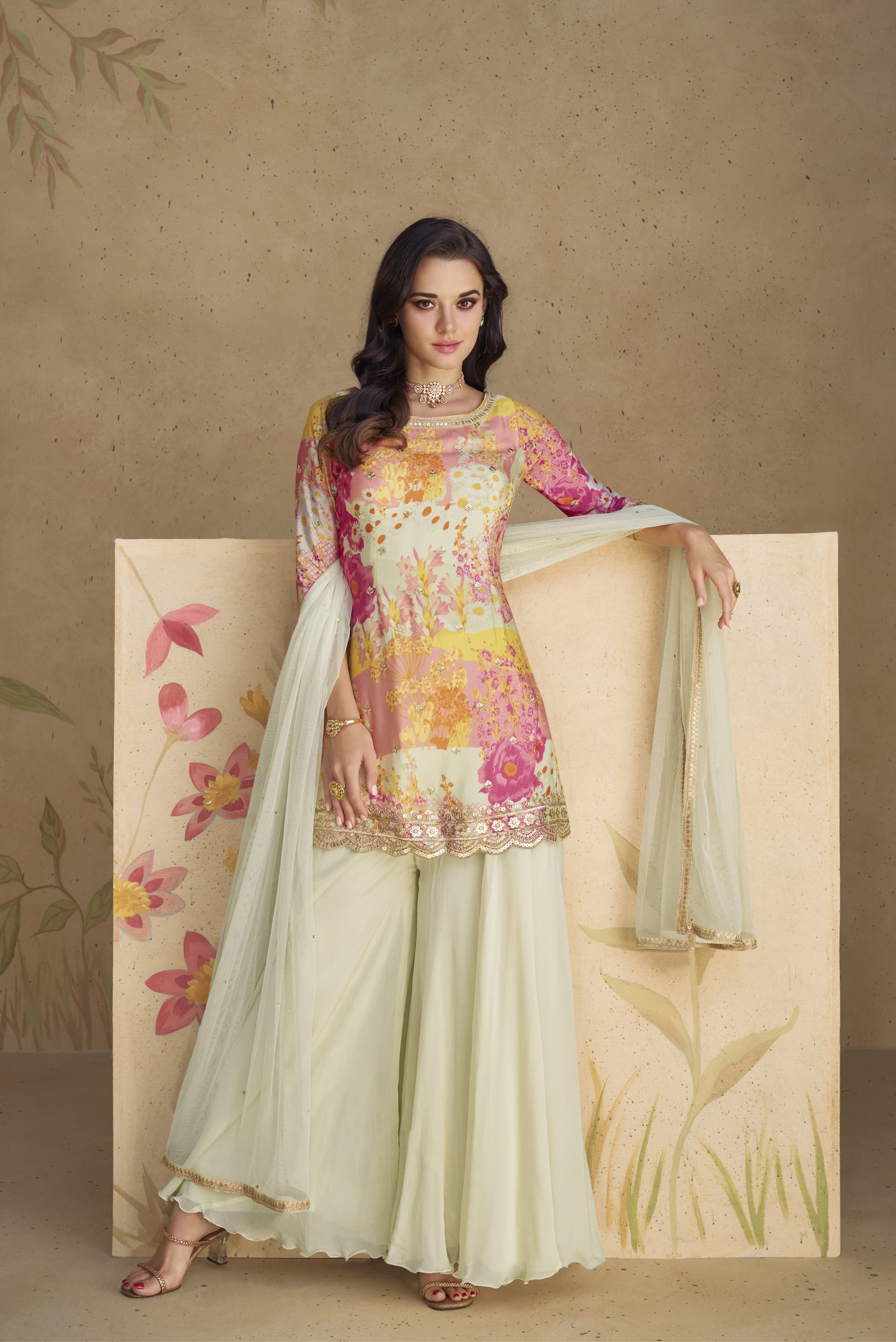Made from Premium Chinon Printed Silk, the top features exquisite embroidery work for a rich and sophisticated finish.