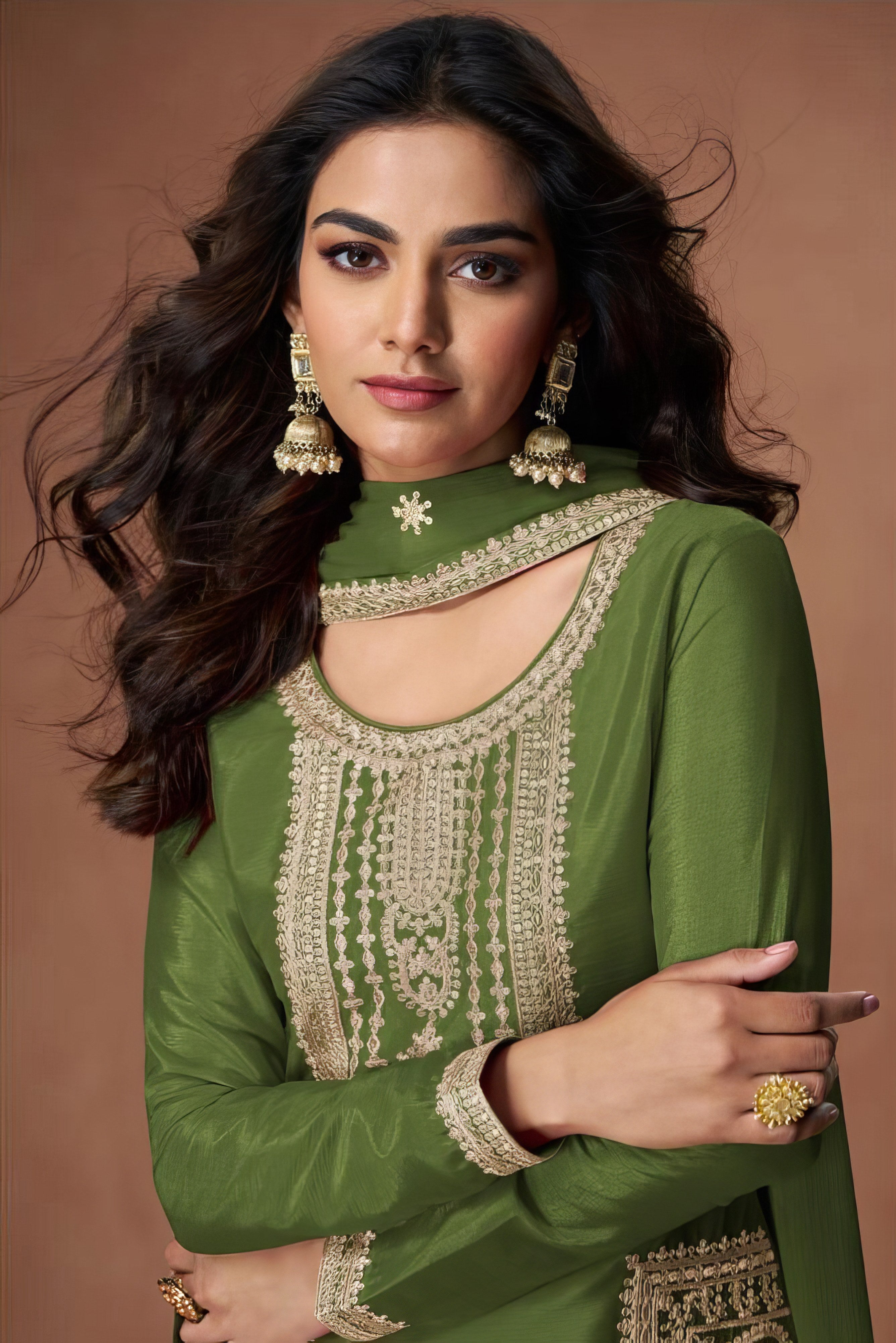 Grace meets grandeur in this beautifully designed Sharara suit, crafted entirely from luxurious premium Chinon silk. The top features a rich, flowing silhouette that drapes effortlessly, offering a soft sheen and elegant fall. Paired with a wide-flared sharara bottom made from the same premium fabric, it brings comfort, volume, and festive flair to your look. The matching Chinon dupatta adds a final layer of elegance, making this ensemble ideal for weddings, festive gatherings, and traditional celebrations. Subtle yet striking, this outfit blends modern sophistication with timeless ethnic charm.