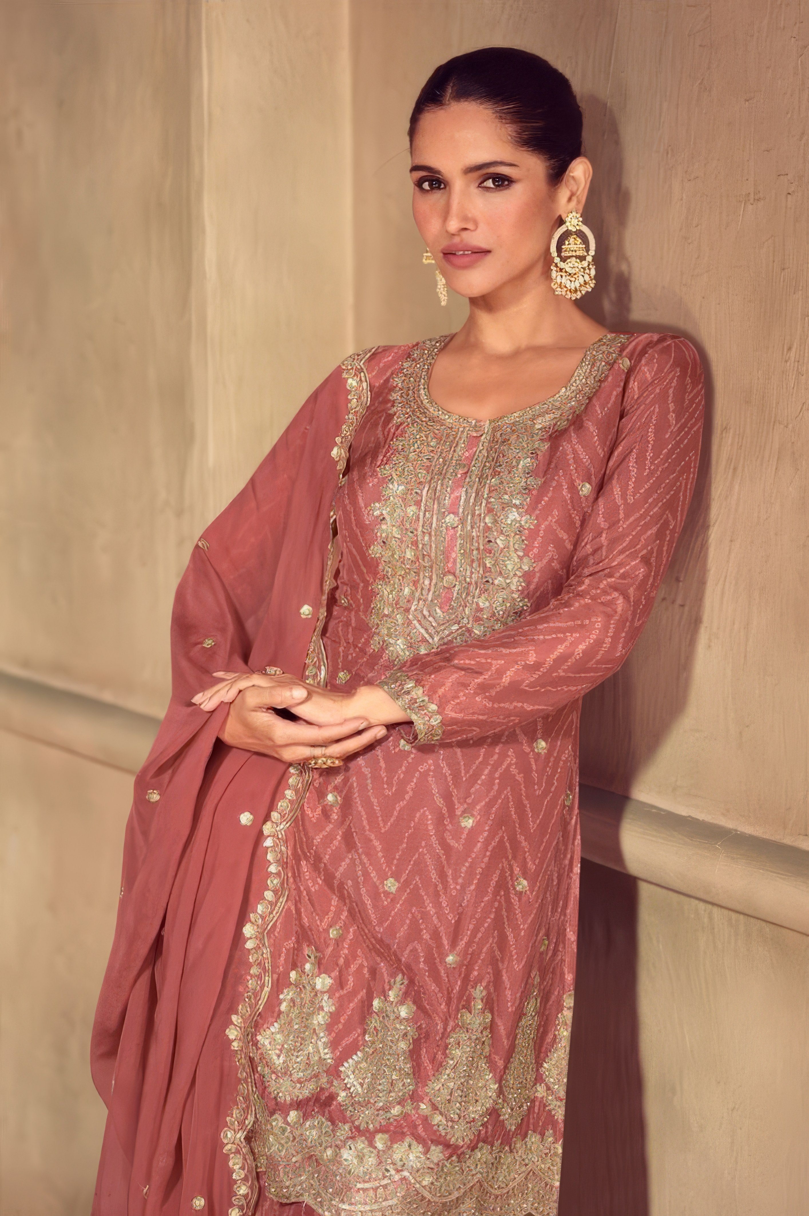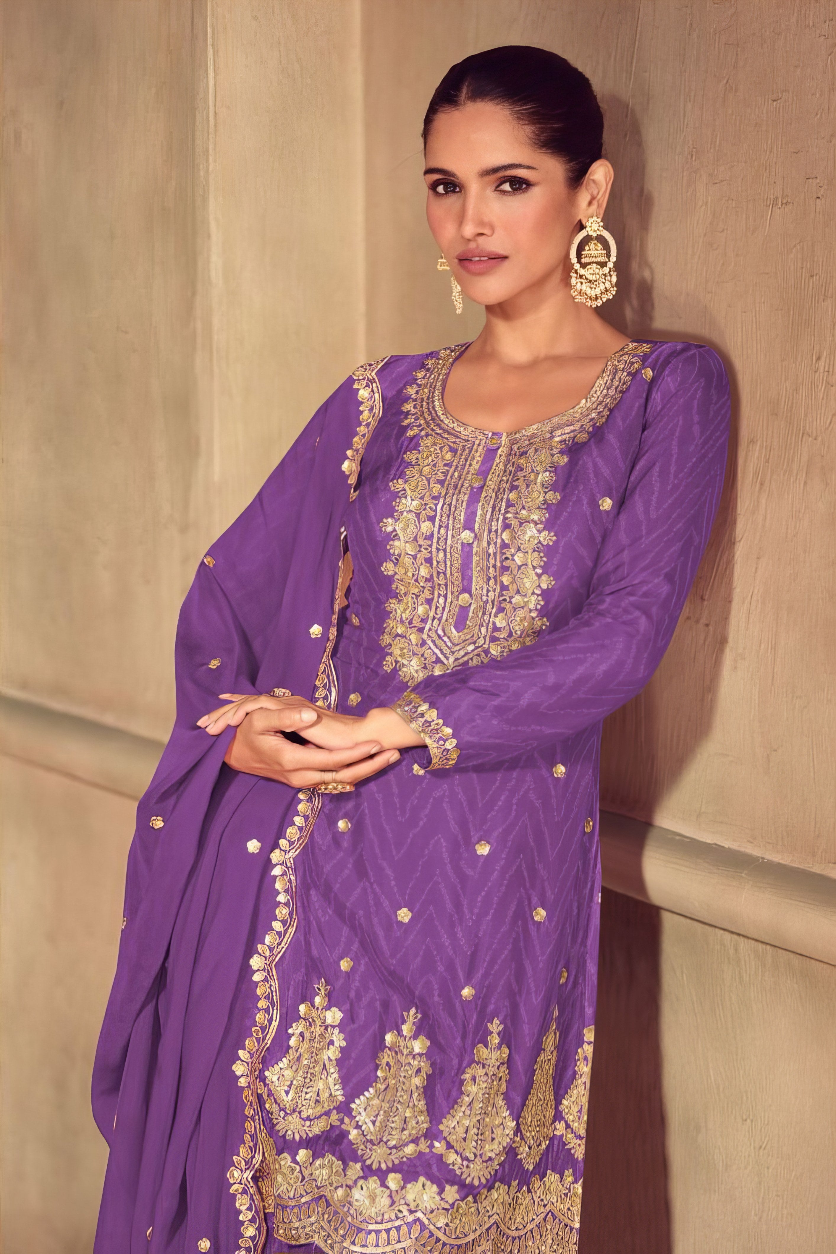 Grace meets grandeur in this beautifully designed Sharara suit, crafted entirely from luxurious premium Chinon silk. The top features a rich, flowing silhouette that drapes effortlessly, offering a soft sheen and elegant fall. Paired with a wide-flared sharara bottom made from the same premium fabric, it brings comfort, volume, and festive flair to your look. The matching Chinon dupatta adds a final layer of elegance, making this ensemble ideal for weddings, festive gatherings, and traditional celebrations. Subtle yet striking, this outfit blends modern sophistication with timeless ethnic charm.